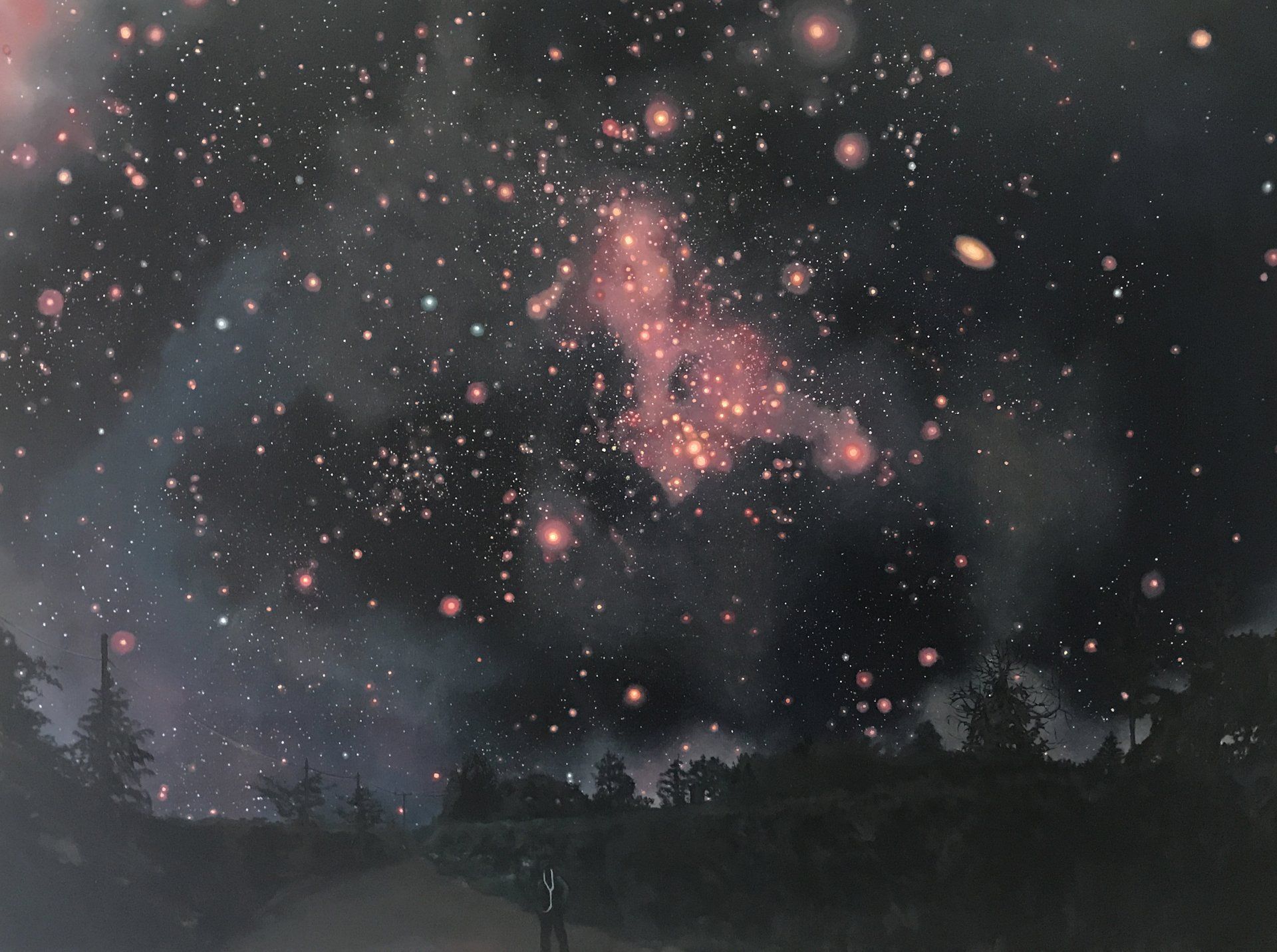 Claire Cansick, All Your Dreams Are Here - Taking a walk became my escape, I loved to do it alone although felt guilty for asking to. Alone I could feel. I live rurally so quickly come to open fields, country lanes and rivers, something I took for granted before and which now healed my neurosis and I really began to see. Appreciating and the night sky was the best therapy; looking beyond my inner world, beyond my surroundings, the virus, the planet and out into pure existence gave me beautiful perspective. Elaborating the night sky entered my work, I’d been dabbling with the stars for a while but now began painting dramatic imagined skies, drawing on Hubble Space Telescope images and placing them above our heads. It is real, it’s up there, look!