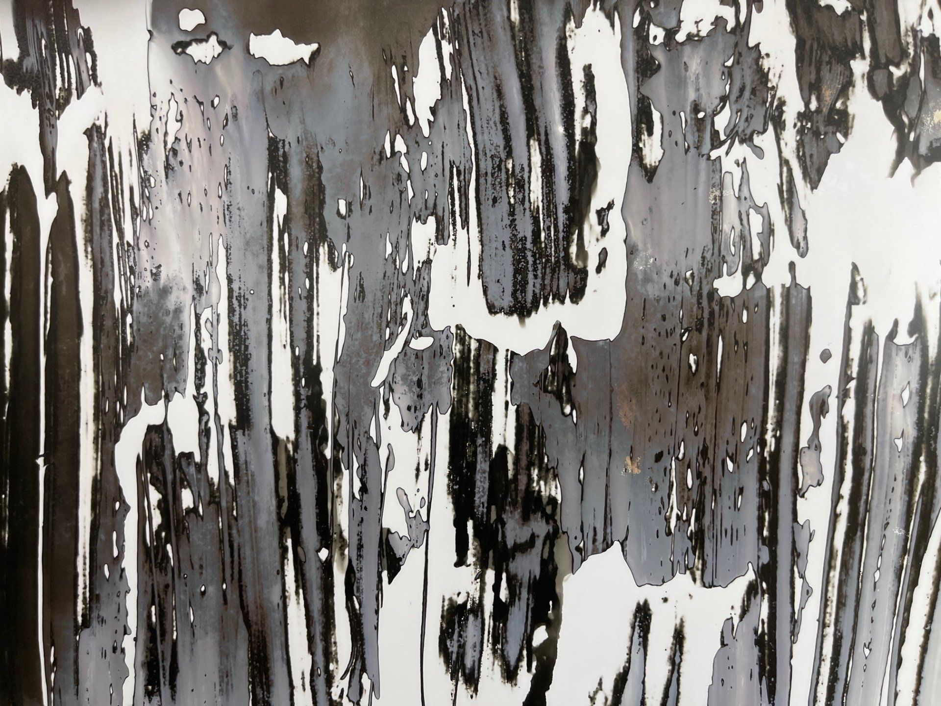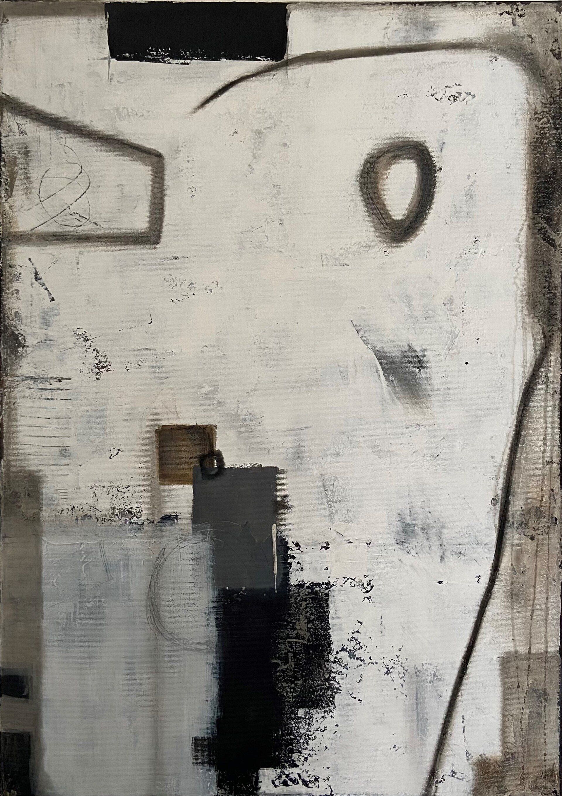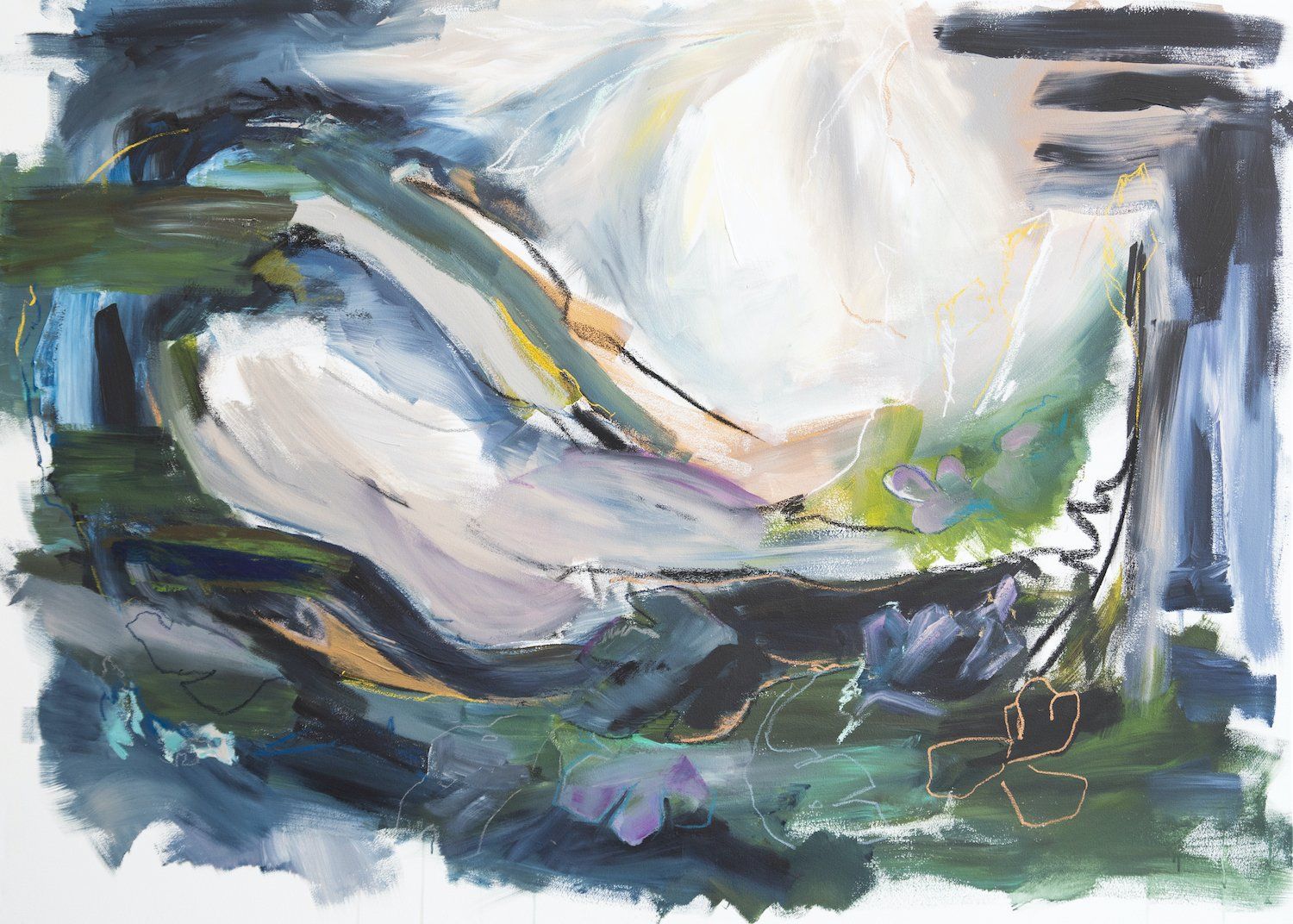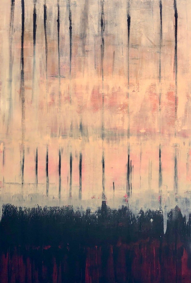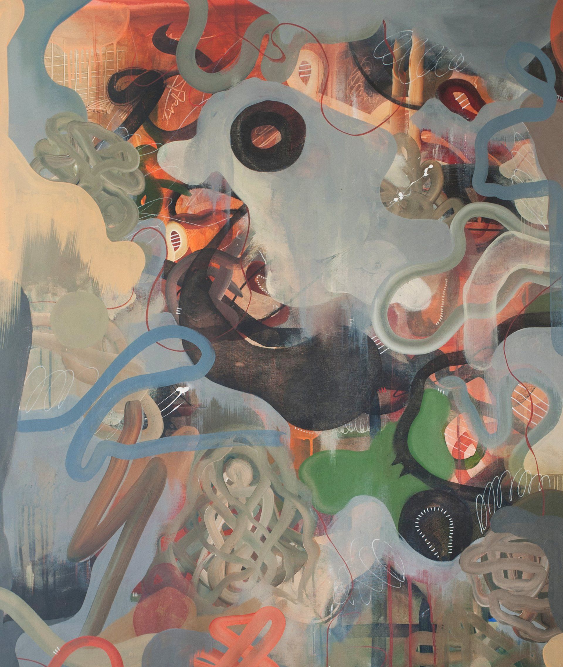 Hannah Thomas, Shackled to Matter (Artwork dimensions: 63 x 39 inches, please note this image has been cropped to fit the template) - This work is from a new project, Absurdist Dreams, and it is both a response to lockdown and a natural progression of ideas for me. Early lockdown paintings were about frustration and confusion, but this work is more layered and a result of focusing on more eternal elements and less on immediate dilemmas and limitations. Ideas of chaos and emotional complexity permeate all my paintings, infused with theories of Absurdism. The marks I use all seek to suggest movement and obfuscated elements in the underlying layers. In this current climate of uncertainty and impatience, my paintings seem to make sense of it all for me, accepting life’s random nature and finding a way to enjoy or at least endure the ‘sturm and drang’ of life.
