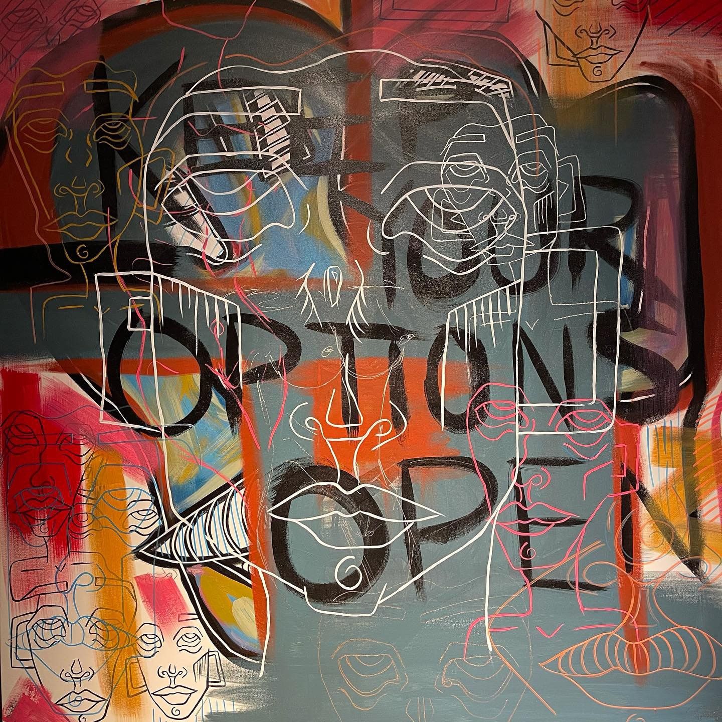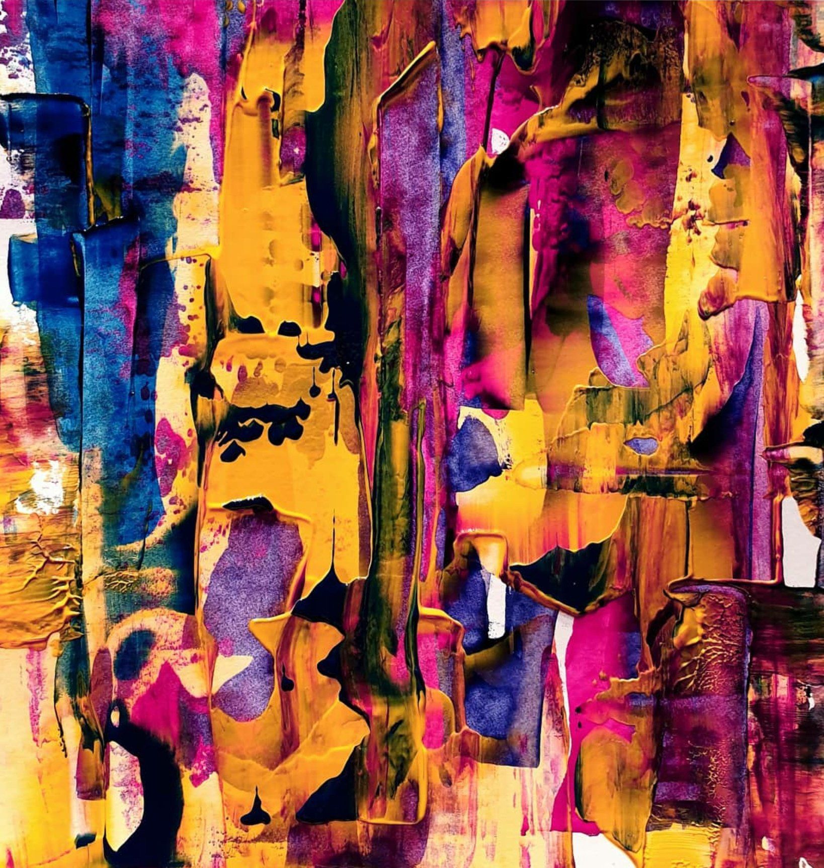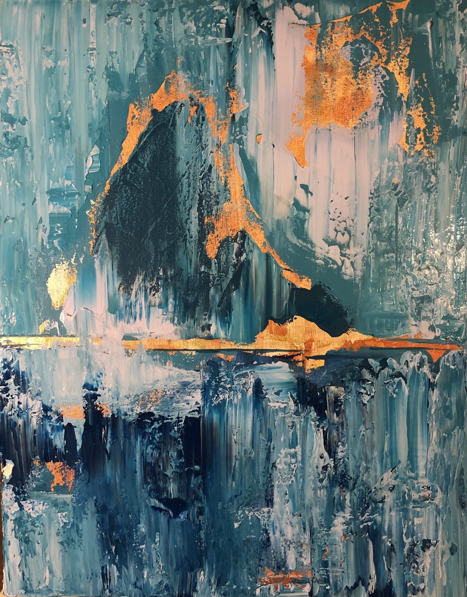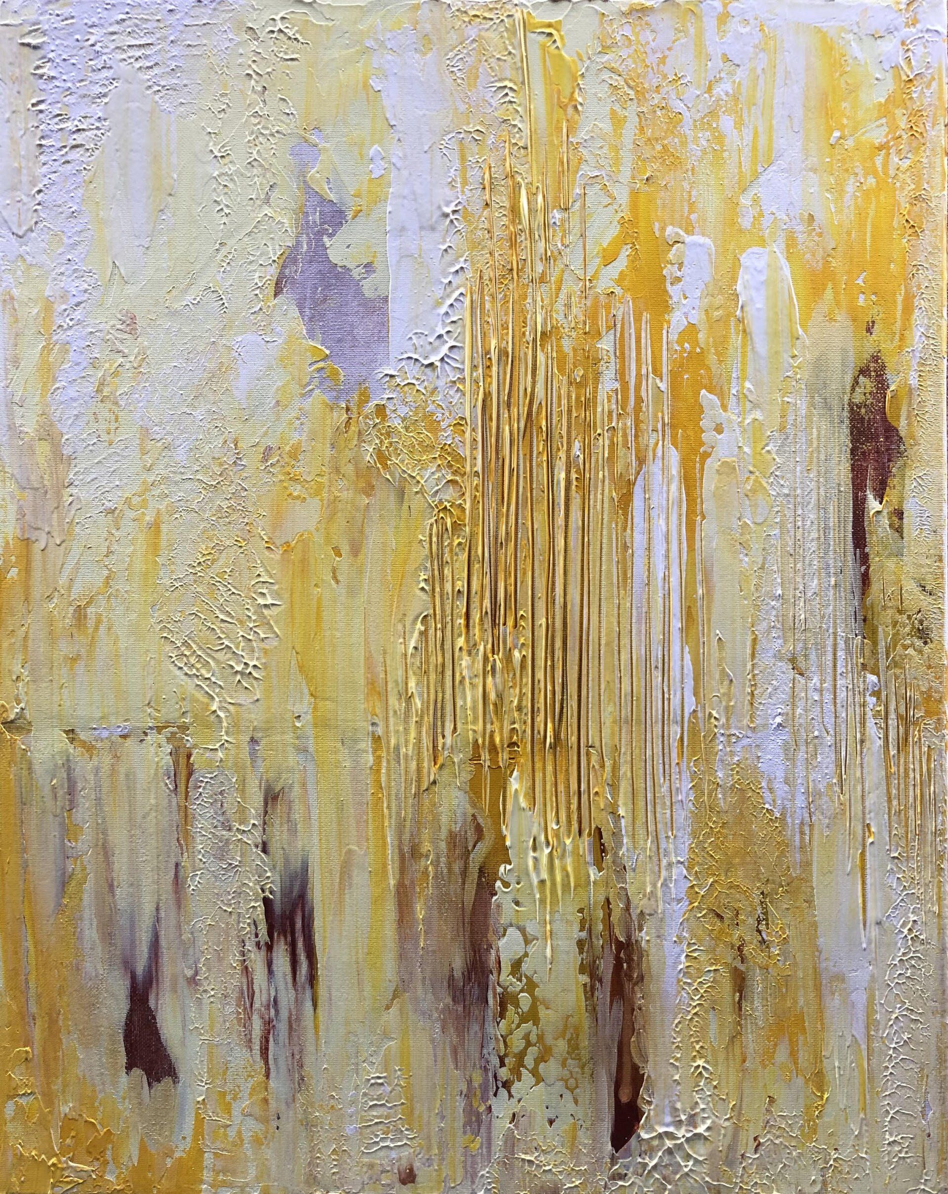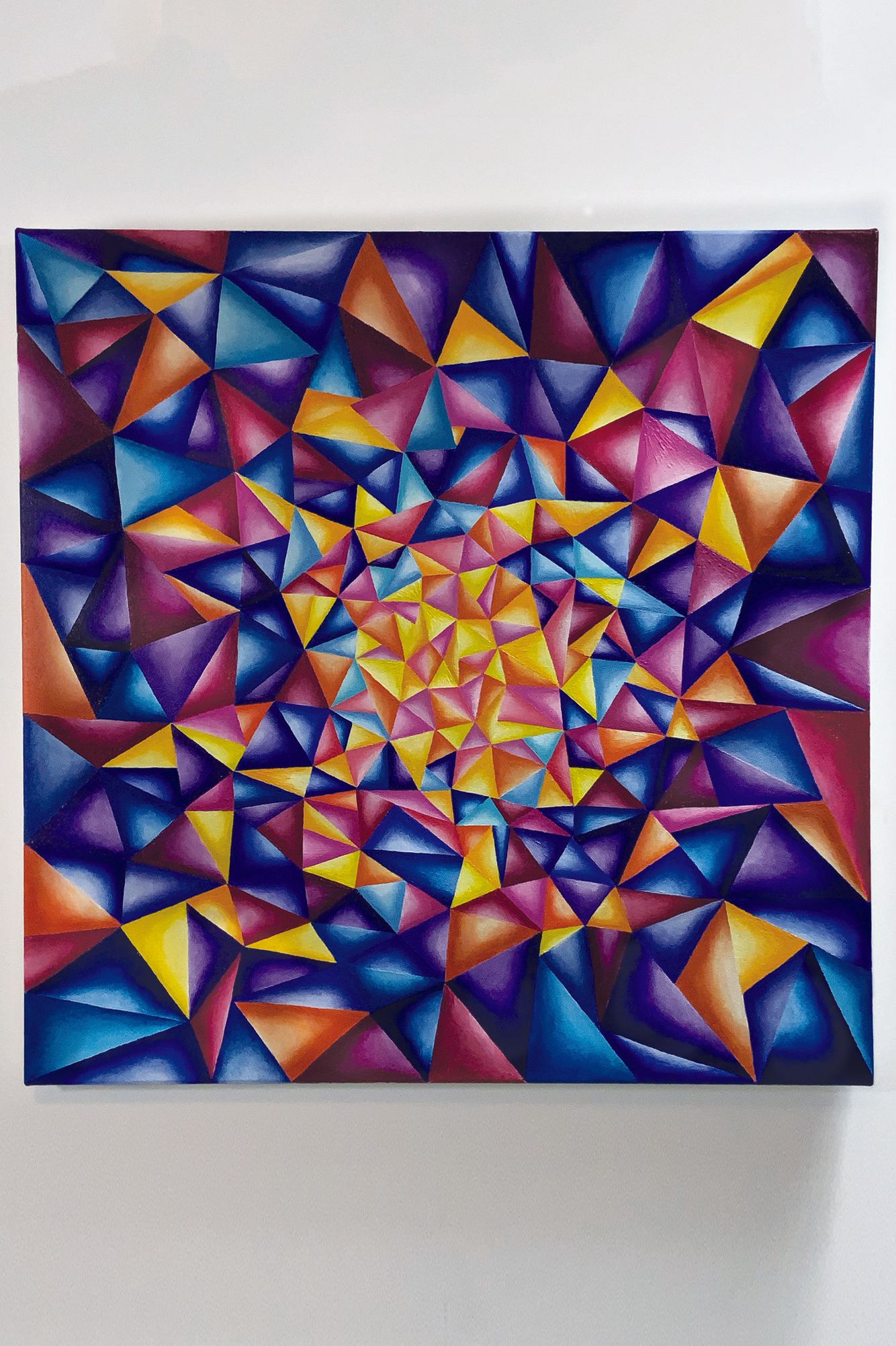 Benny Warsh, Shattered - This abstract piece contains a personal narrative of living with, then overcoming pain, shame, and self-doubt. The overarching themes of this piece are gratitude, fortitude, and personal redemption. People around the world are working individually and collectively, moving through adversity and rising above uncharted waters. This painting is a reflection of the struggle to look for the brightness & stay positive.