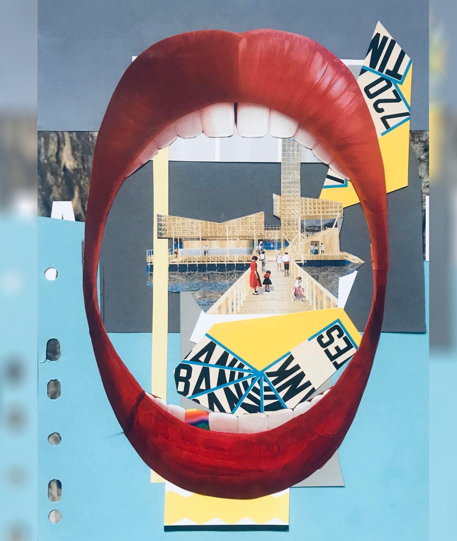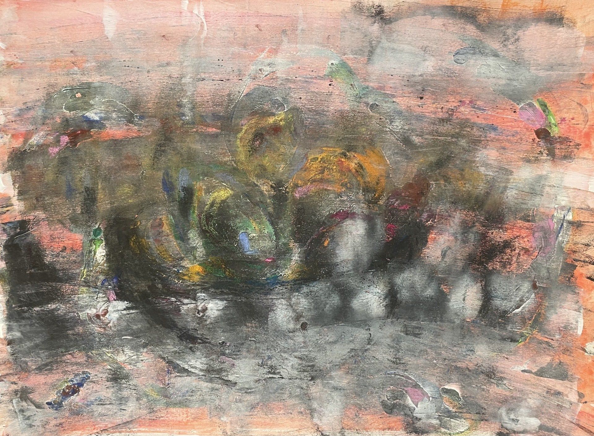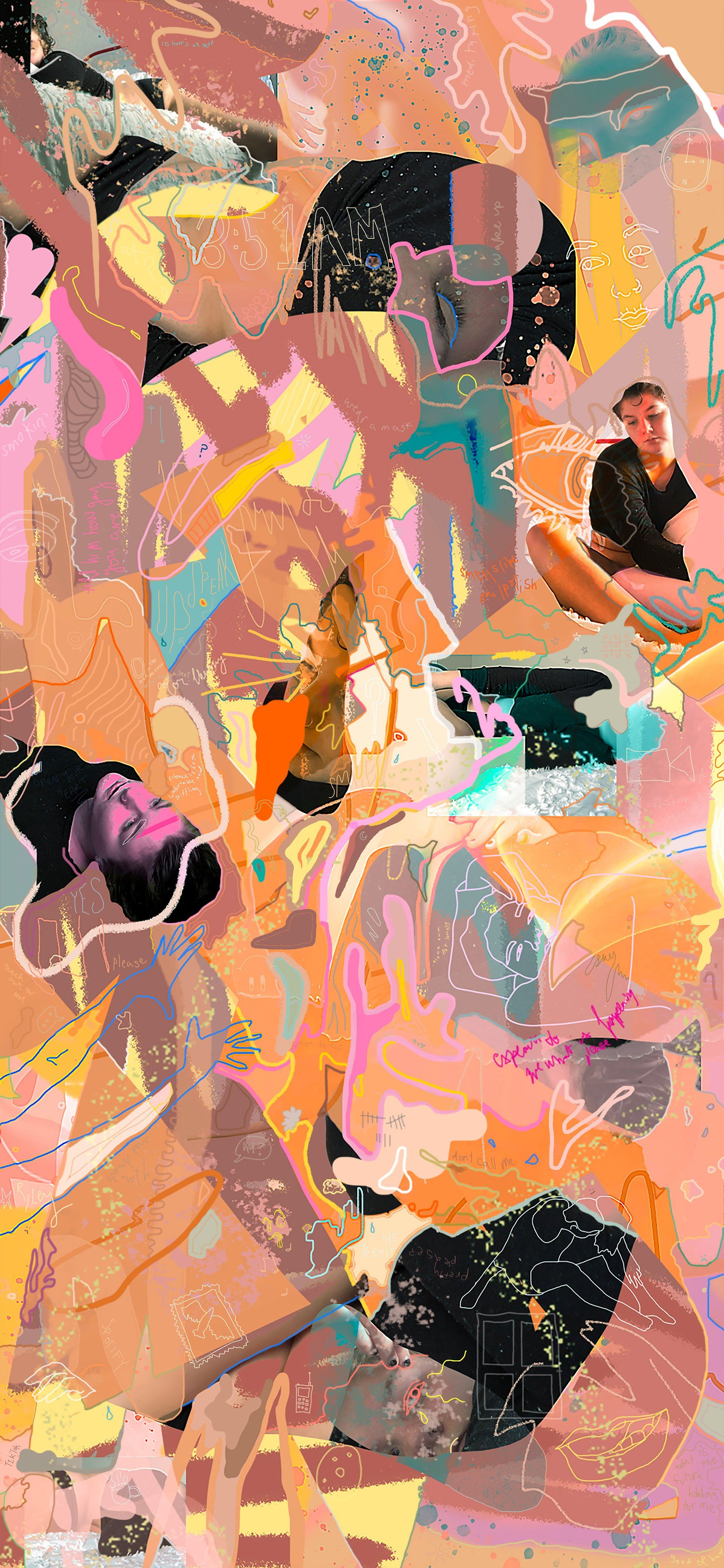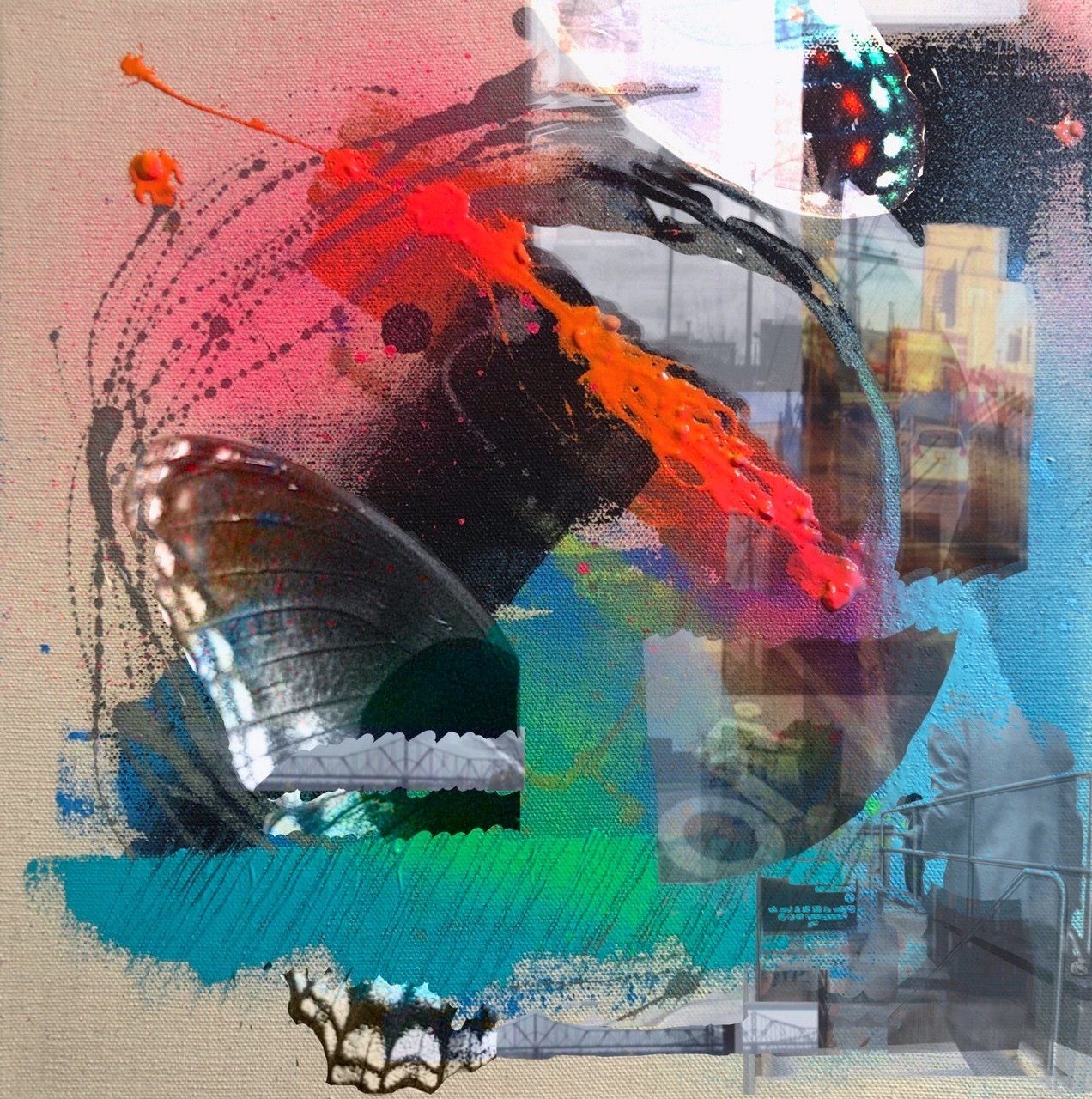 Ashley Brossart - Created during lockdown in 2020 this is a digitally manipulated piece using my abstract paintings created during lockdown and images I had previously collected. The work is about the idea and feeling of being isolated during lockdown with a mind full of memories and nostalgia of past experiences in a city and environment. I thought of the quarantine isolation as a time of potential transformation as if in a cocoon and waiting to emerge in the future.