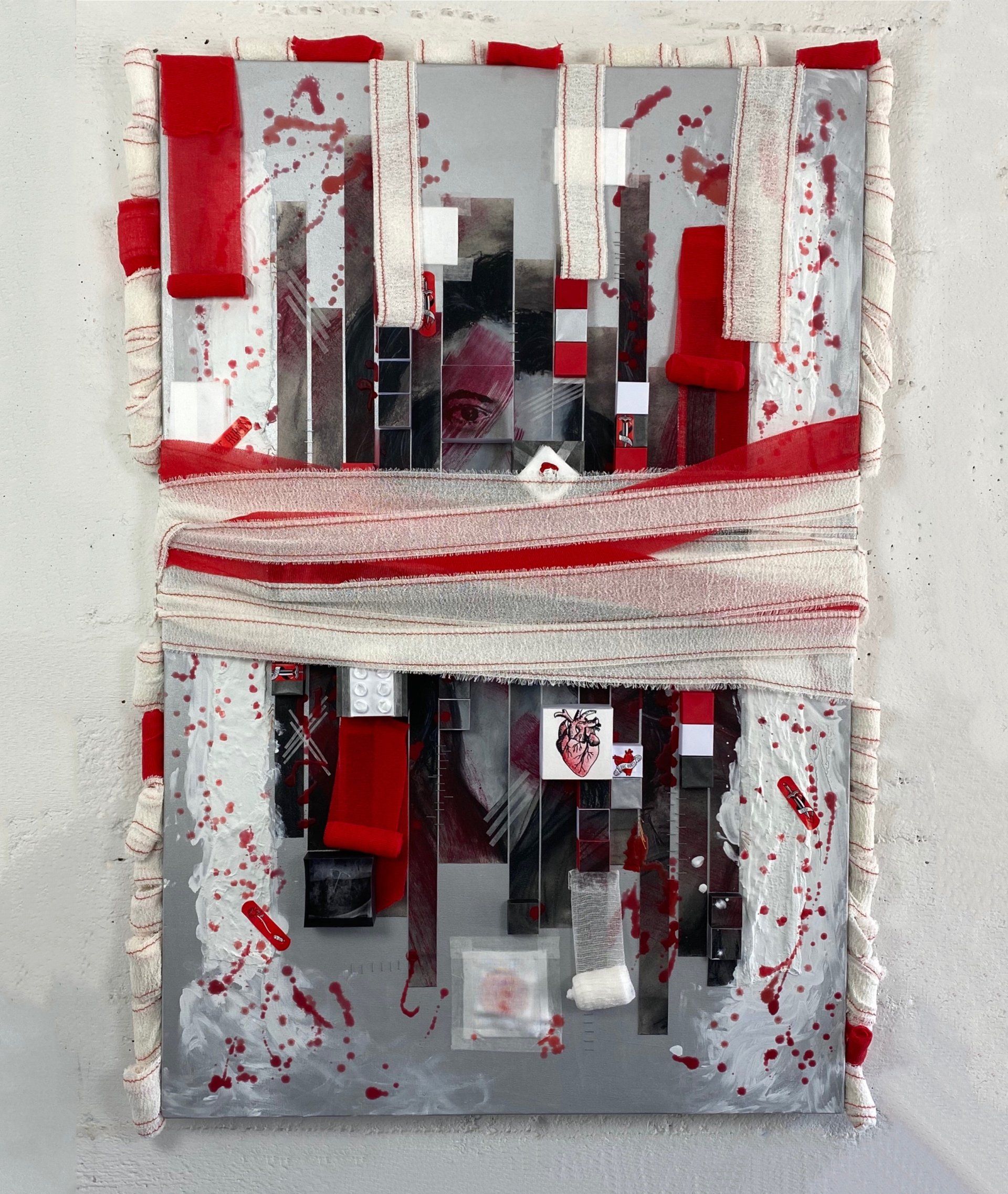 Sève Favre, Self Intervariactif Portrait - Very marked of the hyper-medicalisation of our daily life that resulted from covid, and which made the individual story resonate with the global story. I looked at my own medical history through this interactive self-portrait. This self-portrait on canvas is transformable and evolutionary. It can be installed to reveal different states. It thus becomes a “tableau clinique”, according to the medical term in french. Dissected, stapled, sutured, broken, x-rayed, bandaged, wounded, plastered, pricked, bled, operated, isolated, medicated, treated, tested, vaccinated: The disease has taken shape, my body is medicalised by the doctors : Clinical case in a clinical environment. The transformation of the painting is possible by touching it, thus subjecting it to the risk of being “wounded/contaminated” by the person who intervenes to reveal its possibilities and thus make it live.