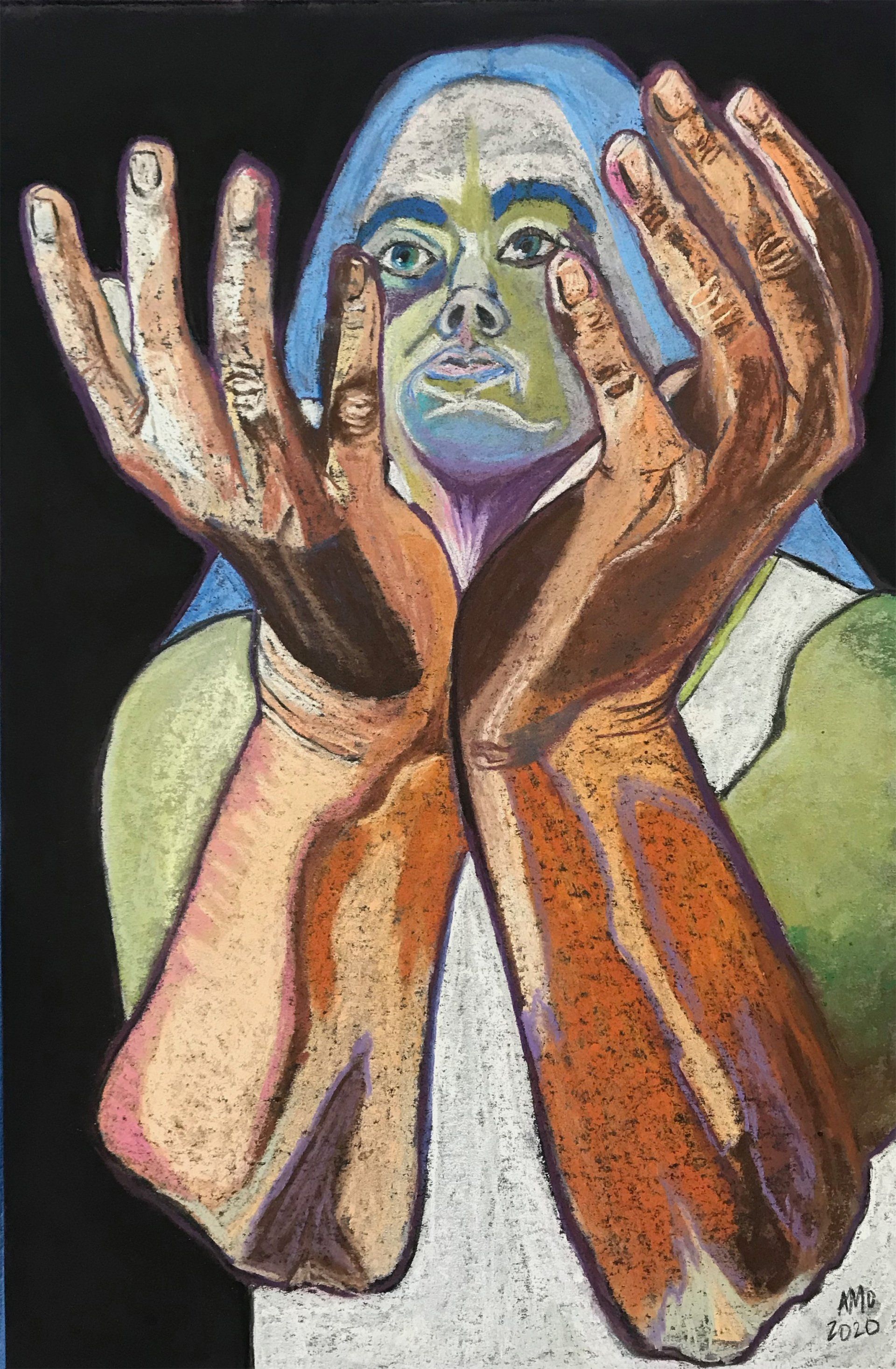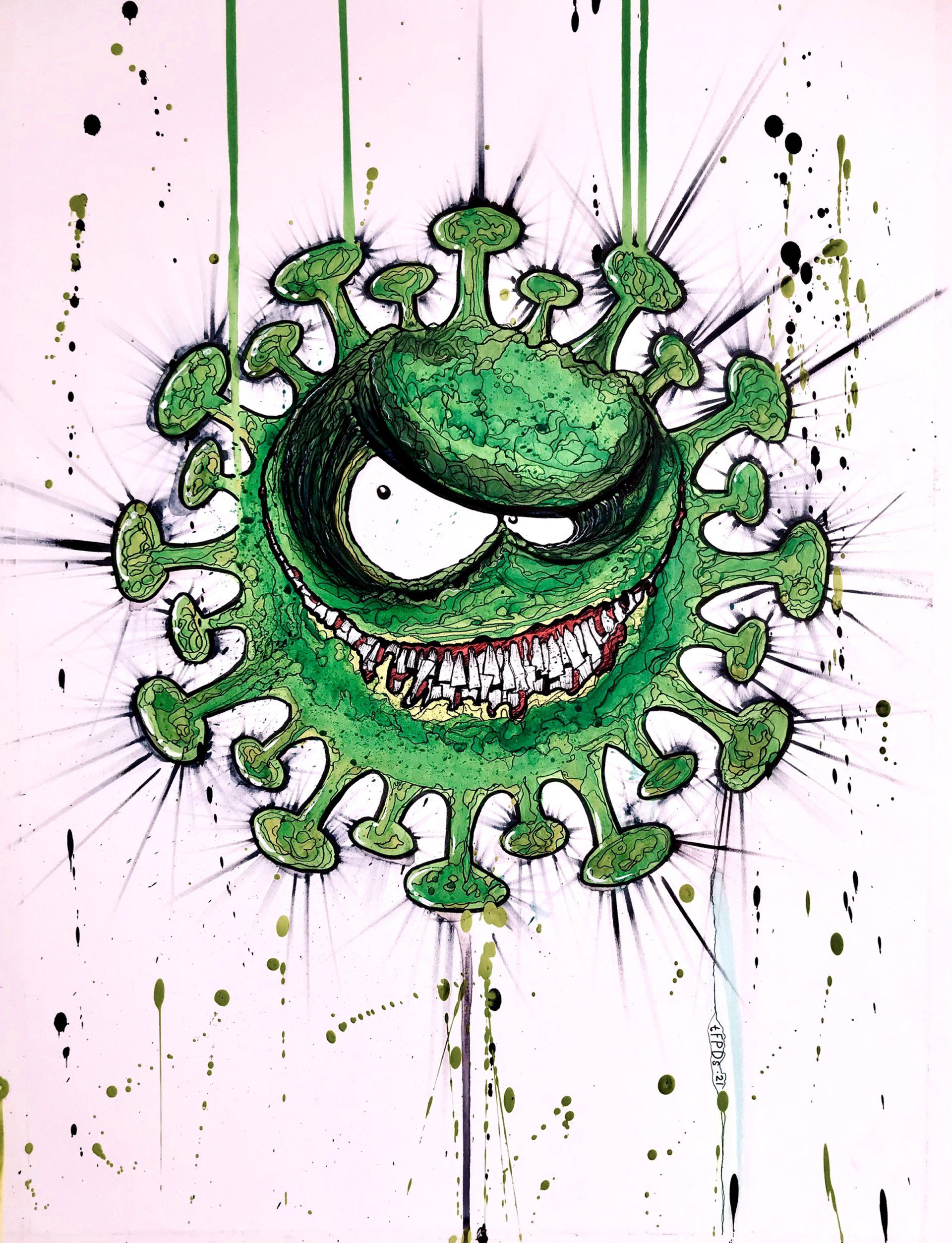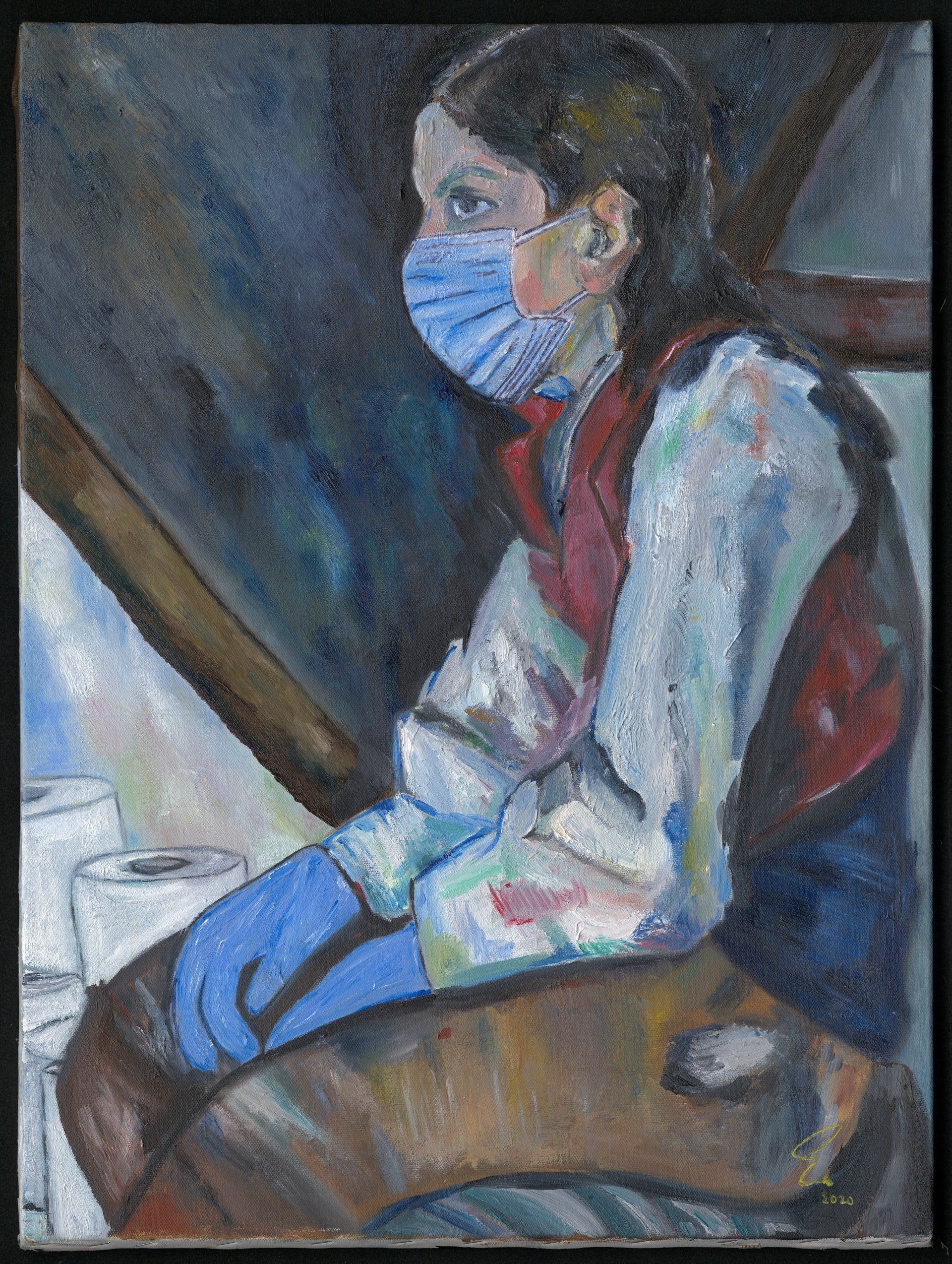 Jessie Novik, Corona Crunch - Before the lockdown, I hadn’t used oils in many years. I hadn’t had time or space for long-term personal projects that didn’t guarantee income. I started painting murals on my walls but eventually ran out of wall space. Shortly after I lost my job in August, my beloved Grandfather passed away, leaving me his old set of oils. In his honor, I rearranged my apartment to safely accommodate oil painting and I set out to make a series of paintings uniquely specific to this time. This cute and creepy little portrait represents the chaos and terror of 2020. I don’t have kids, but when I think about raising them now, this is the feeling that comes up. Kudos to all those parents making it through!