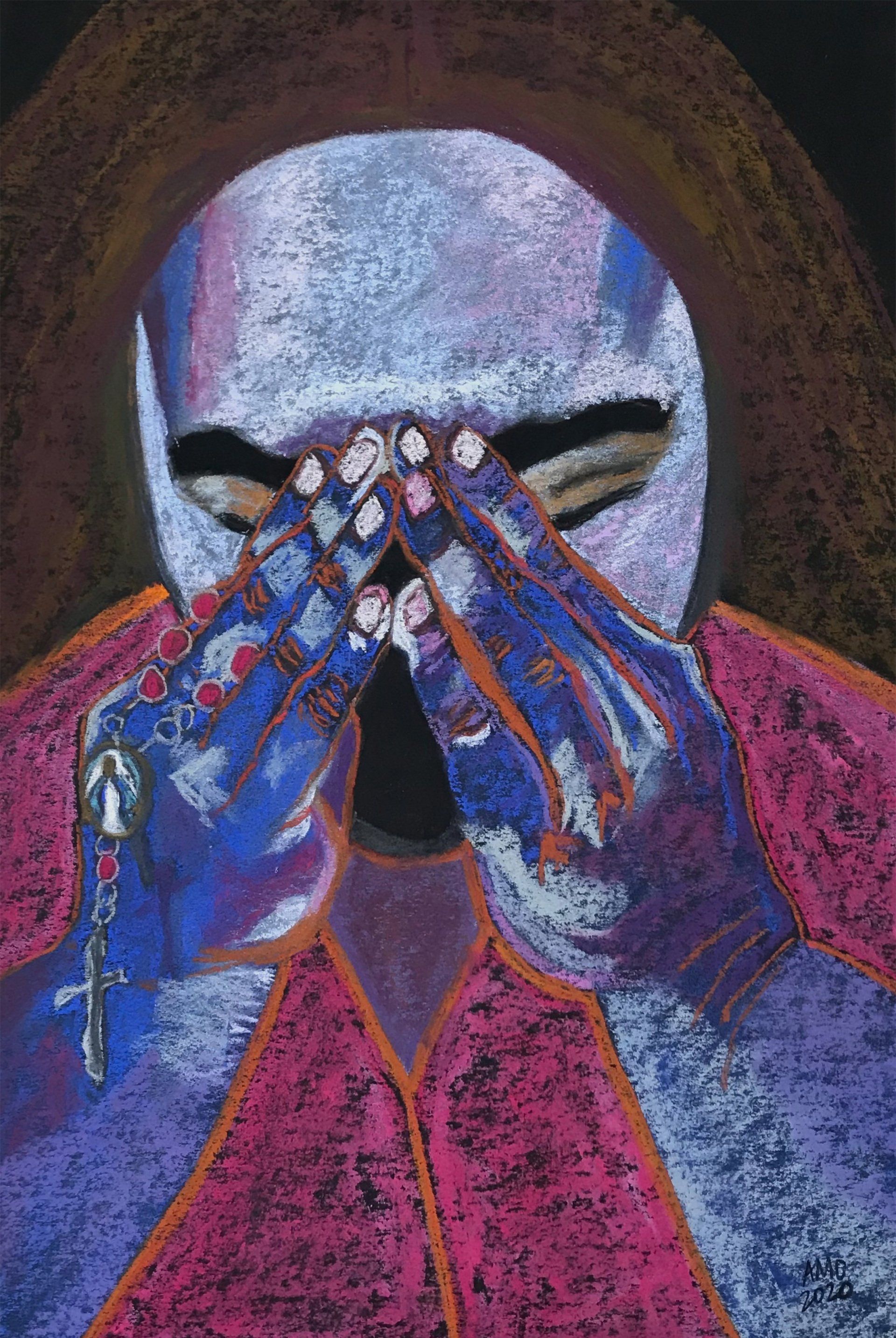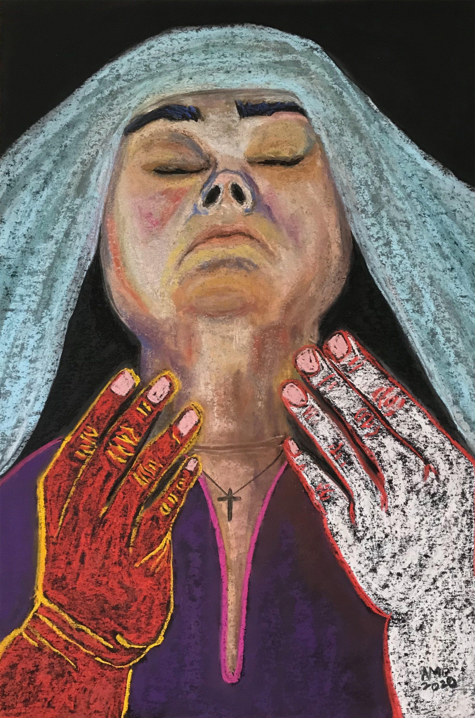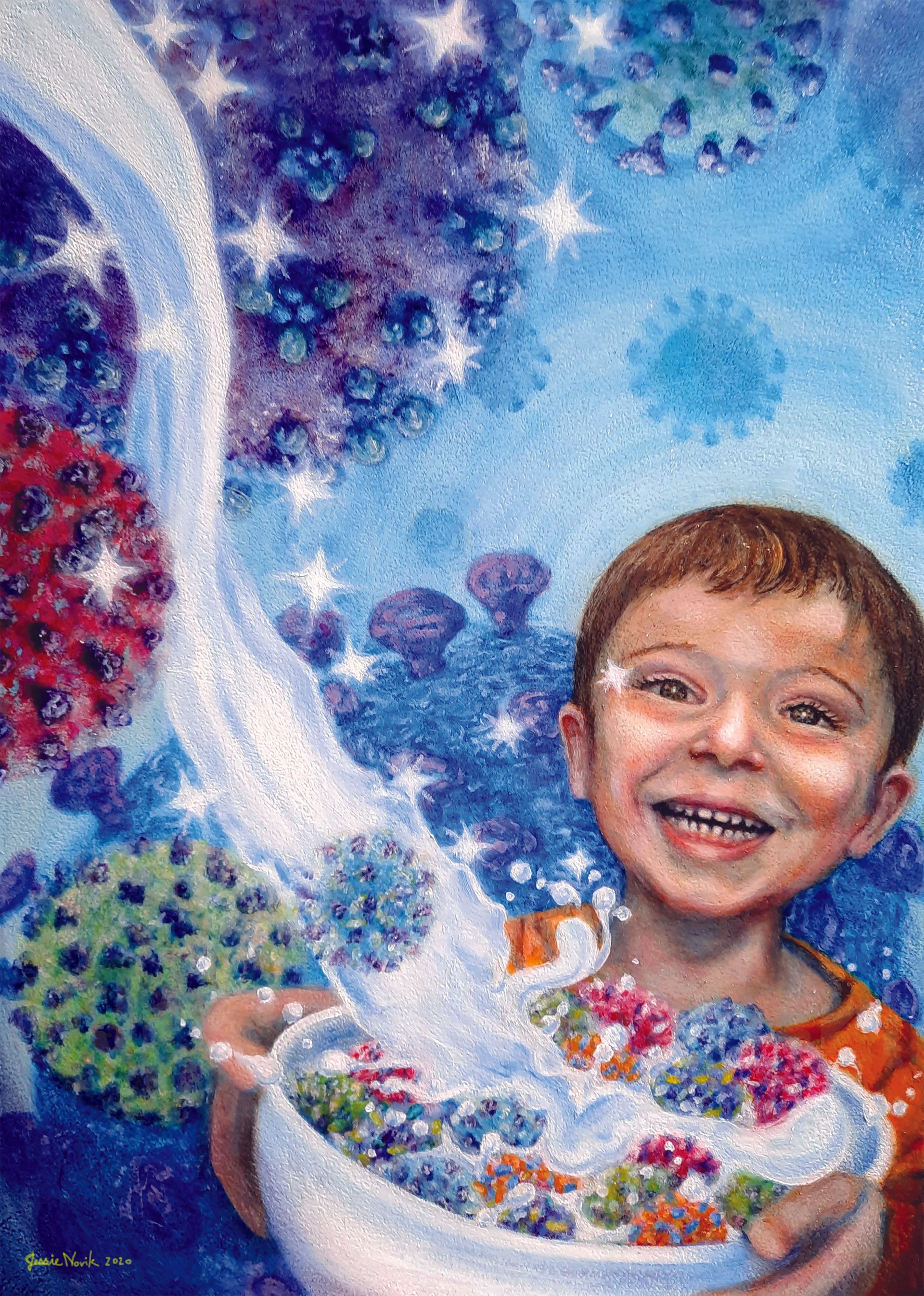 Jessie Novik, Corona Crunch - Before the lockdown, I hadn’t used oils in many years. I hadn’t had time or space for long-term personal projects that didn’t guarantee income. I started painting murals on my walls but eventually ran out of wall space. Shortly after I lost my job in August, my beloved Grandfather passed away, leaving me his old set of oils. In his honor, I rearranged my apartment to safely accommodate oil painting and I set out to make a series of paintings uniquely specific to this time. This cute and creepy little portrait represents the chaos and terror of 2020. I don’t have kids, but when I think about raising them now, this is the feeling that comes up. Kudos to all those parents making it through!