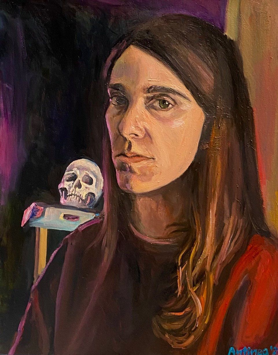 Angeliki Boletsi, Self Portrait with skull - My perception of the outside world is always accompanied by feelings. I cannot switch them off even if I really want to. In this self portrait I look serious and melancholic and calm. However behind this predictable representation there is a play of emotions. My artworks are like a diary where I share my inner world and feelings. My paintings are where Fantasy meets with reality. The Skull symbolises the dark side of the soul which is what we are being called upon to explore now with COVID-19. All our hidden, inner, deep fears and suppressed emotions are triggered and shaken. The skull is the gate to the underworld. I try to remain calm and solemn, but inside me there is a vast abyss that awaits for my initiation. In the darkness there is also Light...
