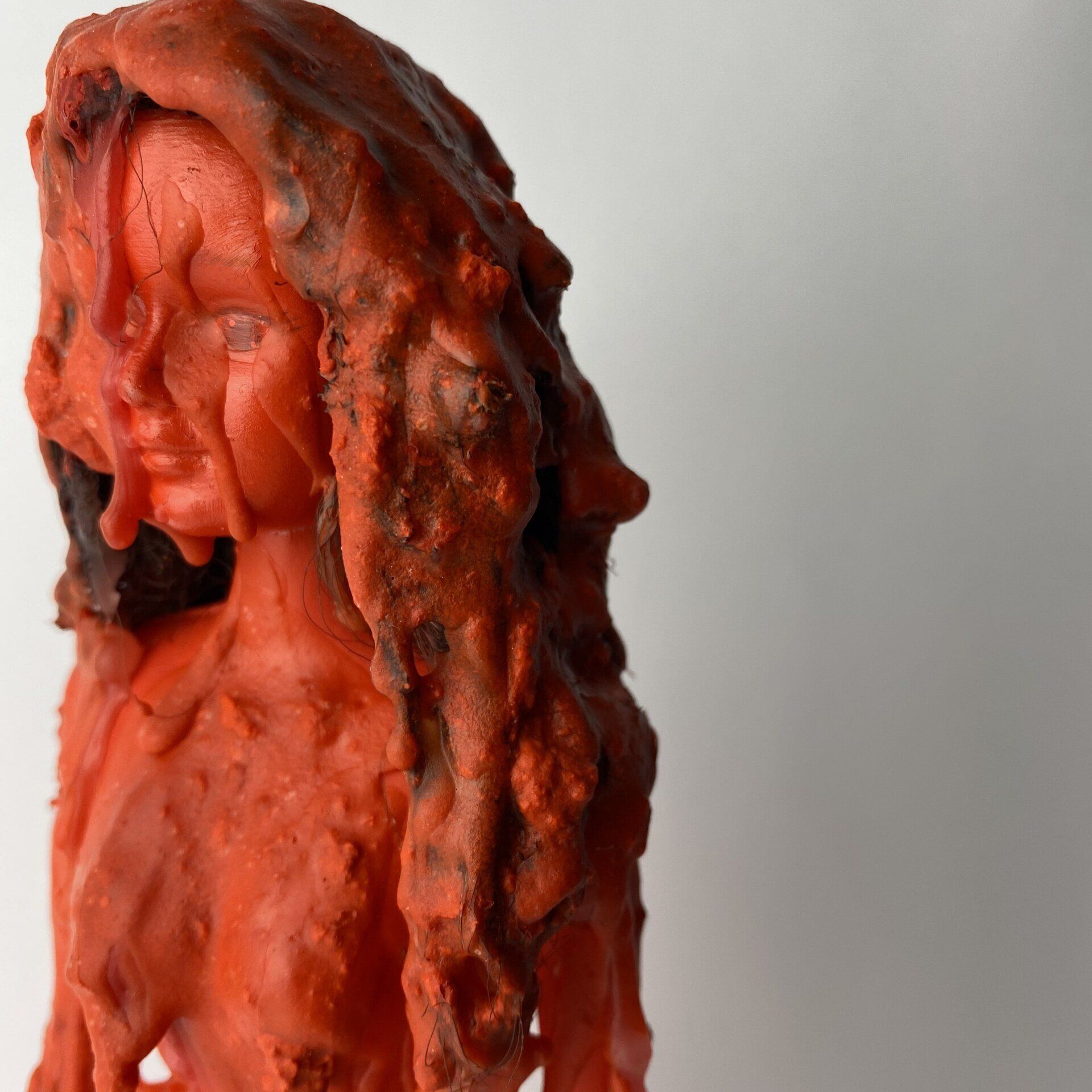The central core of the sculpture responds to the crippling demands on women and girls to conform to a very unrealistic and unhealthy ideal. Engulfing and enveloping the impossible-to-reach figure proportions is a suffocating and debilitating straitjacket-like casing representing the claustrophobia and compulsory constraints inflicted by the virus.