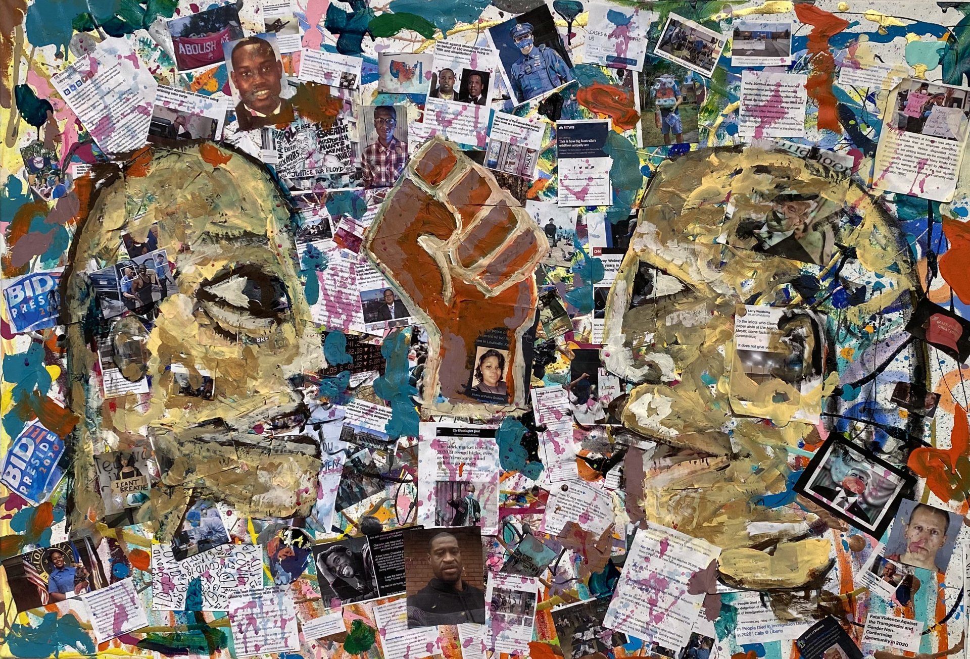 Tiffany Medina Thomas, Noise - With 2020 being the center of so many movements and social justice issues, I wanted to reflect the good and bad we experienced. As the house battled, (the two heads), the streets battled and most united. We learned to stand up in the chaos, remembering those who lost life all during a pandemic. The Noise was loud, but I found more of who I am in it. This piece is my expression on all the social issues, the presidential race, the pandemic and the uncertainty I felt because of the issues we experienced. This pushed me to face problems head on when most of them are not easy to talk about. I wanted this piece to force people to see and notice them as well, a reminder that these things happened. That there is still a fight ahead of us. The noise rang down, and we couldn’t and still cannot escape the changes that are necessary. This piece was in reach studios exhibition “Reflecting Our Virtual Voices” at Redline Contemporary Art.
