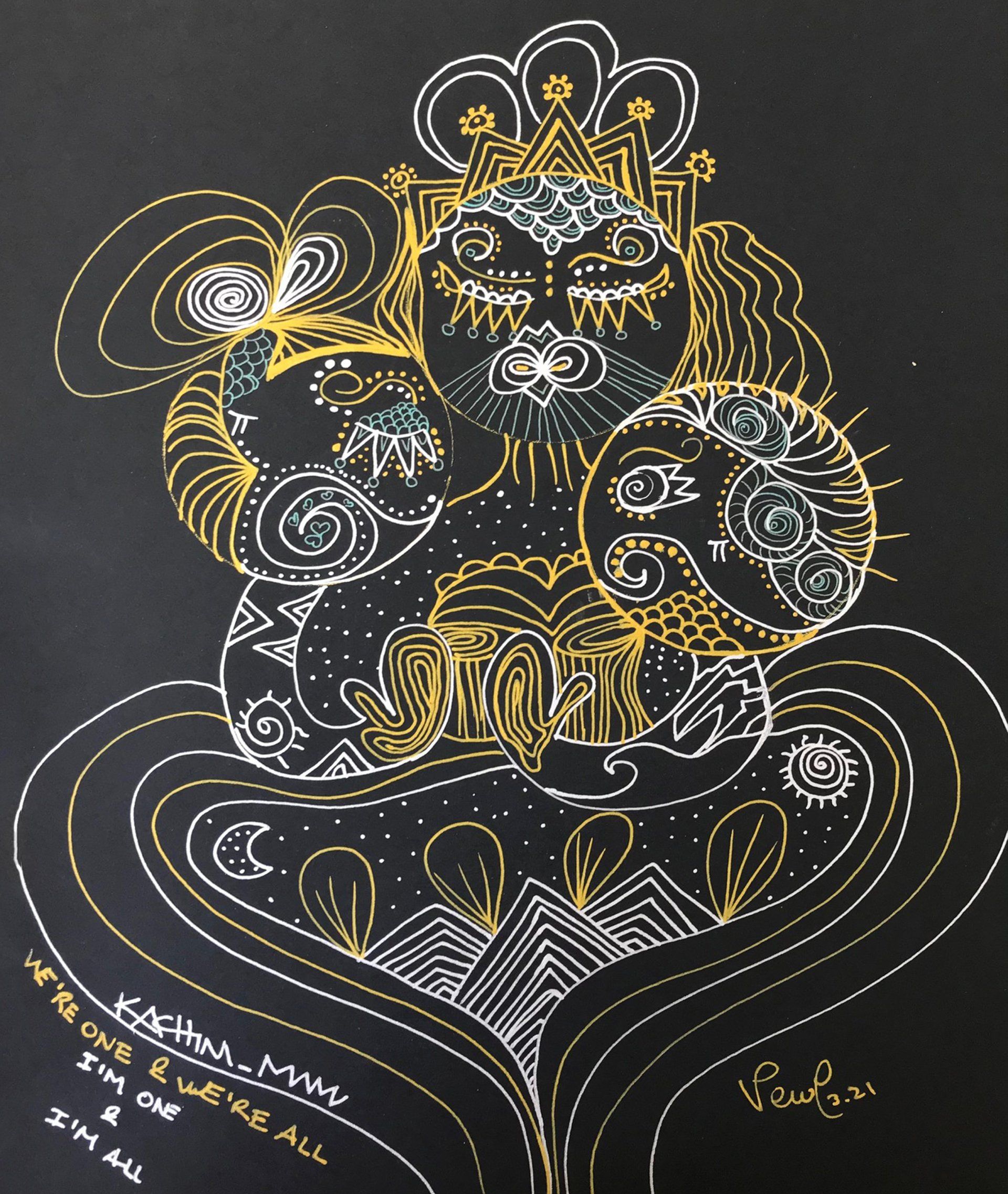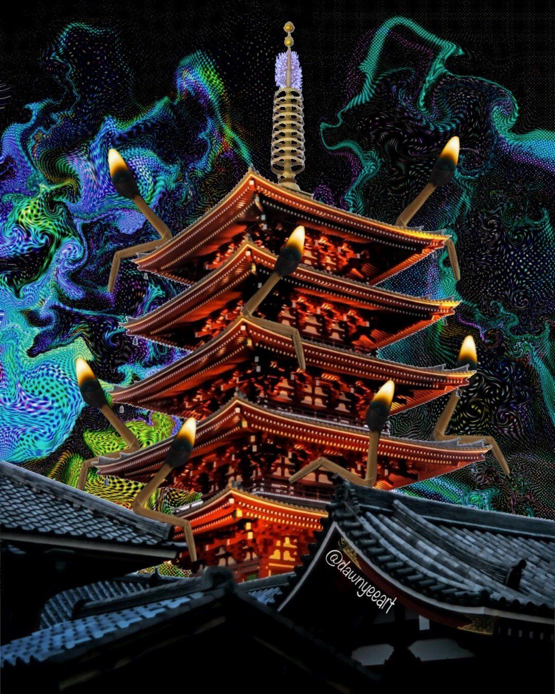 Dawn Yee, Trippy Temple - In this time of Covid, I was lost. I didn’t know what to do with my time. I had been so busy with working and lackluster relationships, but in quarantine, those things disappeared. I was with myself all the time with nothing to do and that’s where my dormant creativity sprouted after 8 years. I began to create the work I’ve always wanted to, surreal, psychedelic, spiritual. When I create, I find myself and that has been the greatest gift. This piece, titled Trippy Temple, embodies how I feel in this time: away from others yet we are all on the same journey of self discovery, burning brightly in the sea of life.