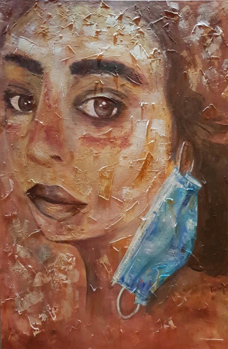 Sherine Nazmy, Devotion, 130 x 90cm. Acrylic & mixed media on canvas - To honor all front-liners during the challenging time of the COVID-19. I was inspired by my parents who are in the medical field - a general surgeon father and a pharmacist mother. Despite the danger due to the pandemic, they have been and still are very much persistent to do all what it takes to lead their medical crews by example and provide medical support and advice 24x7 to those in-need. I’m sincerely honored to be their daughter. May God bless all our loved ones and front-liners across the globe.