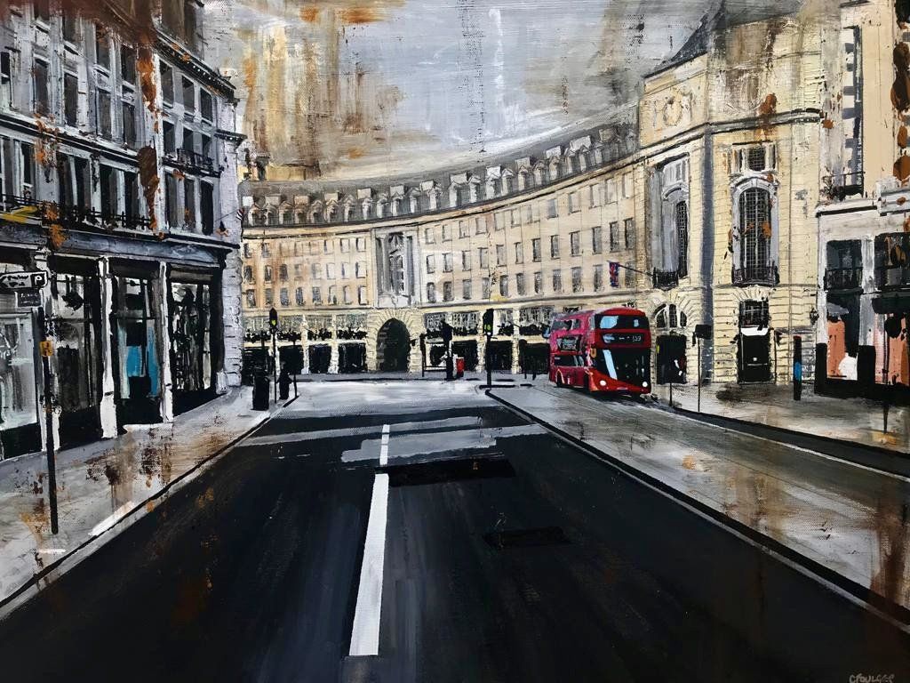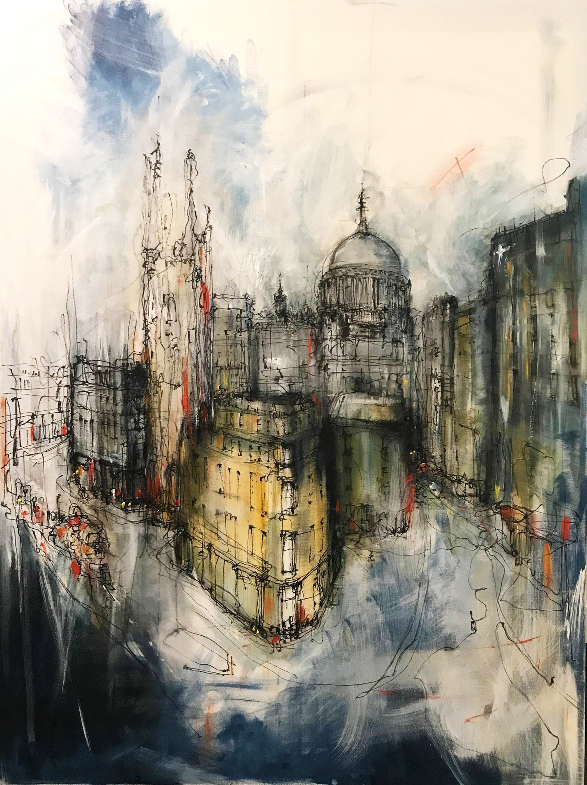 Neil Whitehead, Dystopian London - A 1.2m large acrylic canvas depicting my vision of a Covid ravaged London. The city I grew up in, the city I craved through 3 lockdowns. A dystopian landscape symbolised by the ever present St.Pauls. A symbol of hope through WW2 and 2020. Covid ripped through the fabric of everybody’s life. Losing loved ones and putting an end to the normality we didn’t realise we craved. My work has always been based around ‘plein air’ sketching and painting - working from the landscape and feeding off the life force around cities and towns. When I couldn’t go outside and paint the architecture around me, I was crippled as an artist .This piece was an isolated creation at home throughout the summer and Autumn of 2020, inspired from the dozens of London city sketches and from the raw emotion of lockdown. Dark and scary but with glimmers of hope emerging, this painting grew from a cityscape into a deconstructed twist of architecture and emotion.