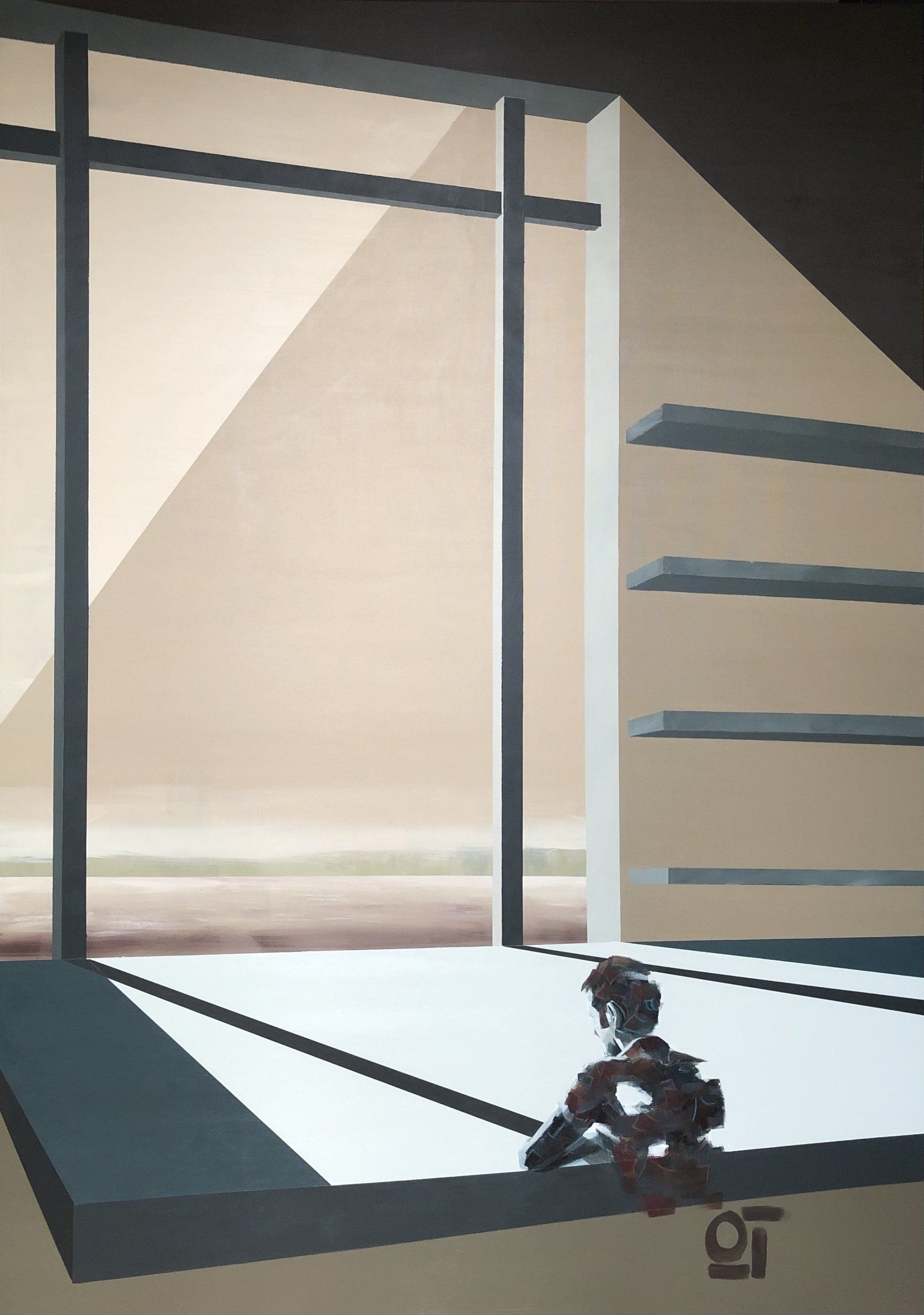 Quentin Trutti, Contagion - Covid19 has been a vector of isolation. “Contagion” is a surrealist artwork that shows the human being face to the infinity of the world. Perspective is over represented with big table and window, shadows, shelves and the character seems to be very small, alone and static in order to highlight the isolation effect. It seems as a prisoner or a ghost face to the world, as he was in jail waiting for better days. The chiaroscuro, geometric and minimalism shape, perspective and the unfinished character give a sensation of a dream (nightmare). A big time to think about our mankind conditions…