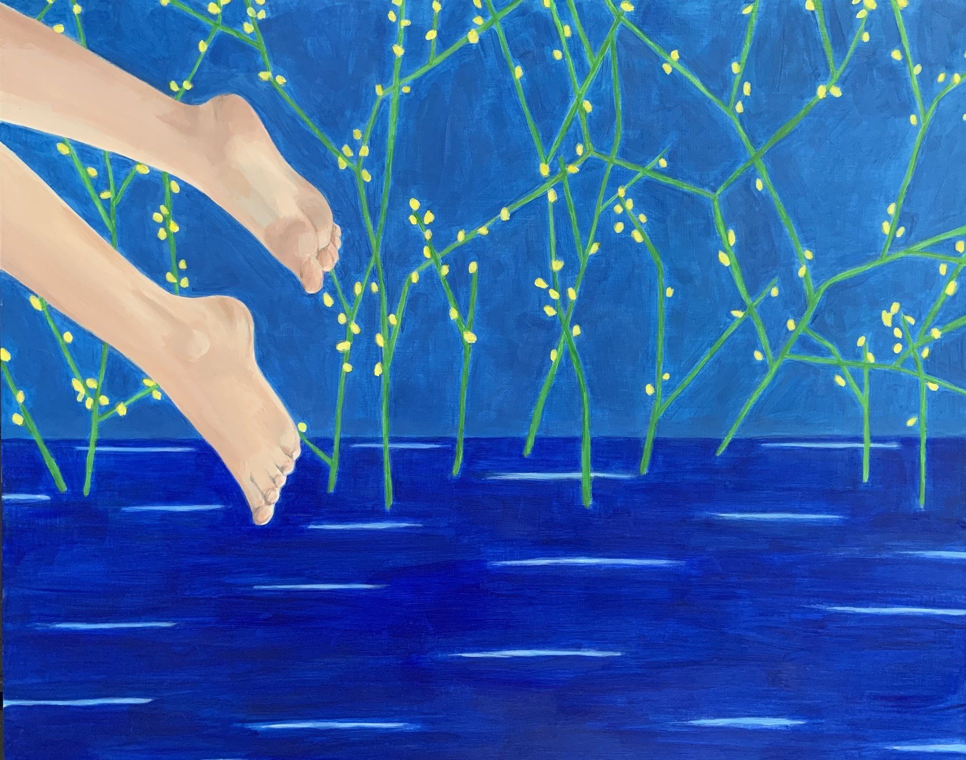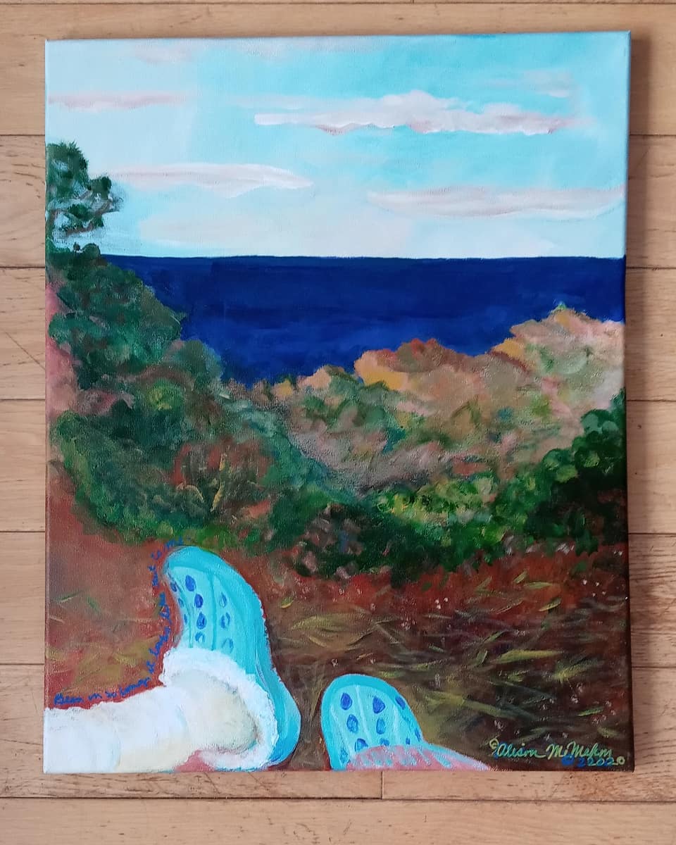 Alison McMahon, Been In So Long It Looks Like Out to Me - This painting is of a dream I had early AM 1st April. I dreamt I was on my first run since being #saferathome. I looked around for my group (Hash House Harriers) and the trail and down at my shoes. I’d been in so long I’d showed up in my step outside/gardening shoes. I decided not to go back for my running shoes but do the trail anyway, and woke up, laughing. I had to paint it because it was such a clear sight, like a snapshot, looking at my feet. It was also a chance to paint a dream from my p.o.v., from inside my head and not observing. Story is written around the sides of the canvas. It’s a simple painting that took a lot of time, looking & figuring. I’m very pleased with it.