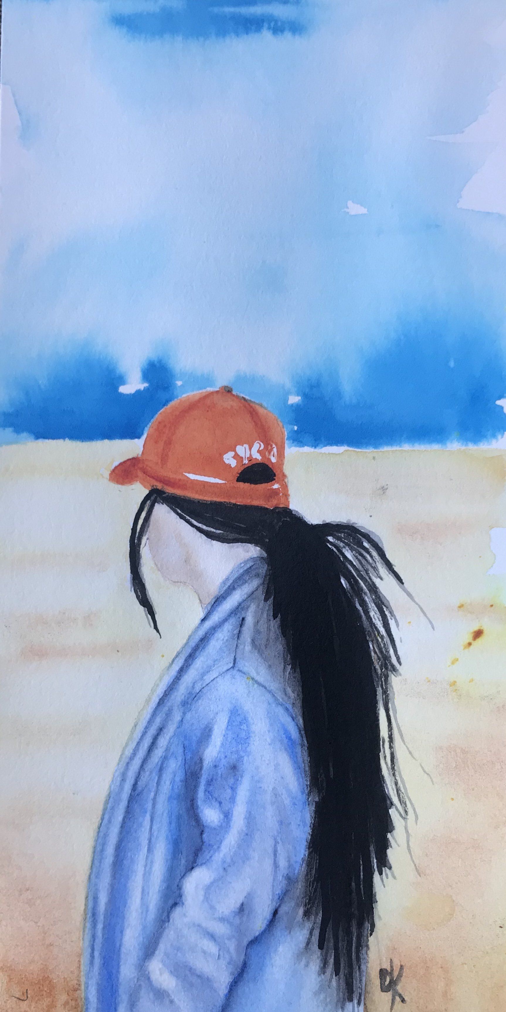 Deb Knowlson, Looking Forward, Looking Back - Here is a young woman gazing out to sea on what would otherwise be a fine, sunny day. During Covid-19; however, she might be isolated, experienced job loss, subject to more hardship, and driven to poverty. The informal economy comprising domestic workers and similar work dried up while women shouldered an extreme burden of unpaid caregiving and educating children. While in isolation, I empathized with women all over the world whose lives were interrupted and made difficult by the pandemic. Many of them will not recover easily even when the pandemic is resolved.