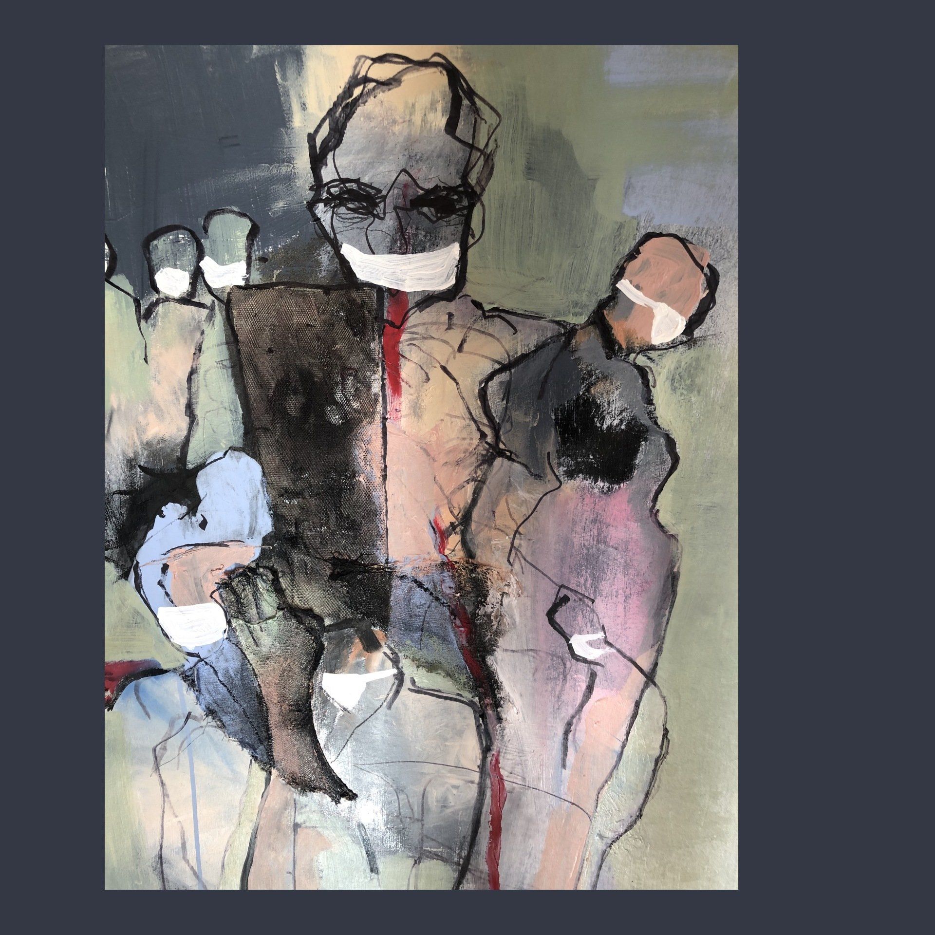 Jo Scorah, Covid 2020, 80x55cm framed mixed media - Getting accustomed to a new way of life -the wearing of masks