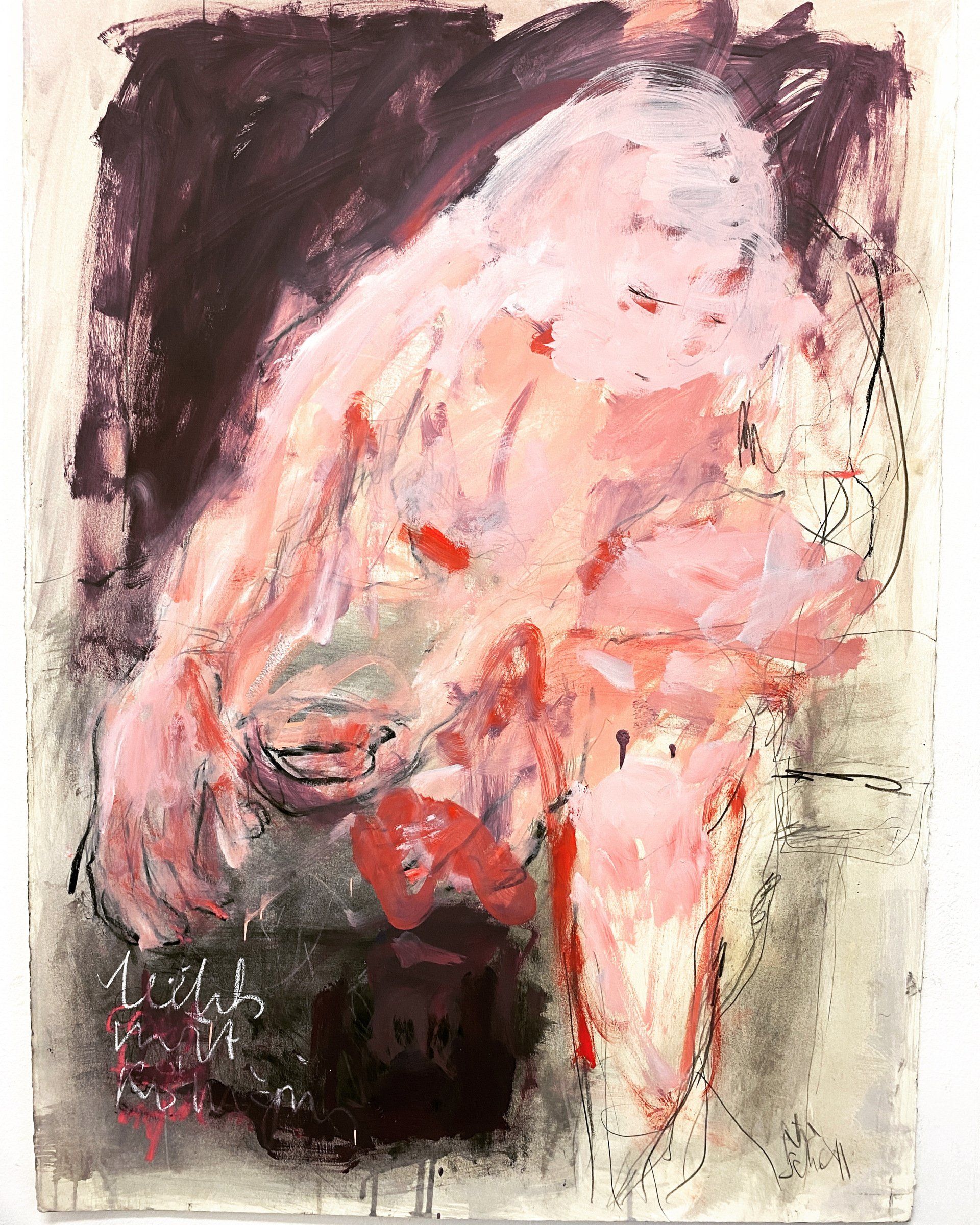 Petra Schott, Introspection VII, oil and graphite on Handmade paper, 105x70cm, year of creation 2021 - This painting shows a woman in a waiting state, looking down on the floor in a sad mood. The woman is alone, painted in wild brushstrokes as if an inner anger or impatience has formed the rhythms of this painting. The woman sits still, but we can feel the power within her wanting to break free. This painting has been created during a Covid lock down in Germany. This is a time of looking inside and fighting with inner ghosts, a time of backpedaling and surrender -all this I wanted to transmit in this painting.