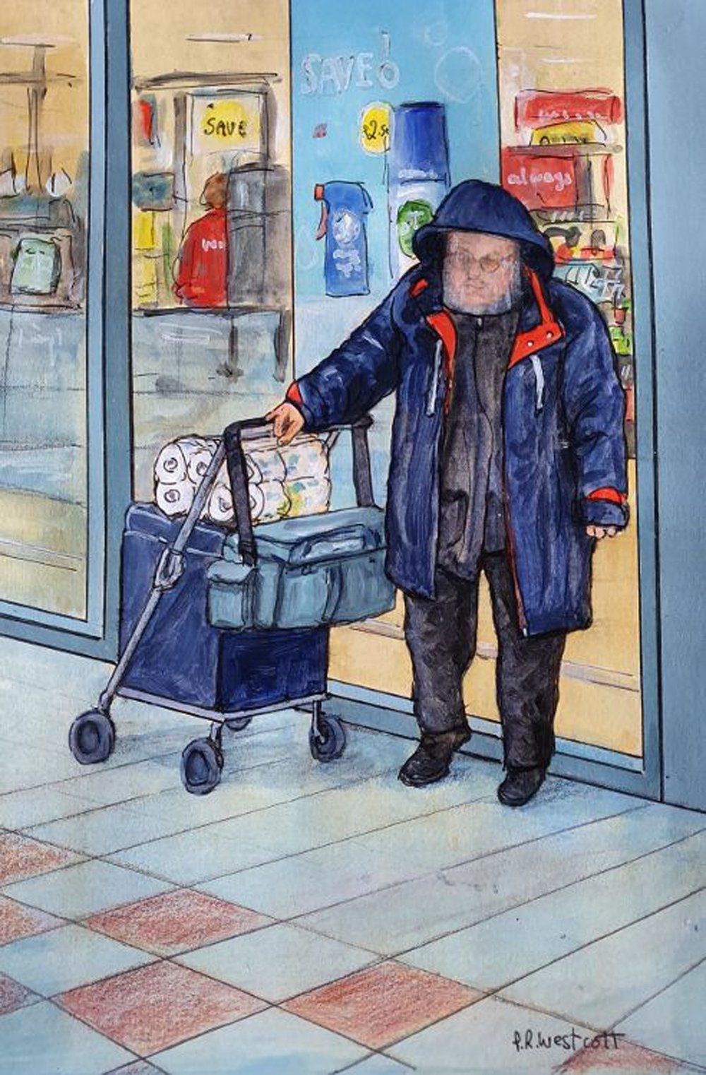 Philip Westcott, Prepared - There are many ways people have had to change their lives during the pandemic Covid-19. Social distancing was introduced, and the wearing of masks and protective clothing has become the norm. At first it was the lack of PPE in hospitals that was the problem in England, slowly this was solved and then the public were advised to wear masks, before eventually this became compulsory in shops and busy areas. Unfortunately wearing masks for people with glasses became a problem as the glasses soon steamed up. This could be solved by wearing a face shield as seen in my painting. On another note, shopping habits changed as well in the beginning as there were shortages of some items, this lady is prepared for the worse with a good supply of toilet rolls and a full shopping basket. Fortunately, most shops manged to restock after the first few weeks.