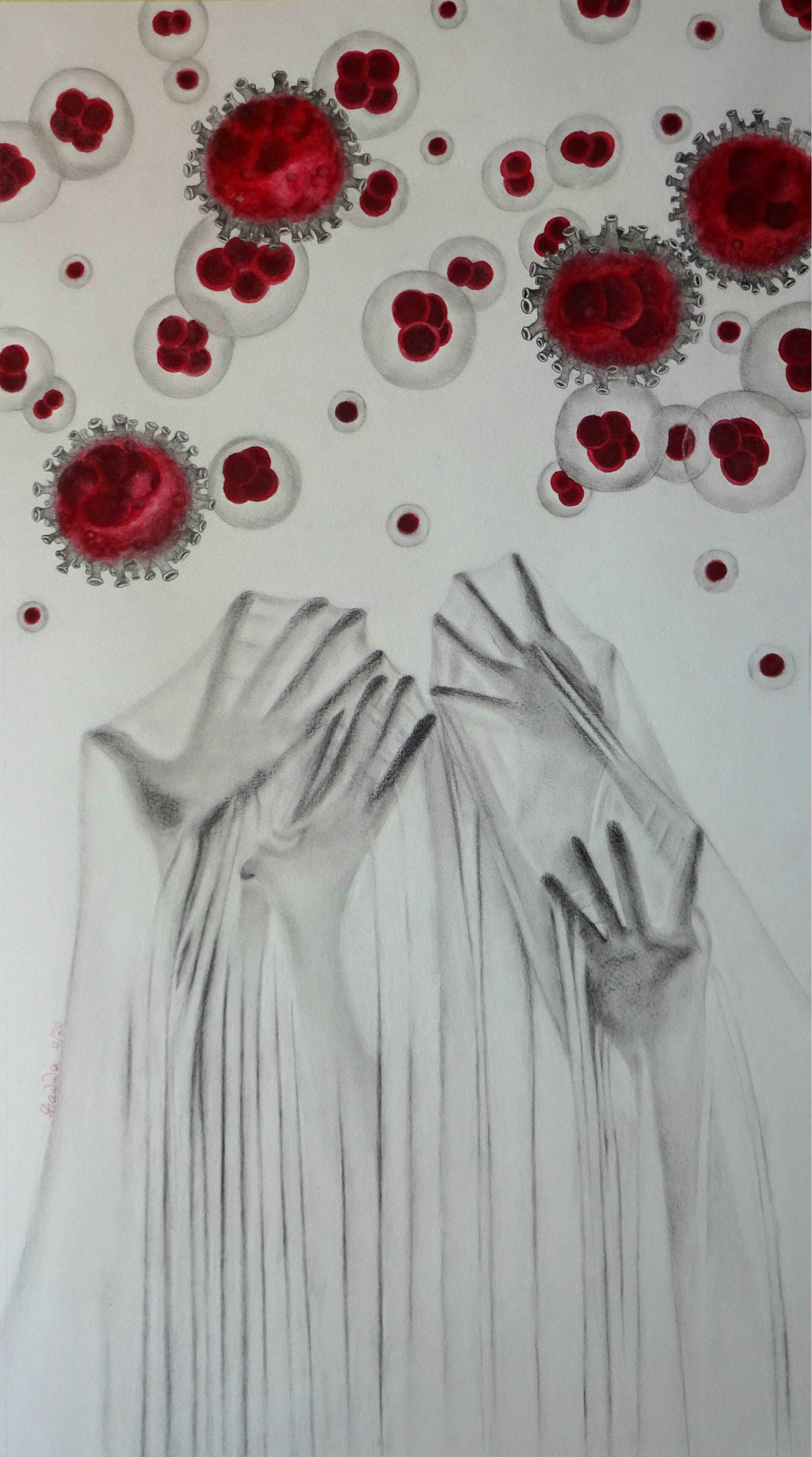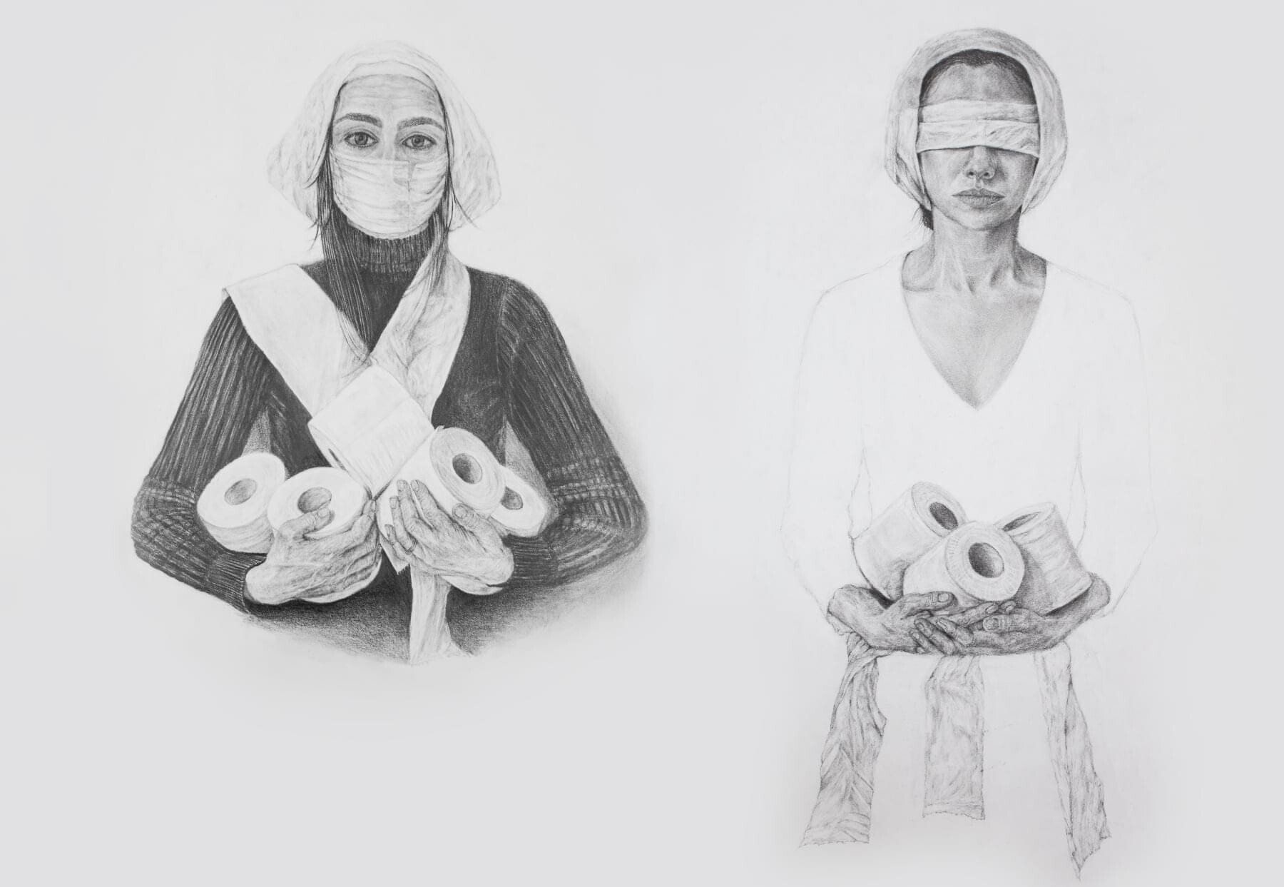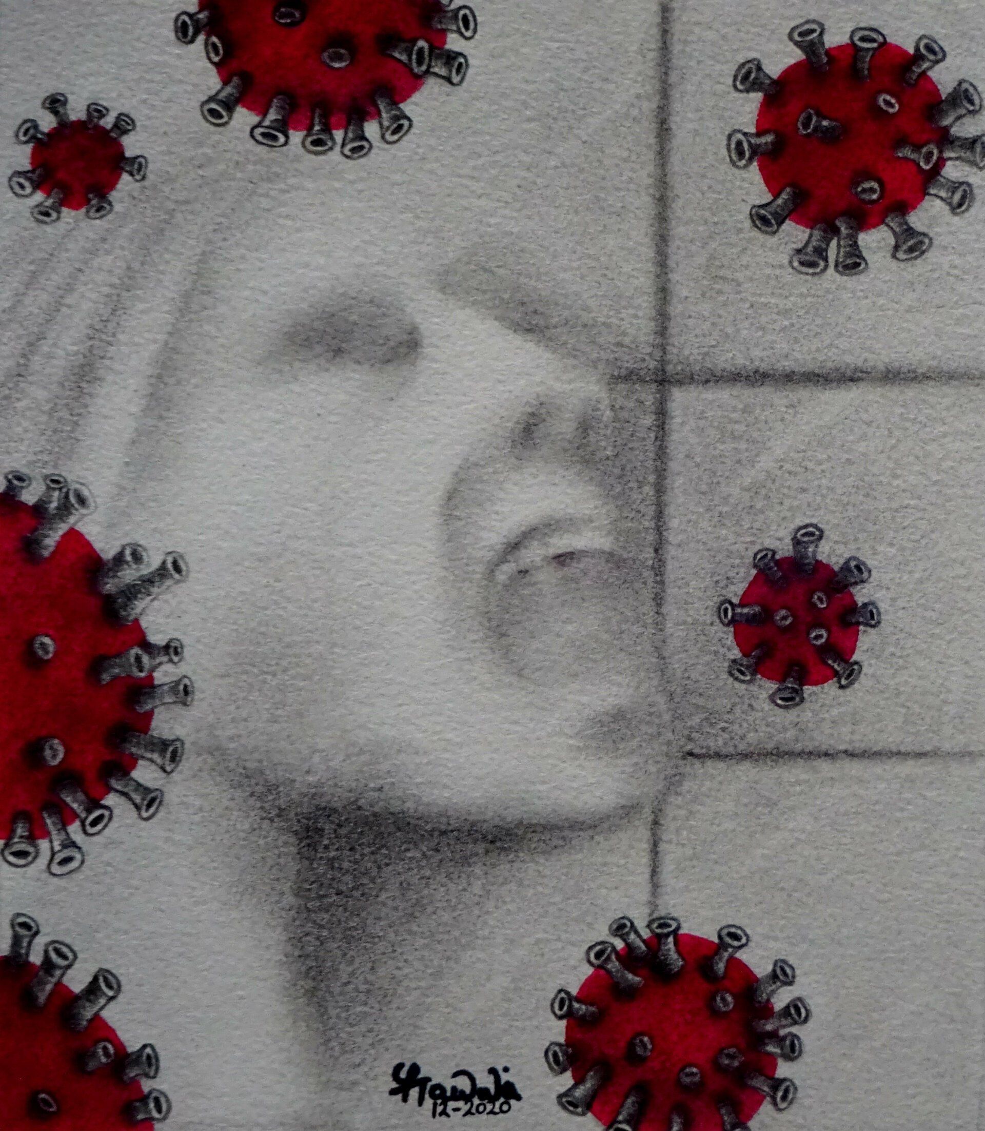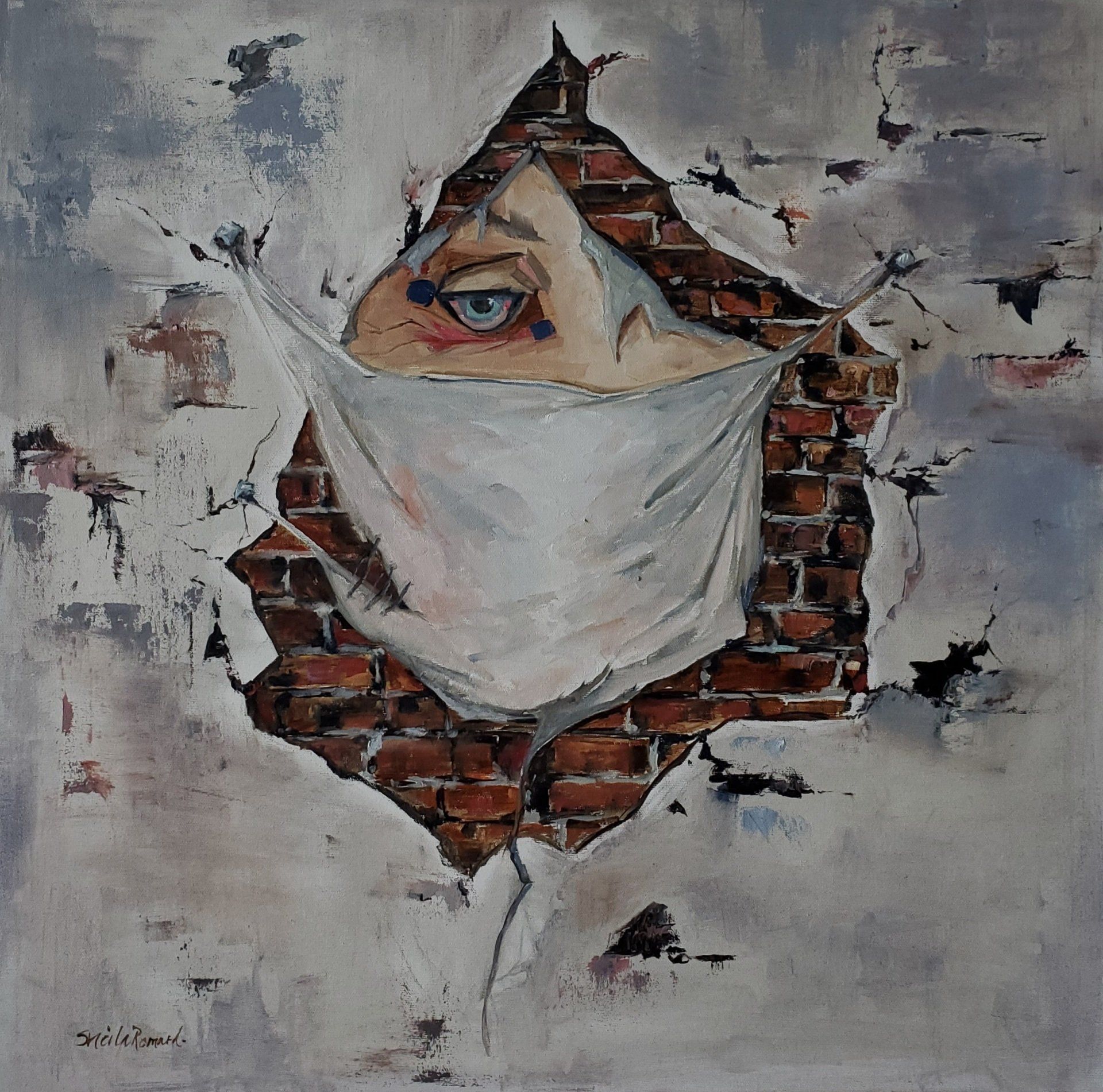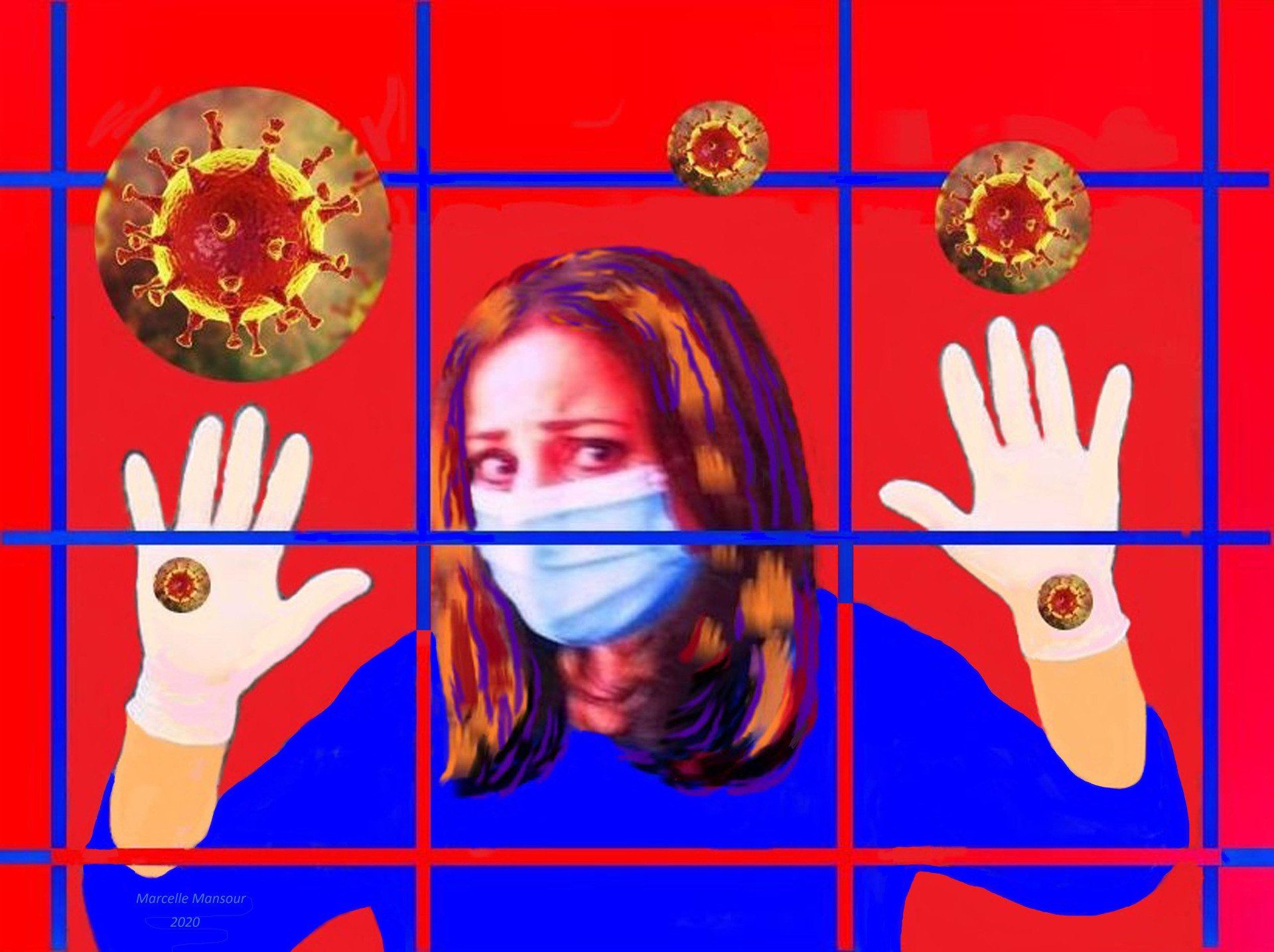 Marcelle Mansour, A Haunted Cell of Isolation - COVID-19 pandemic has exacerbated existing global crisis while people battle the outbreak. Inspired by Greek Philosophy, humanity and spirituality as a vehicle for knowledge and wisdom, my artworks highlight the theme of universal human responses in isolation. Restrictions have impacted people staying in lockdown, quarantine or imprisoned in home with loneliness, anxiety, and depression. At this strange time where the unusual become a Norm; self-isolate, social distance, hand glove and wearing mask becomes mandatory in public areas to prevent onward transmission. My work reflects my soul as a universal woman in process of introspection with a purpose to find hope in transition while facing challenges. Creating positive norm thought of resilience, thankfulness, gratitude and optimism through art is vital to help in this psychological upheaval.