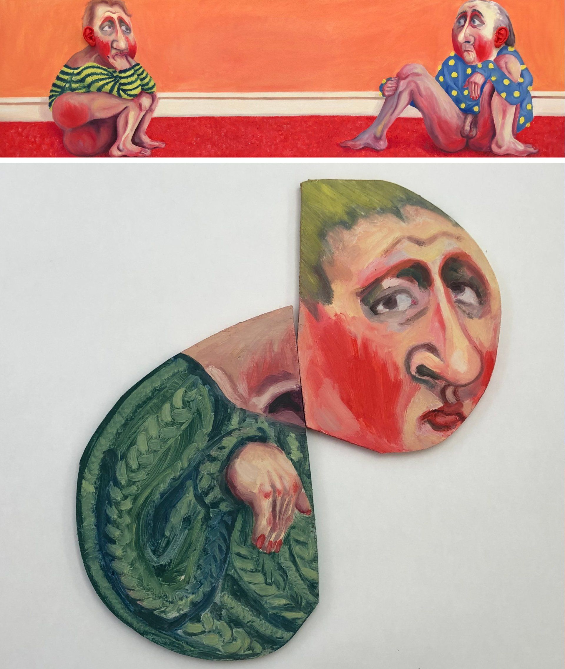 The figures revel in their insecurities through humorous exaggerations of anxious bodies. My figures share a commonality in exploration of identity, dipping their toes into queerness and gender displays, as they tightrope between revealing and concealing themselves.