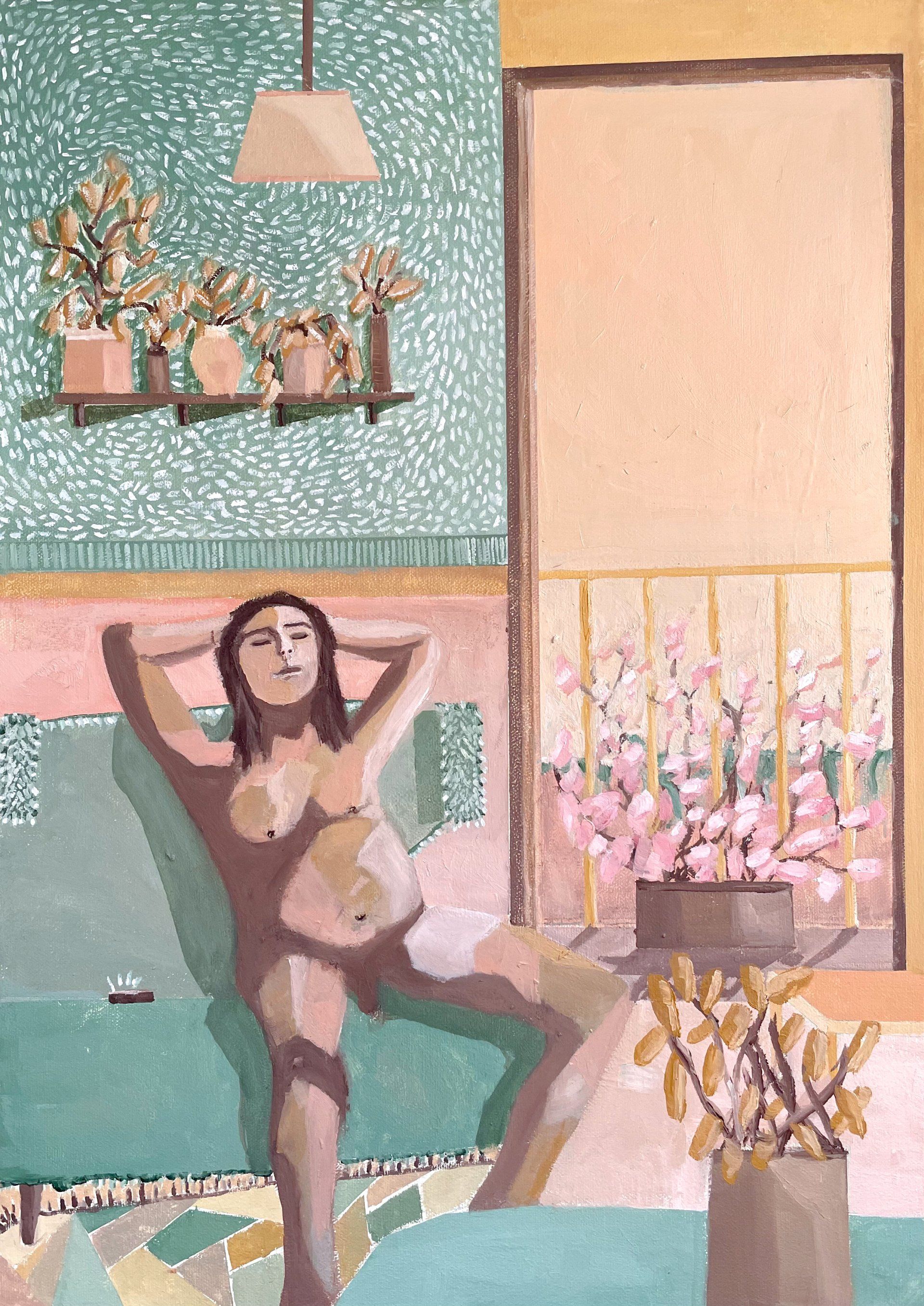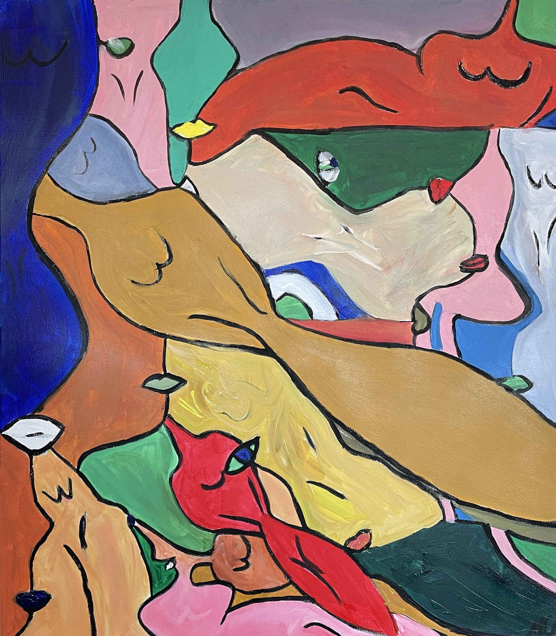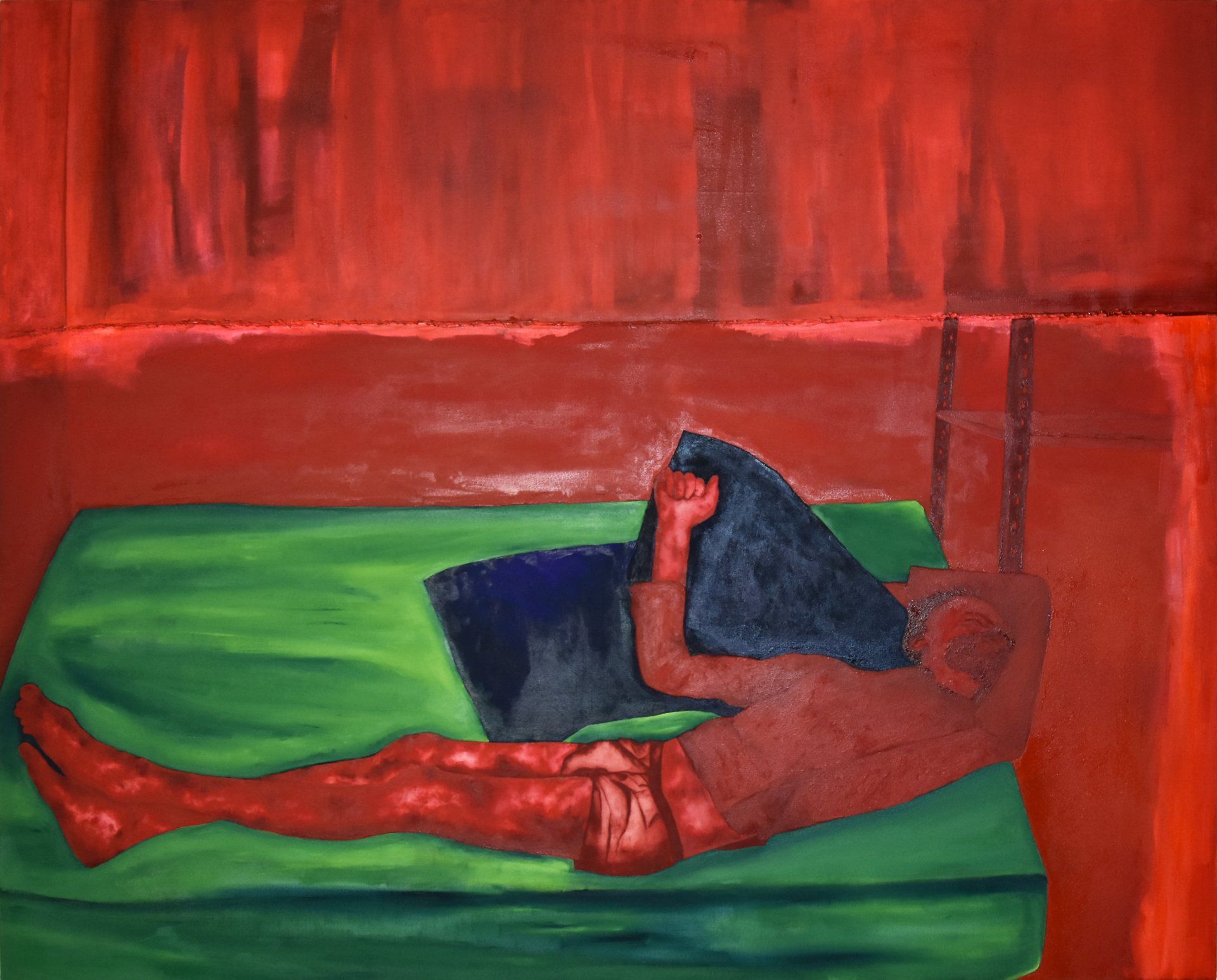 Elsa Egon, Le repos de Justin Bollard (au confinement) - With the Covid 19, I have started to make the portrait of people I love. After twenty years of abstract painting, I have got the necessity of exploring the figurative! I think that this new way may give me a good answer. With these ten months with days while I have been totally alone in my room, I have started to think about my work and how to find the way to bring the exterior to my own interior. To ban the only need to externalize my feelings and go towards others. However, these subjects stay in a situation of colors without references to their context, in isolation.