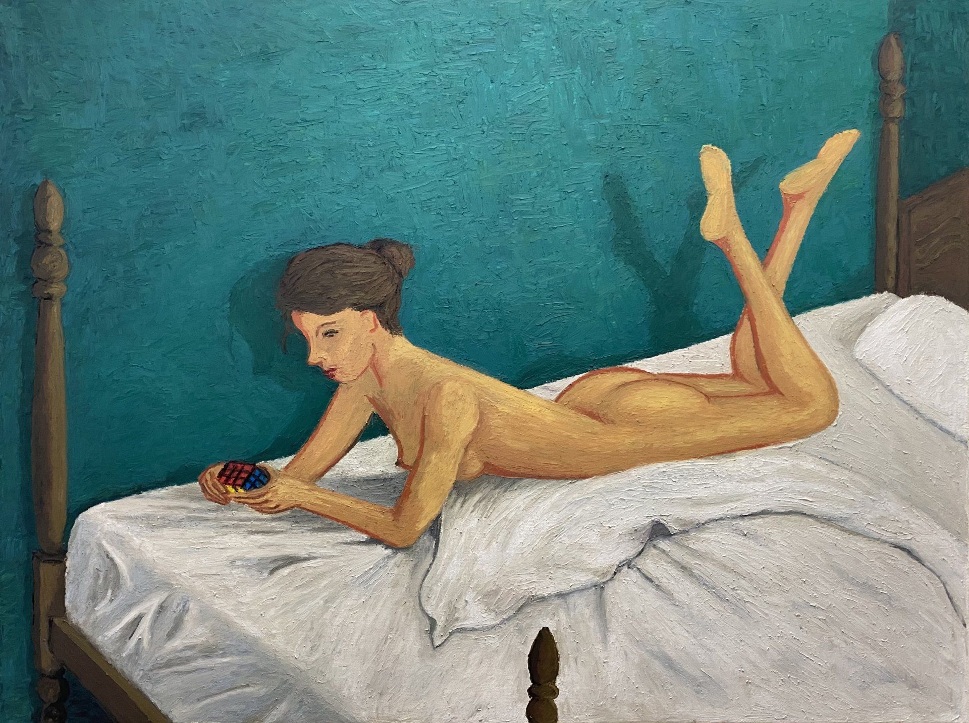 Diego Lozano, Aerobics cube - I believe this work of mine reflects the solitude that many of us have felt during this pandemic. We’ve had no choice but to find new interests and talents that we never knew we had. I also think we’re appreciating our homes and privacy more than ever. That’s the message I’m trying to portray in this painting, the freedom and comfort of your own company.
