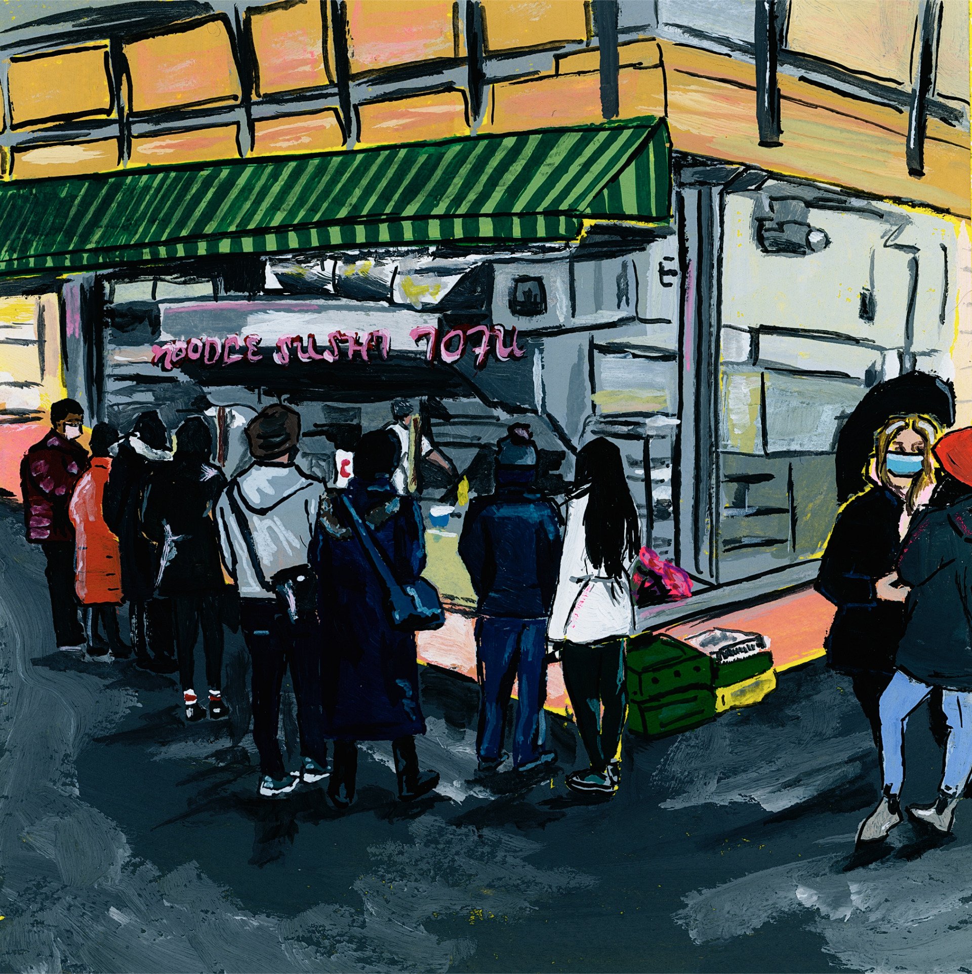 Alyssa Doggett, Chenpapa - A scene of socially distanced customers wearing masks lined up to order food from local vendor Chenpapa. I was inspired to paint this scene as it is relevant to our current mask wearing and socially distanced culture during the Covid-19 pandemic. This piece was free hand painted with gouache and underpainted with lemon yellow watercolor to brighten an otherwise dreary scene.