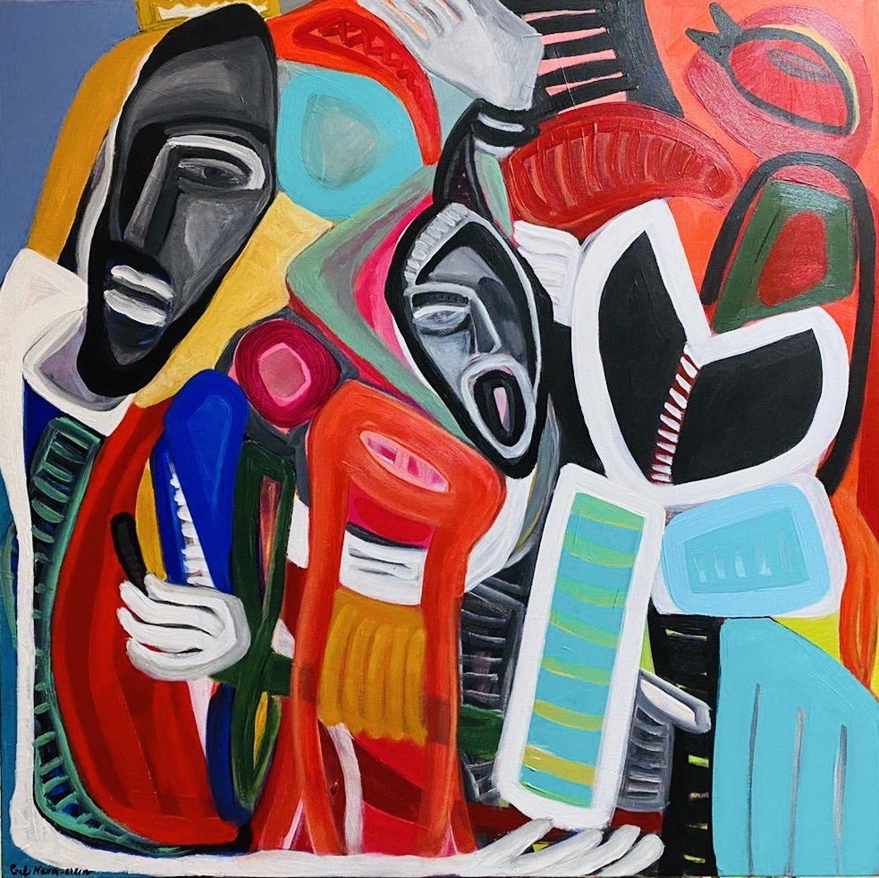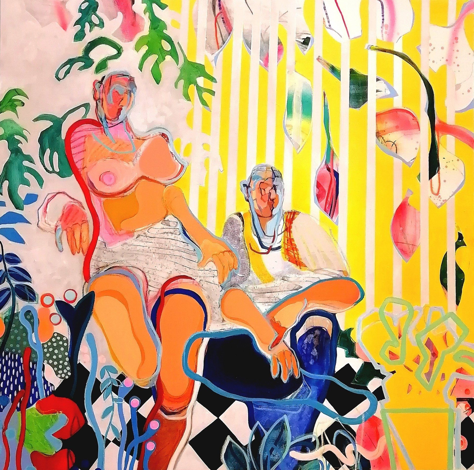 Charoula Nikolaidou, Balcony View - Staying at home and keeping away from others, due to the pandemic, changed daily life as we knew it. During this second lockdown my balcony view has become a transcendental connection to nature. The urban frenzy has disappeared and my little balcony garden is still the greatest form of escapism, enabling me to reduce stress and improve mental health. Finding inspiration in my own encounters with other people and moving on a purely experiential axis, I feel that this painting incorporates vibrant colours of both figures and space, capturing at the same time movement and emotional forces such as tenderness, love and fragility during those never-ending hours at home.