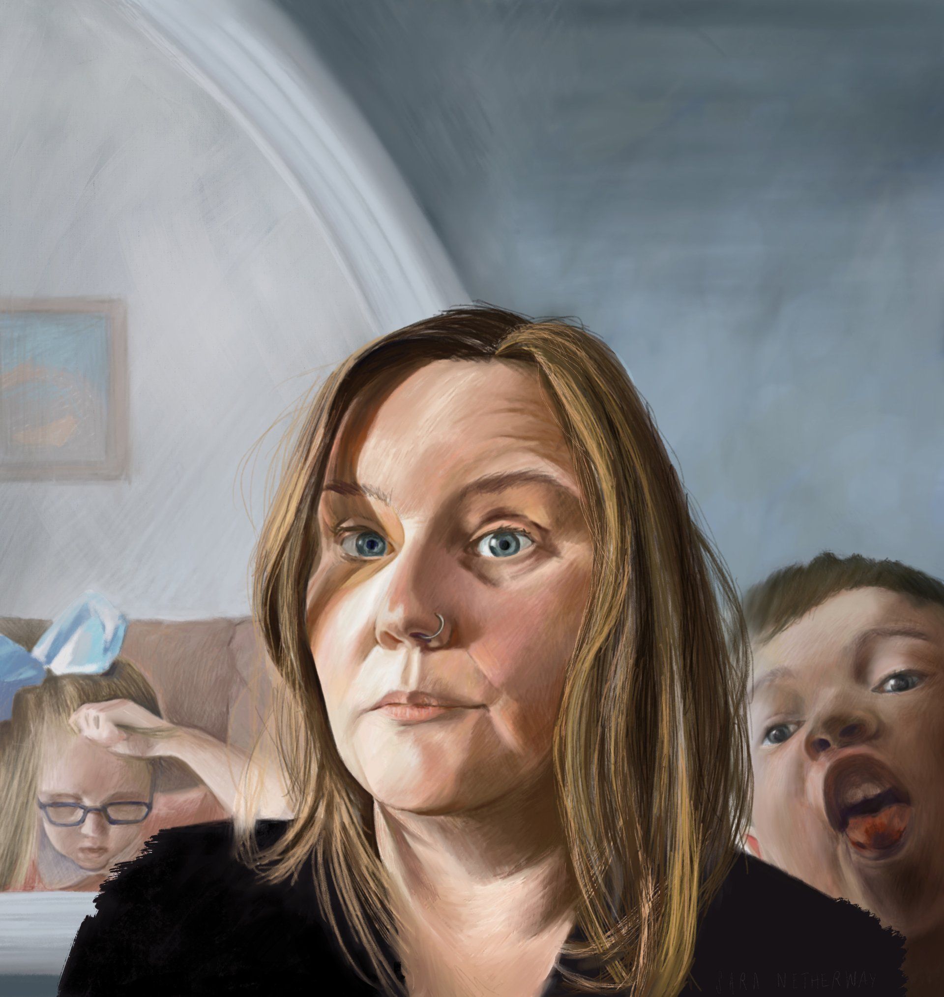 Sara Netherway, CHILDREN - The piece is about children during lockdown in England. The mother looks out to the viewer asking them to judge her as she feels tired and exasperated with the situation. She turns her back on her children who either look after themselves or act out unsupervised behind her.