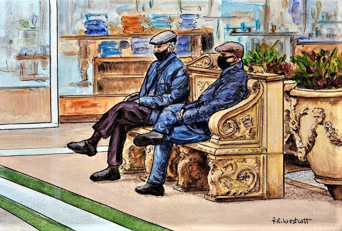 Philip Westcott, Resting Trafford Centre - One aspect of the pandemic Covid-19 has been the restrictions placed on people in England. During various times shops have been opened but strict rules have been in place where masks must be worn, sanitation areas and strict control of numbers enforced. At other times, many shops not selling essential items have been closed completely and people were only allowed out for limited times. These restrictions were to stop the spread of the virus and to relieve the pressure on hospitals. Fortunately, at last these measures seem to be working. My painting shows a couple of gentlemen relaxing during a shopping trip when it was allowed.