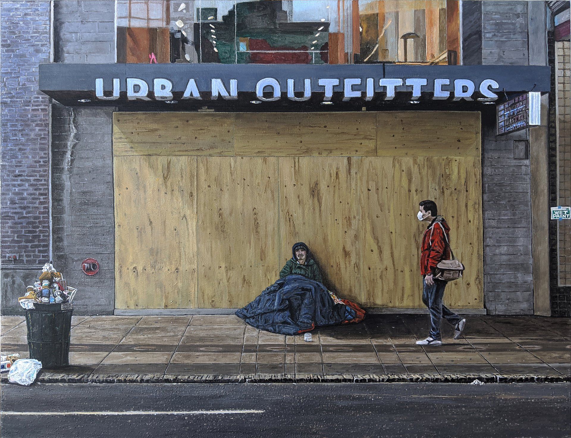 Gregory Knight, Urban ‘Not’ Outfitted - We must change the urban environment and accept that the space isn’t unlimited, where everything can be wasted and abused. The city street is a story of people, and we must look at the most vulnerable before these types of pandemics and disasters occur more and more. Some of the troubles we have today are a warning where people and corporations are more selfish, aggressive, and materialistic in making the most of their individualistic needs. Until we start looking at these things differently, we won’t be able to coexist together. In my painting, I wanted to emphasize consumption, imbalance, waste, homelessness, and the healthcare crisis from one perspective. The disadvantaged people during this Covid crisis could be there literally at your feet.