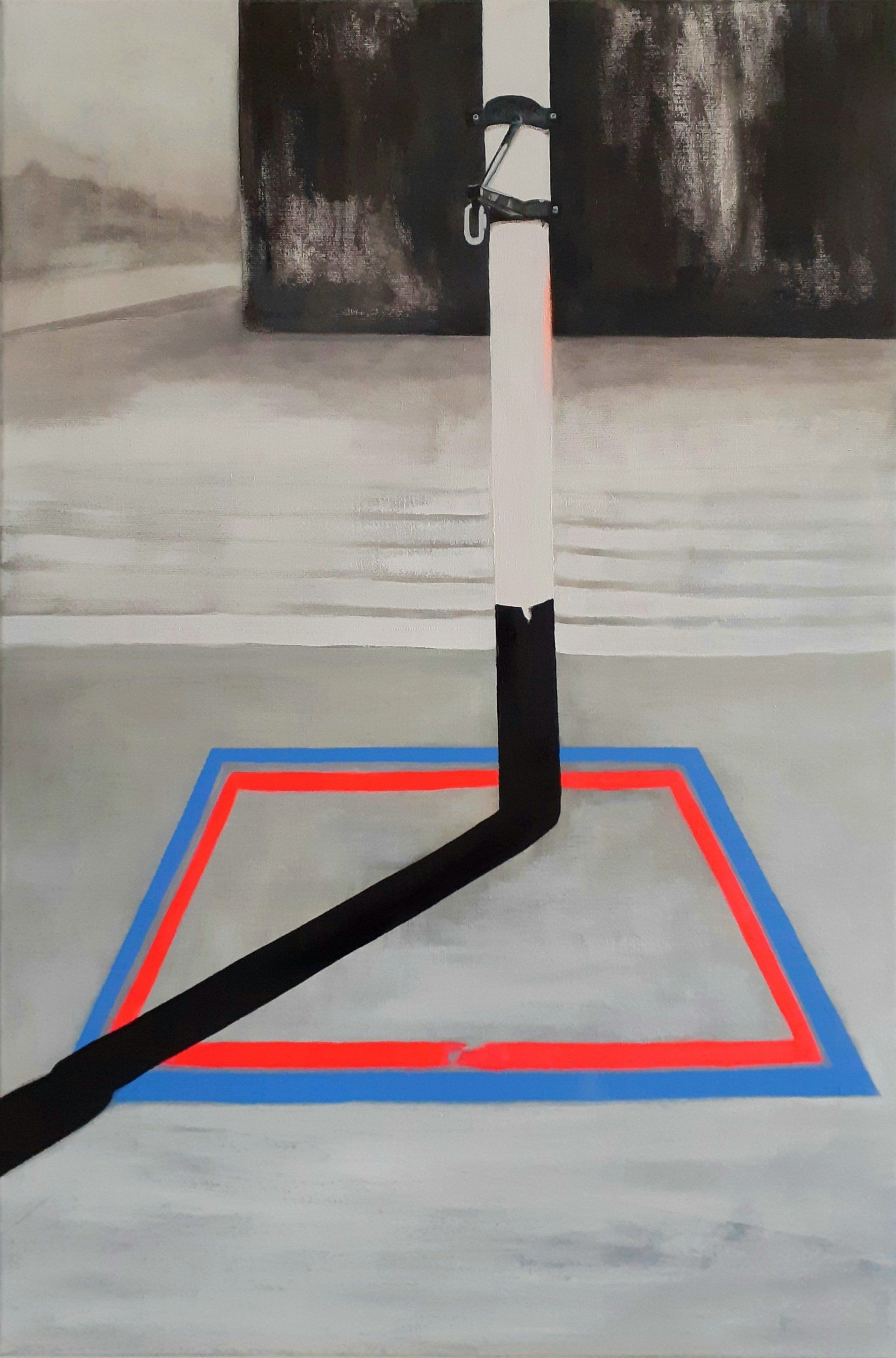 Ella Luben, Incomplete - The work generates a partly illusionistic space where nothing can fully exist or ever function cohesively. Incomplete structures, accessible through entry and exit points to the painting, a series of instructions, a pretext for painting now. Reflecting how we navigate space and our adaptation to the uncertainty and immediacy of change, the work shows the dismantling of structure as we once knew it. A digital residue is present that reassesses the nature of space - how it can be accessed now more than ever before within a digital and virtual context. Change is imminent. The object is not fixed and none of the lines join, representing uncertainty and the level of anxiety currently present, highlighting our lack of space, structure and stability due to the current situation.