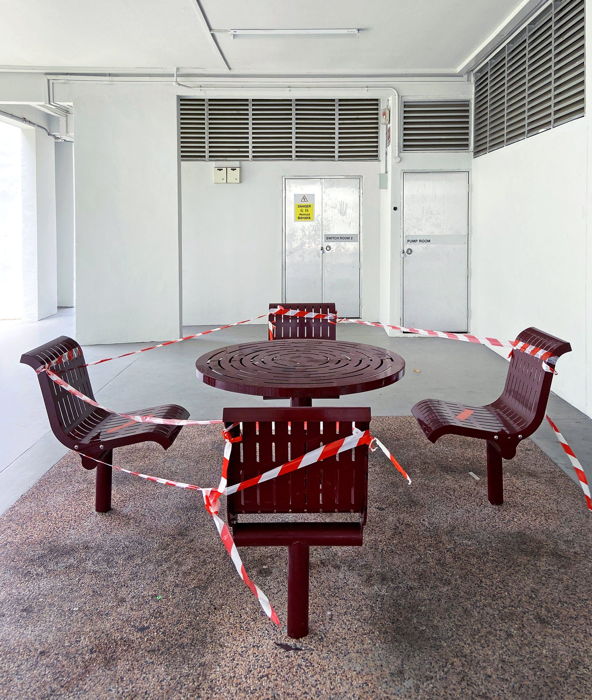 Junie Tang, Don’t Sit Down - In 2020, Singapore went through a two-month long circuit breaker (stay-at-home order) between 7 April to 1 June to ease the spread of COVID-19. As soon as the circuit breaker began, the city state’s ever-bustling central area and heartland neighbourhoods came to a standstill almost instantaneously. And as a preventive measure for people to gather and mingle in the shared public spaces, such as the playgrounds and HDB’s void decks, the local authority used red and white safety tapes to wrap around areas that might encourage any kind of association among the residents. While taking the picture, a song that describes this strange scene in front of me came to mind, and hence, used as the title of the artwork.