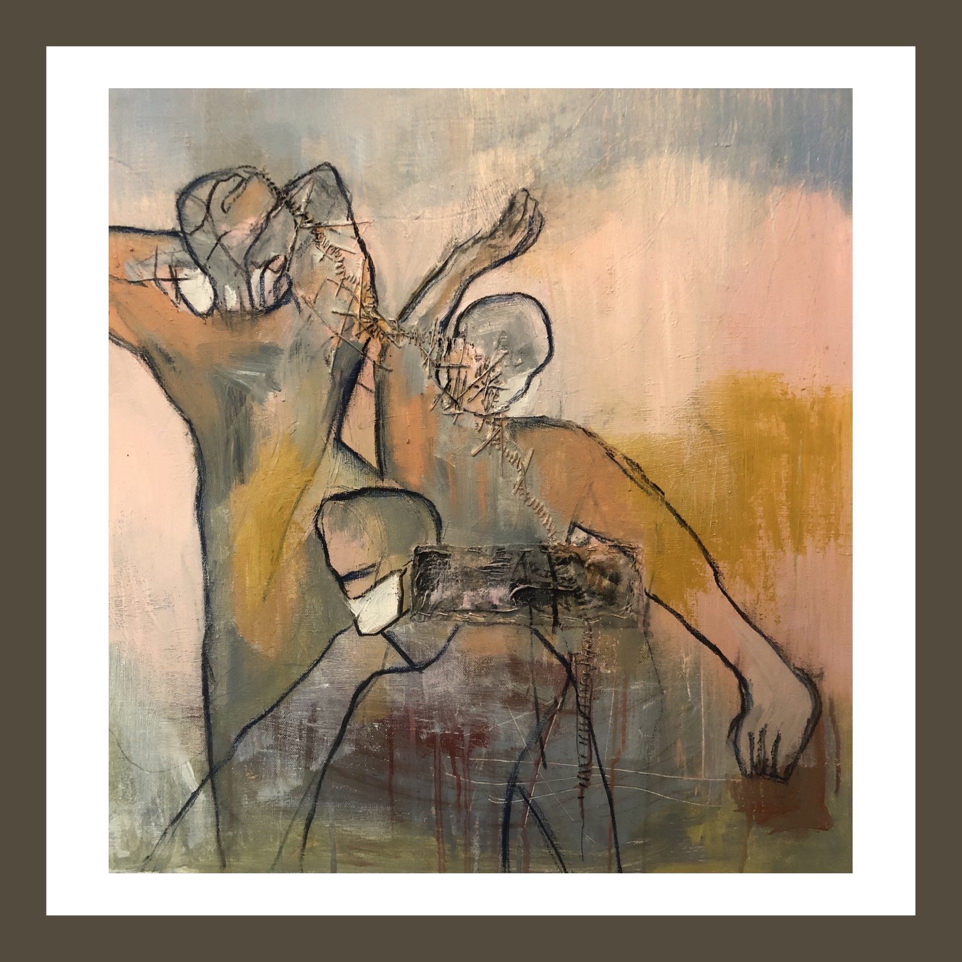 David E. Robatin, The next thing I knew, we were inextricable - As we were required to stay at home more, our worlds seemed to get a little smaller every day. It was a time of continuous adjustment, growth and adaptation. One of the unintended benefits was that the closer our space became, the closer we got. Our relationships grew even more entwined as we shared space physically, mentally and emotionally. The figures in this work are painted over a rough, cracked background that has shades of darkness encroaching. The two figures smoothly blend in color and shape, creating an inextricable togetherness they might not have experienced before. The background and the figures change … from light to dark, from green to red … representing our current condition in the pandemic and how we have evolved.