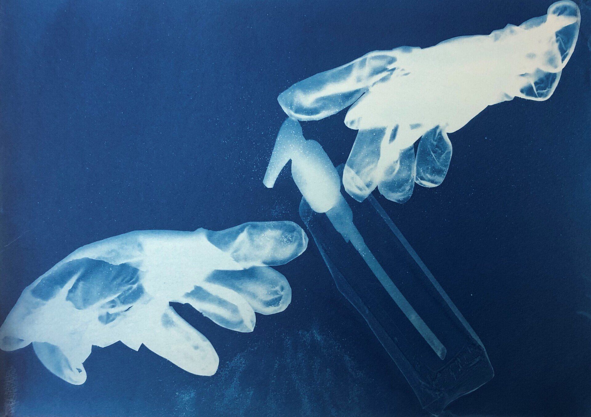 Susan Ridge, NHS Cyanotype Covid Badge - Like many artists I have been making cyanotypes during Lockdown. On my daily walk I noticed discarded masks and gloves (Roadkill). This was one of my first images created with the cyanotype process using masks, rubber gloves and syringes (which create their own corona shape). I developed the images into a badge for the NHS as a response to the Tory Government giving badges instead of PPE equipment to Carers. I have recently made a cyanotype image from a NHS plastic face shield – Armour.