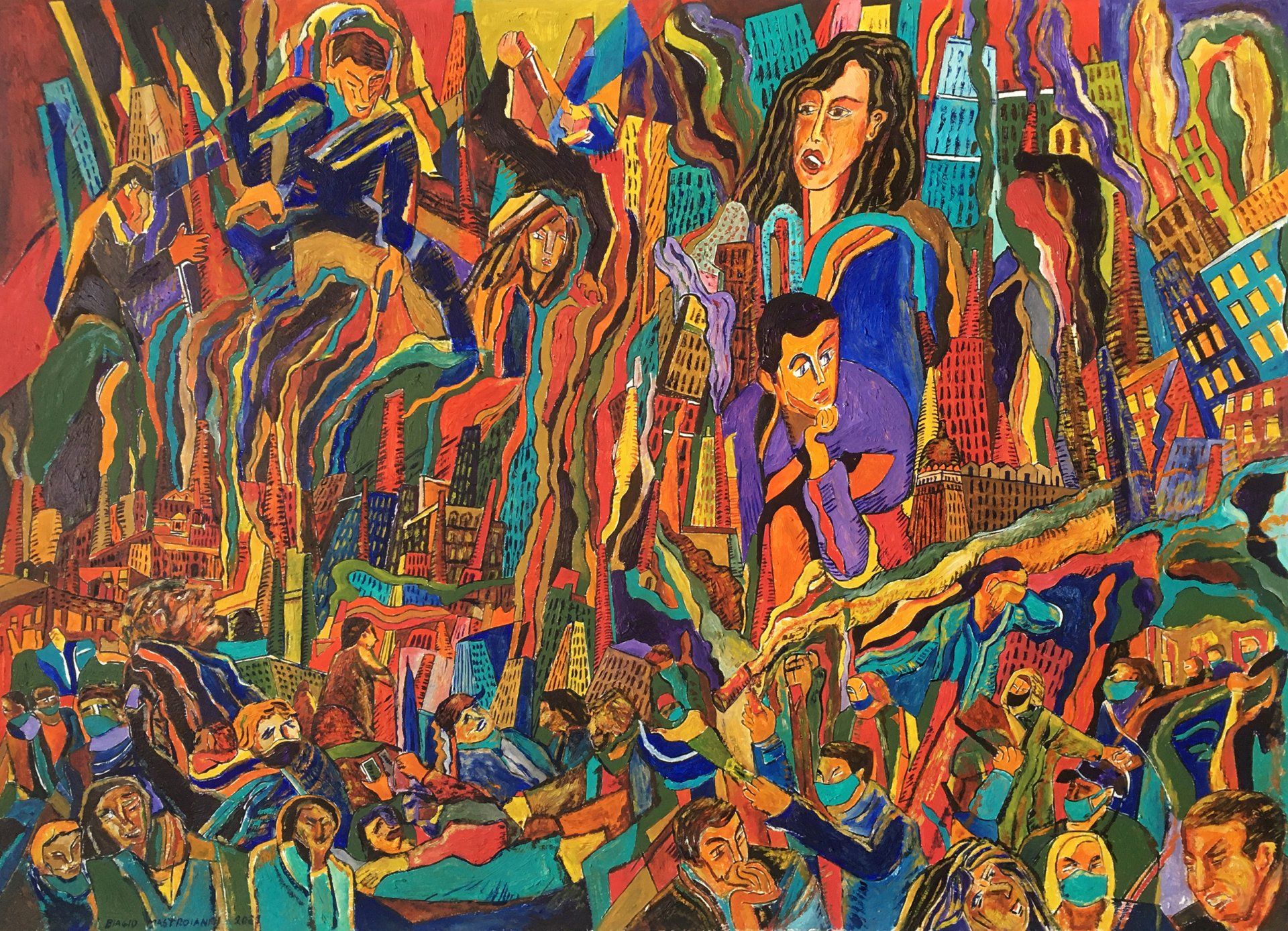 Biagio Mastroianni, Chaos in the City - I was inspired by the riots and demonstrations in many cities in the world by governments decreed of Lockdowns and restrictions. Painting, Oil on paper, 60 x 84 cm, 2021