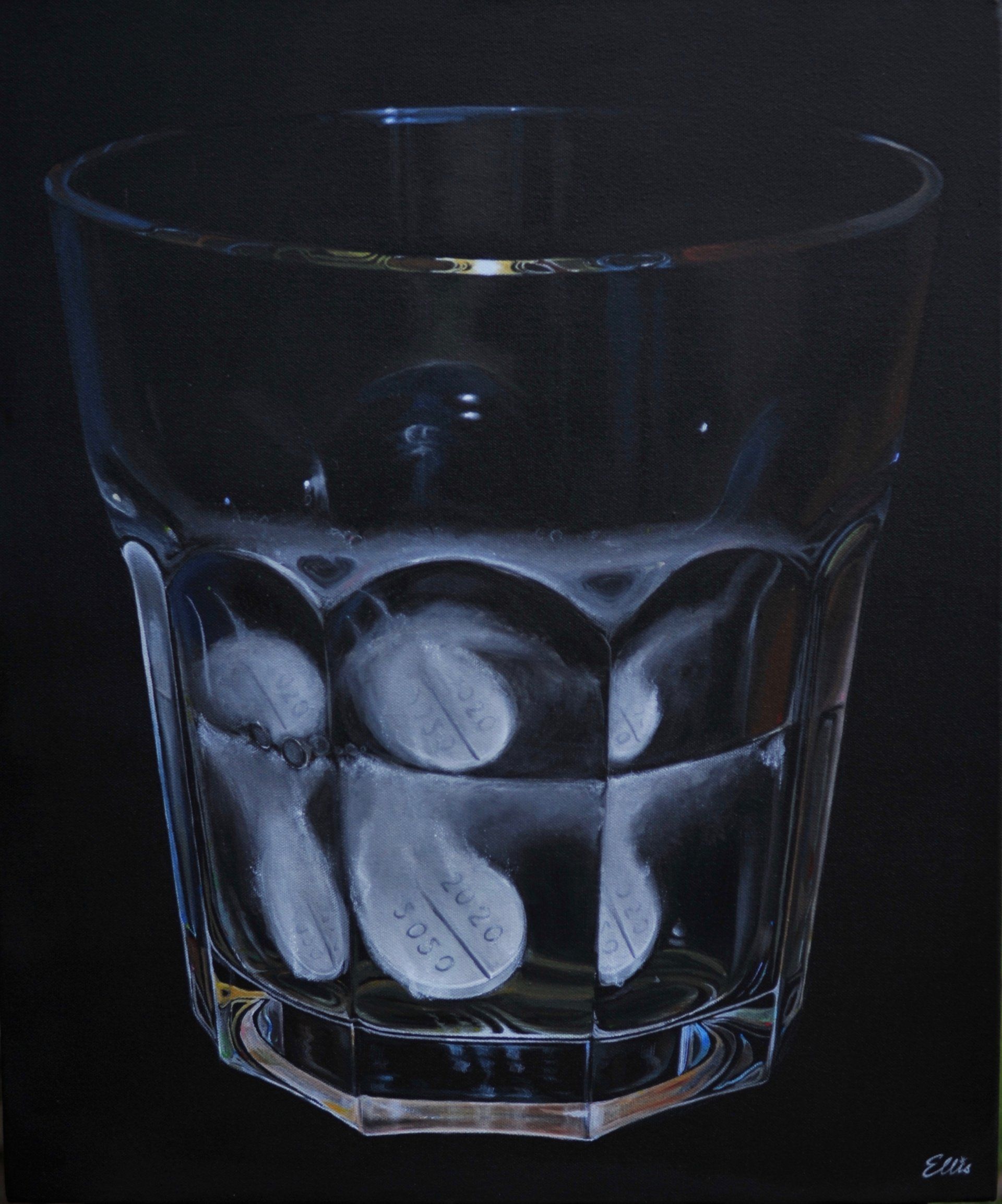 Anne-Marie Ellis, Dissolving 2020 60x50cm acrylic on canvas - Glass is something I love to paint, usually whisky glasses or perfume bottles, but in lockdown I found myself often staring at a glass of water, waiting for a tablet to dissolve & get rid of yet another headache…In this stark, dramatic painting my aim was not only to capture the metamorphosis of a dissolving tablet but to reflect the state of mind we were all in, needing a panacea to rid us of this pandemic year. The multitude of subtle reflective colours in the glass, and the repetition of the fizzing tablet in the facets have a haunting beauty. The tablet has the numbers ‘2020’ on it, a quiet reference to a year that will be remembered in global history.