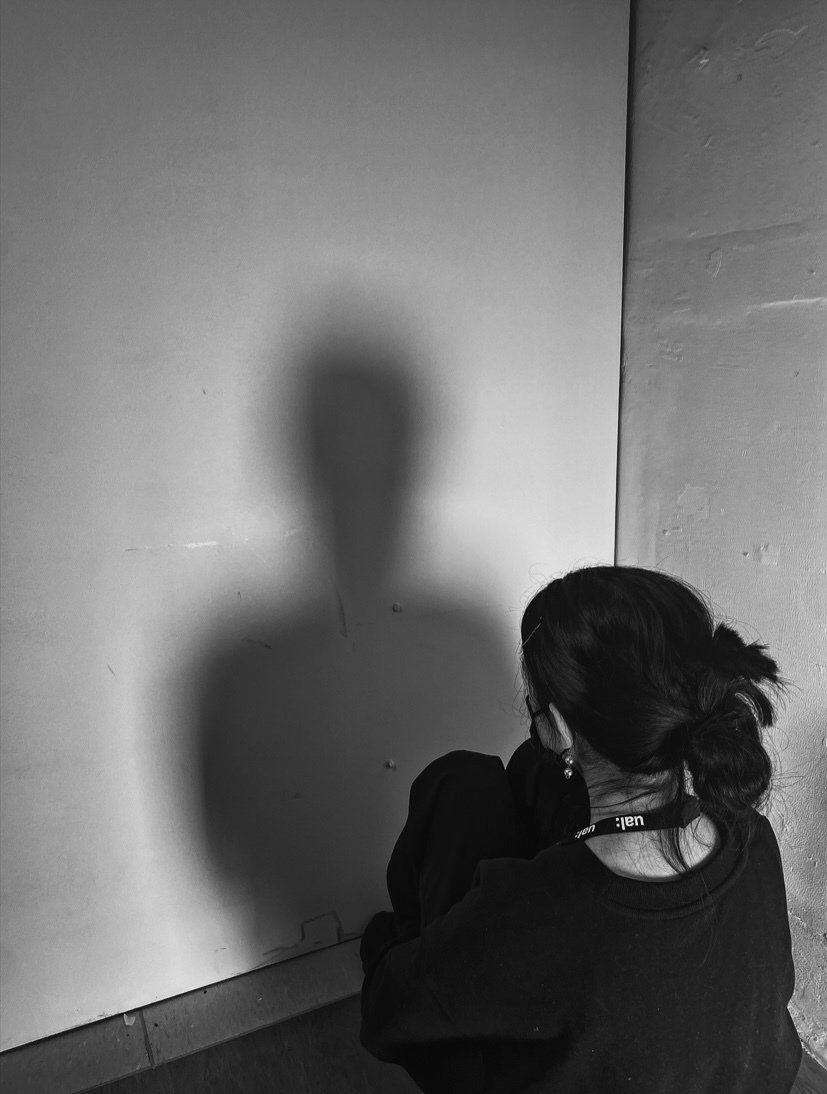 Felicity Mansell, Student Reflections - A photograph depicting the visual concept of being isolated as a student during the pandemic. It features my companion, performing how I felt during lockdown. The angular planes of the adjoining wall in the background, represent the structure we look for in everyday life, that we are unable to achieve during the pandemic. The shadow is simply interacting with her former self, unable to regain form and structure much like how we feel as students at the moment. Heightened by the student lanyard.