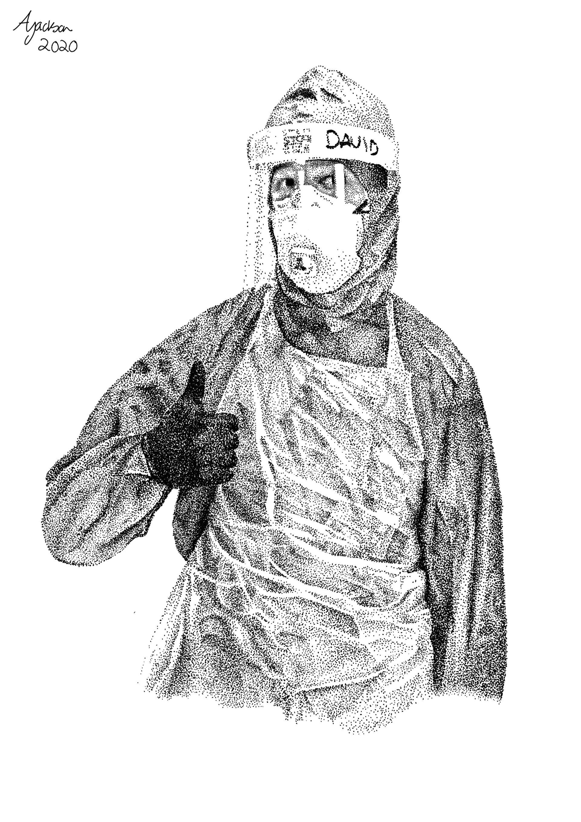 AJ Illustration, David - This A4 portrait was drawn using a 0.05 fineliner in a pointillism style, taking over 50 hours to complete. The portrait is of David, who was nominated by a friend and colleague for being one of the most hardworking registrars. David is a Respiratory and Intensive Care registrar in London.