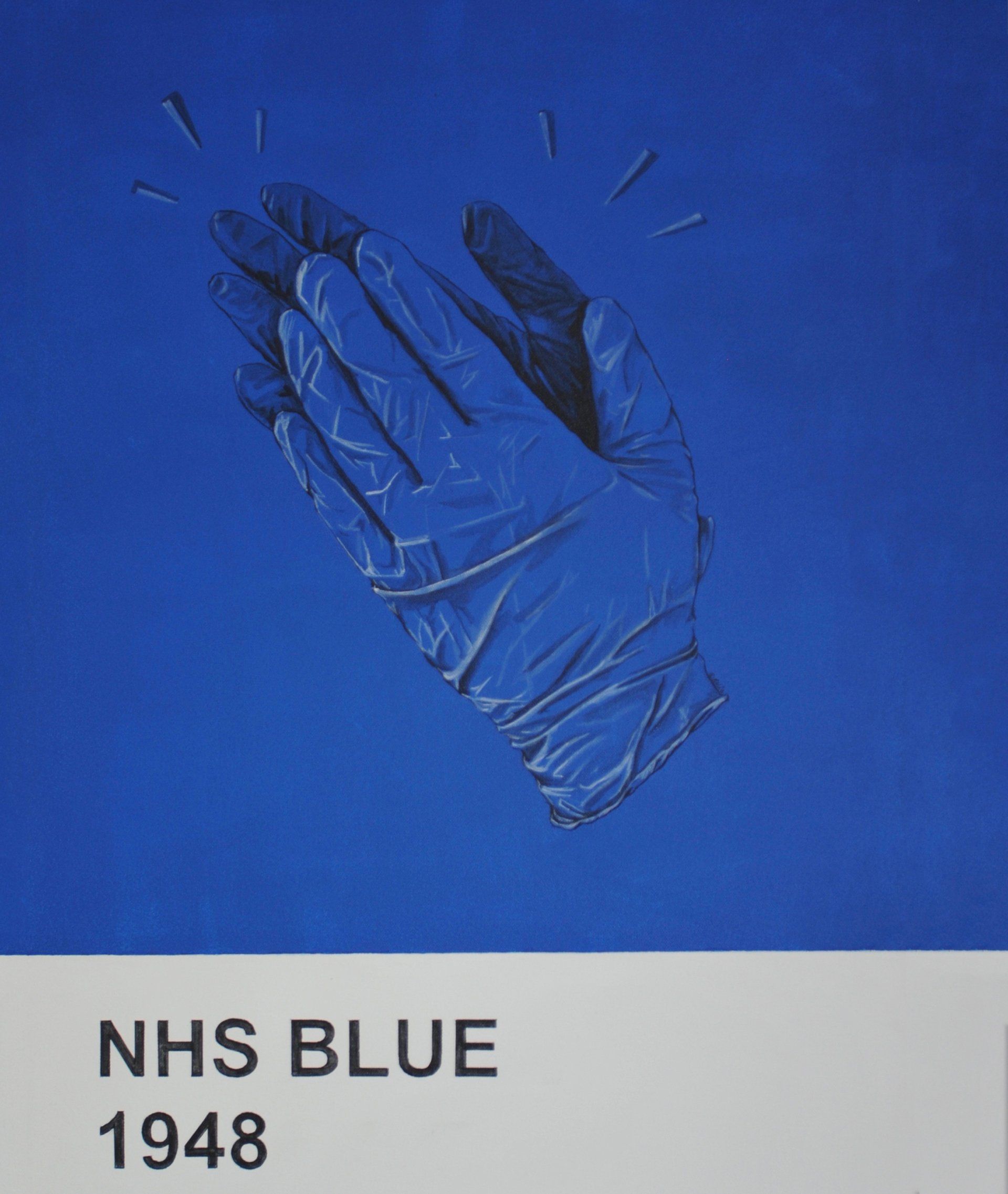 Anne-Marie Ellis, NHS BLUE 1948, 50x76cm acrylic on canvas - The distinctive blue of our national health heroes is used here to celebrate the work of the NHS. The artwork was made in the midst of the first lockdown, and the clapping gloved hands depict the nation’s weekly applause for the NHS. Like most people, I felt I would like to use my skills to help. I was already doing a series of artworks on iconic colours in the format of ‘paint chips’, and the fact that the blue of the NHS has now become the most recognisable element of their branding, made this fit. The NHS was established in July 1948, hence the year chosen as the paint ‘code’. The sale of the original and digital download raised over £1200 for NHS Charities Together.