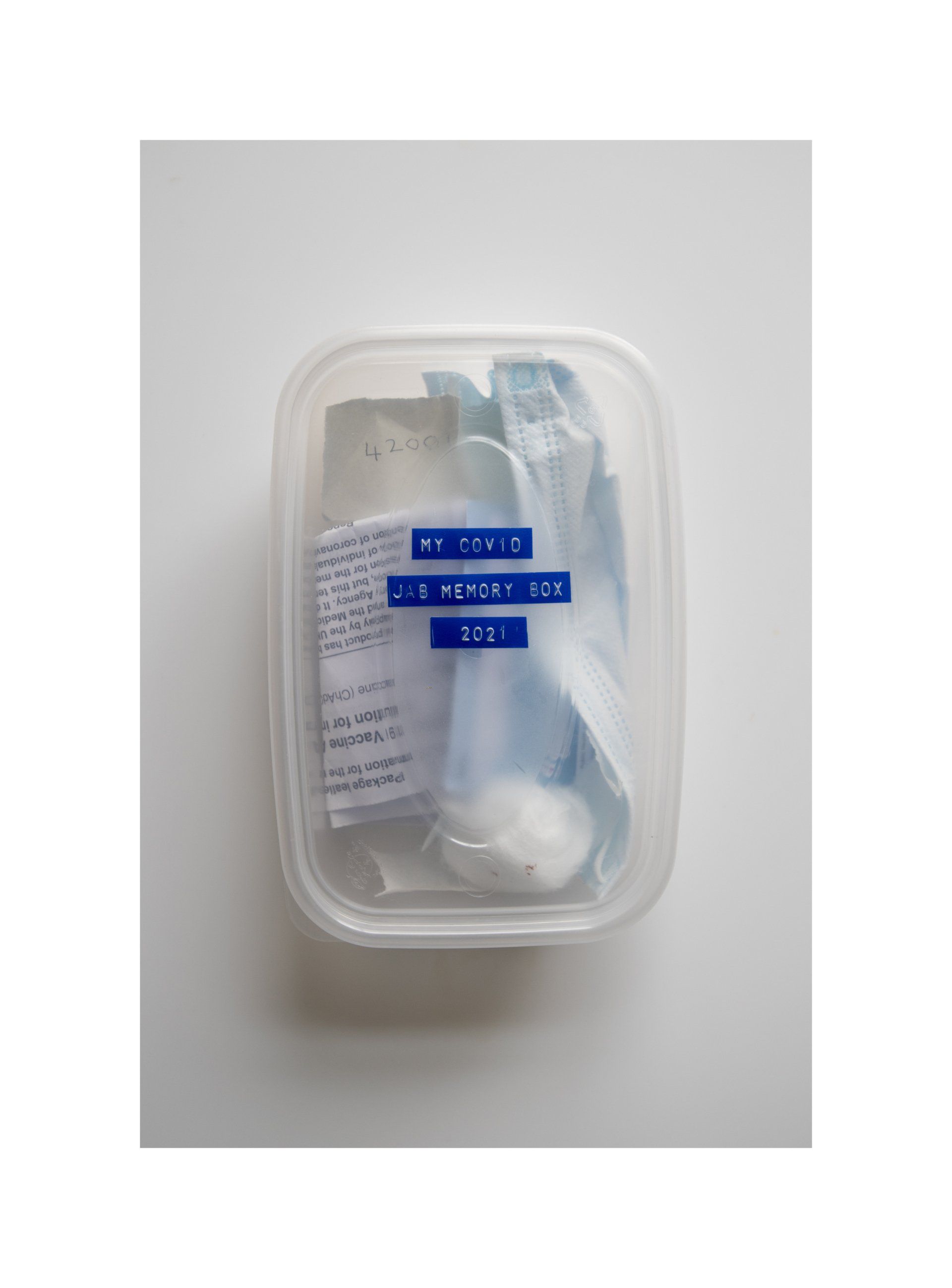 Clair Robins, My Covid Jab Memory Box 2021 - As a photographic visual artist, my image creation is often inspired and driven by souvenirs, collections and daily life, so during the past 12 months it has been fairly easy to create artworks fuelled by lockdown. The mundane starts to appear less mundane. Being at home has focused my observations and caused me to re-evaluate my environment, home and family with a fresh eye. ‘My Covid Jab Memory Box 2021’ still life photograph really seems to sum up the events and challenges we have had to face during 2020-21. It feels like a breaking point to the lockdown cycle, the glimmer of hope of a more ‘normal’ future. www.clairrobins.com, Instagram: @clairscollections