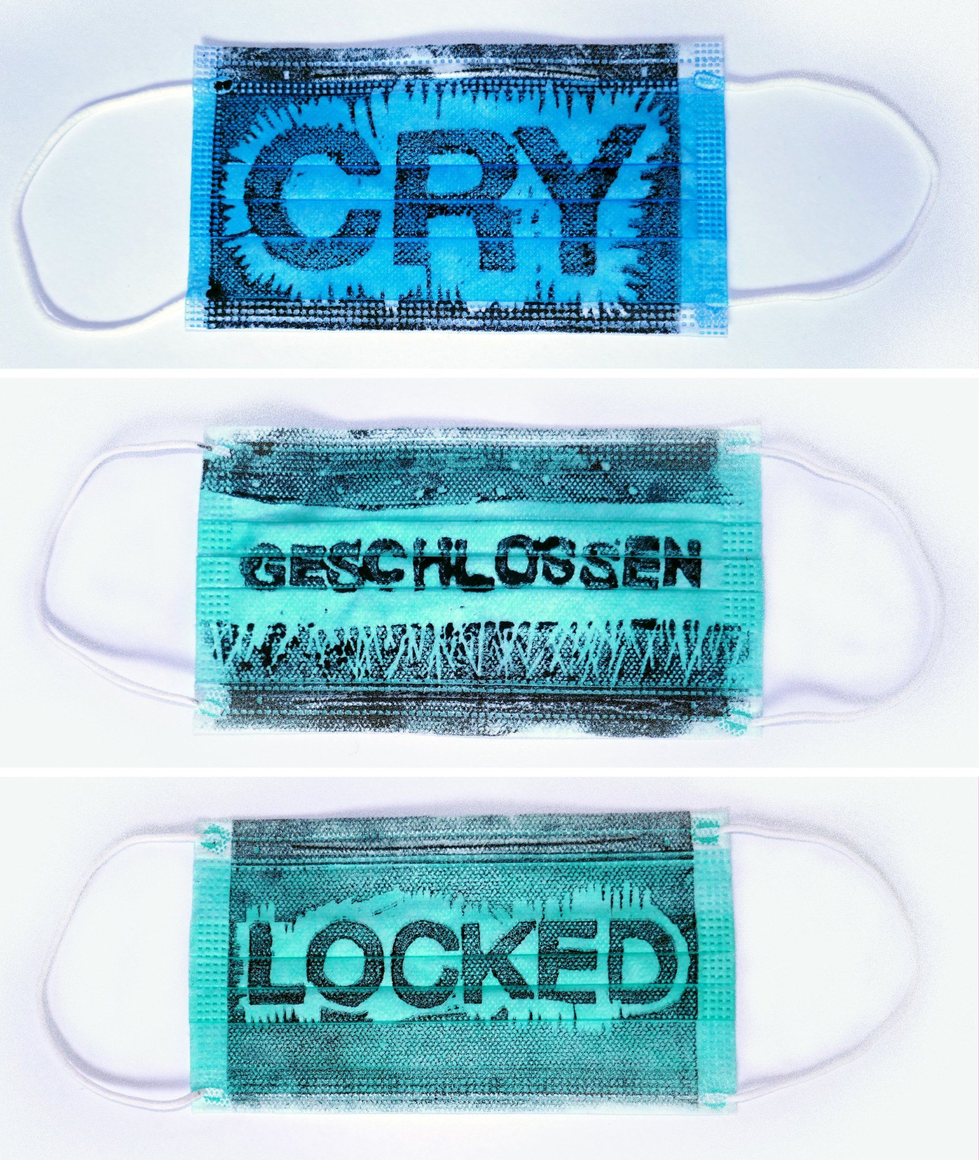 Susan Fey, locked - Linolschnitt auf Hygienemasken (serie) 2020 - Beim ersten Lockdown 2020 hat mich die Hilflosigkeit die das tragen einer Hygienemasken im Alltag auslöst sehr beschäftigt, deshalb wurden die Masken zu meinem Werkstoff. Der Mund, die Lippen, ob nonverbal oder verbal, sind für die Kommunikation zwischen Menschen entscheidend. Die ganze Gesichtsmimik wird durch das tragen einer Maske verändert. Können wir im Gesicht nicht mehr lesen, oder die Worte nur schlecht verstehen, ist die Kommunikation unterbrochen. Der schwarze Druck auf einer, in der momentanen Situation zum Alltagsgegenstand gewordenen, Maske verstärkt und überhöht die Aussage des Textes. Es schreit uns förmlich an.