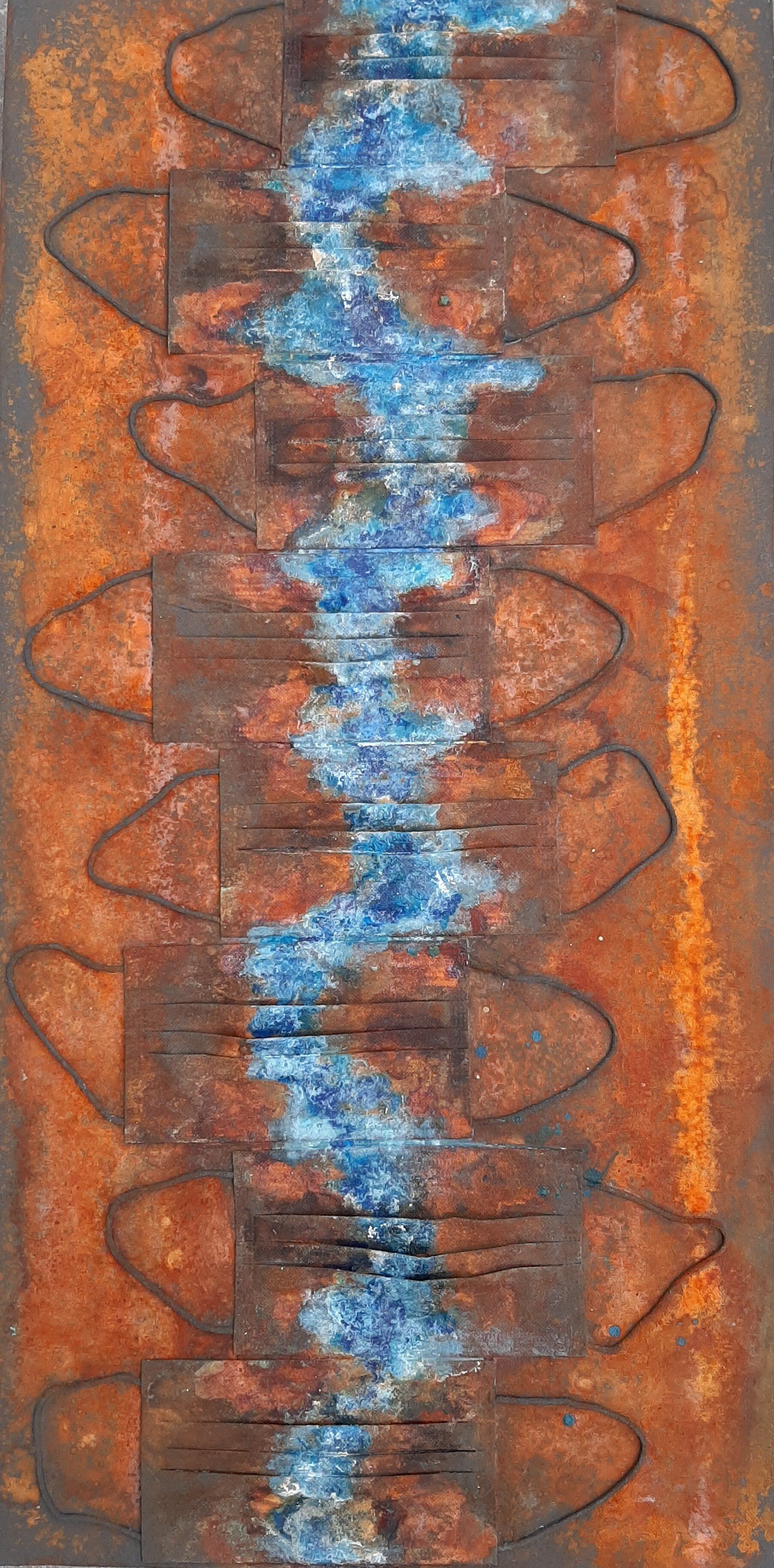 Karin Wexler, Blue - in memory of Covid 19, Rust, patina, mix media on canvas, 40x80cm - You don’t see any faces, no people - only masks, masks, masks and they shape our everyday life … you are alone …. you are lonley …. This inspired me during the Lockdown to this artwork.