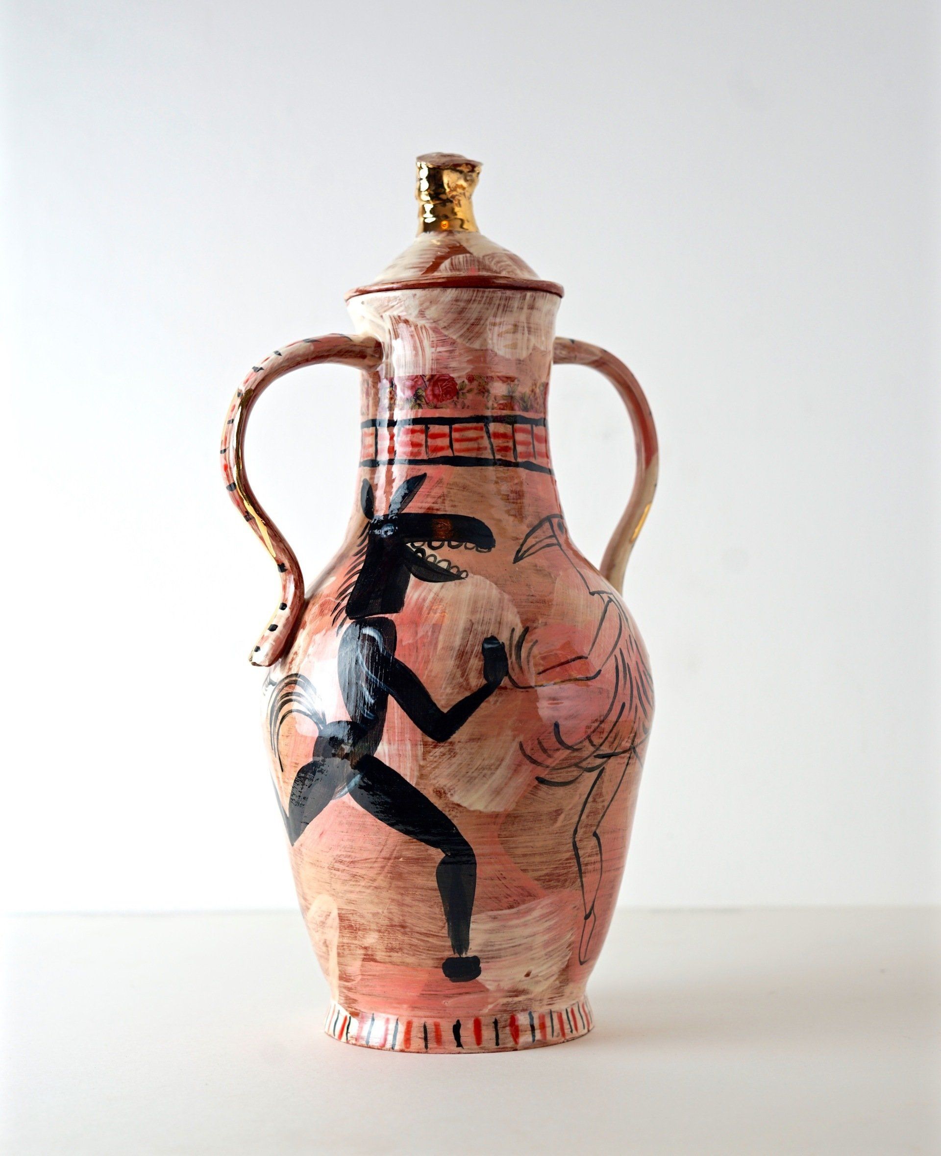 Fran Fell - During the lockdowns one of the things I miss most are the performing arts so I’ve created a series of pots illustrating imaginary ballets. This piece is called PAS DE DEUX. It is thrown with terracotta clay, slip painted, glazed and finally lustred.