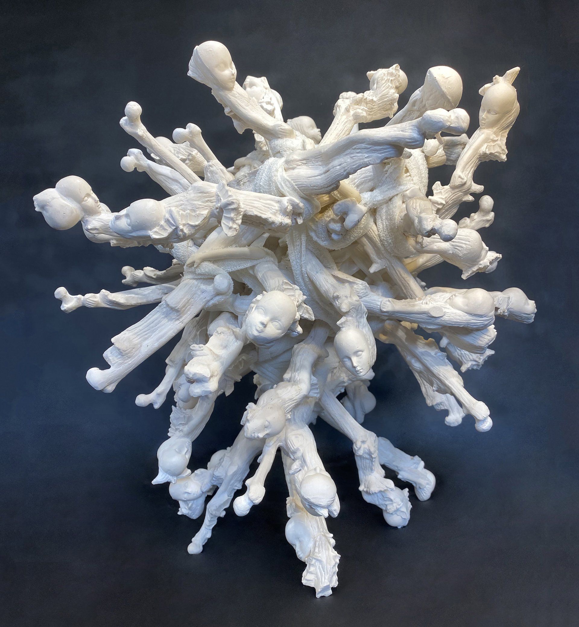 Sally de Courcy, Dream or Nightmare? - An autobiographical work of a shielded artist reflecting social isolation during lockdown, by using metaphorical objects that relate to the pandemic. Human femurs reference mortality and are combined with driftwood, both vestigial remains. Driftwood is symbolic of feeling beached (stranded) and like the virus returns in waves. Surreal faces reflect the depersonalisation of isolation, the arms the inability to embrace, and bats the vector of COVID invade the sculpture. Bound by bandages, it alludes to Florence Nightingale and the NHS. Although decorative, it reveals the darker aspects of the pandemic, creating dissonance. The sum becomes a surreal optical puzzle, oscillating between dream and nightmare.