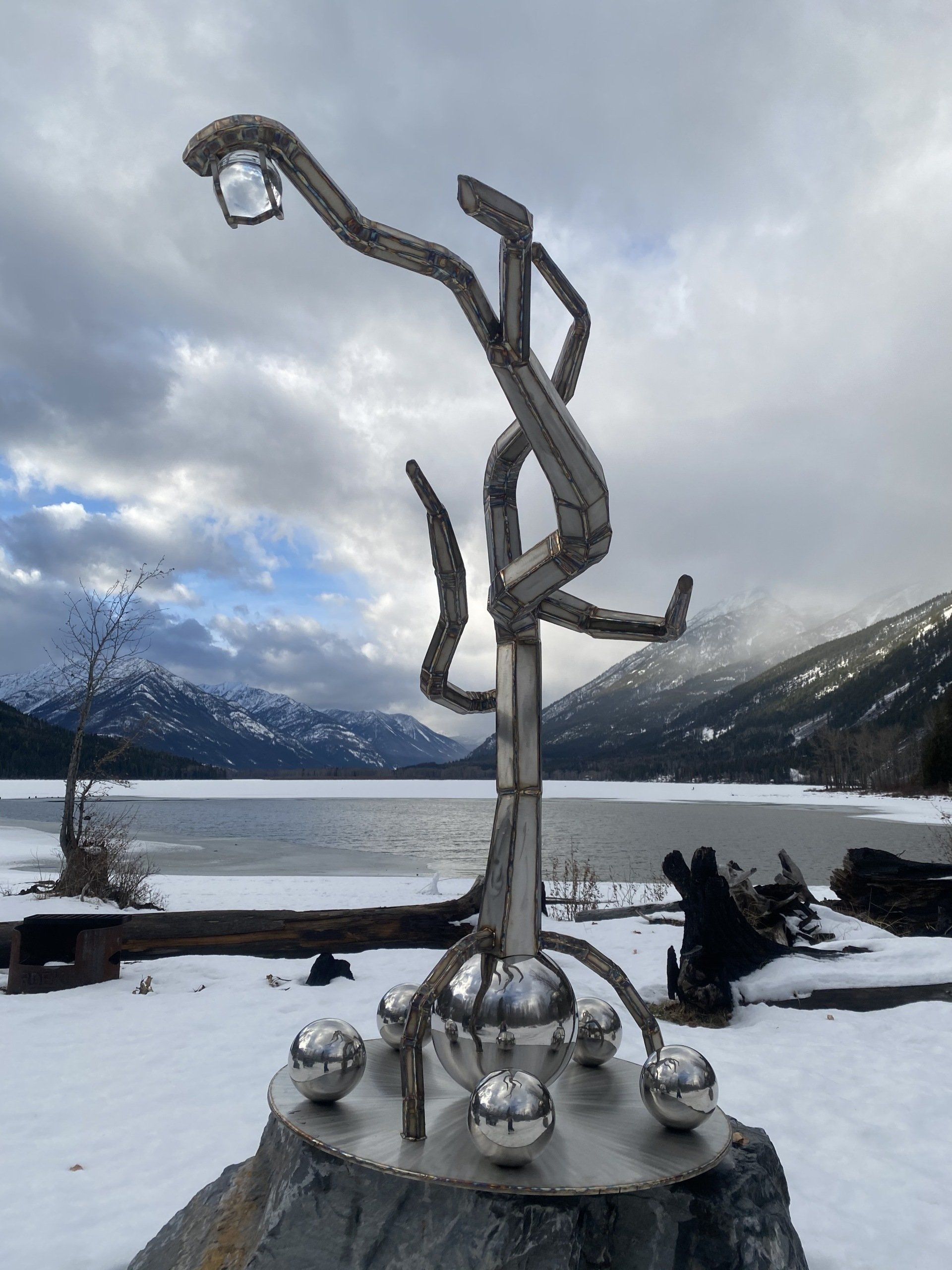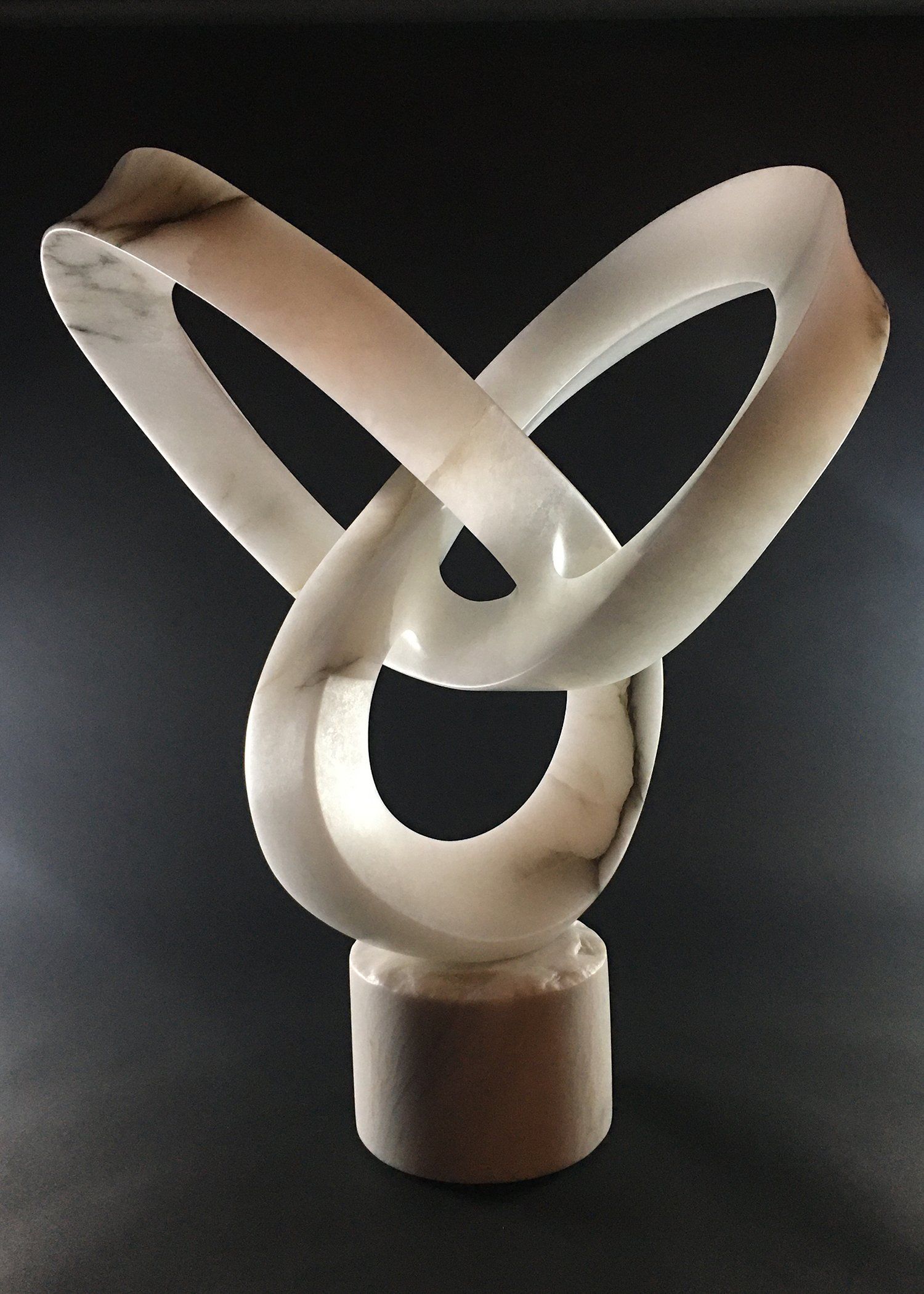 T Barny, VALKYRE - ‘Norse Maiden Warrior’, VALKYRE is a sculpture in one of my trademark trefoil mobius designs. I carved this piece from a 1,300-pound boulder that had a core channel all the way through it. VALKYRE has the arms attached at places where the lines of the knot cross. This allowed me to create a more delicate sculpture from the block of Italian ‘Volterra” Alabaster.