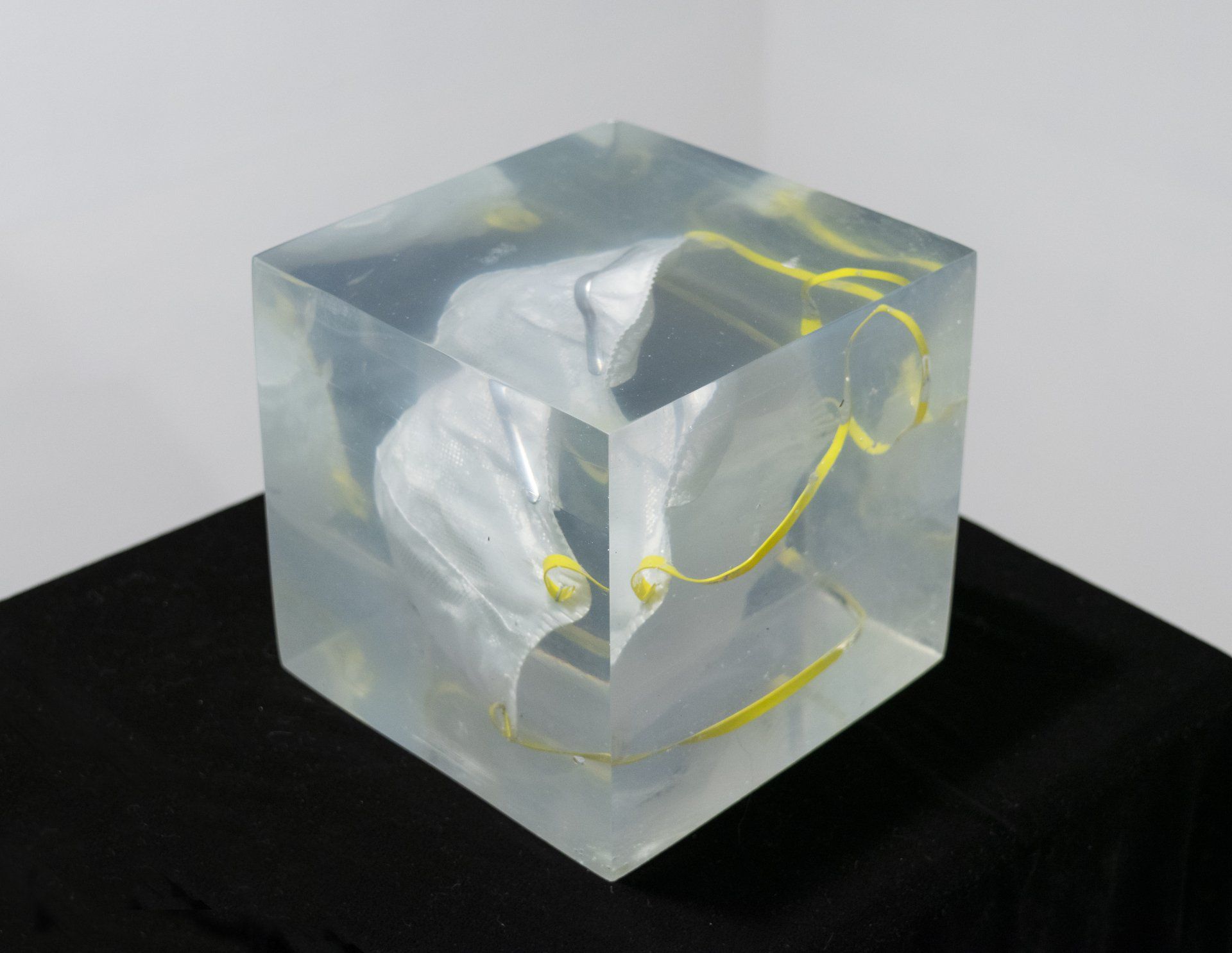 Michelle L Herman, Untitled - I began this piece at the beginning of lockdown in the US when N95 masks were scarce. This mask was one I already had in my studio and used when sanding, etc, so I decided to embed it in resin as I felt the mask object had been transformed into a symbol overnight.