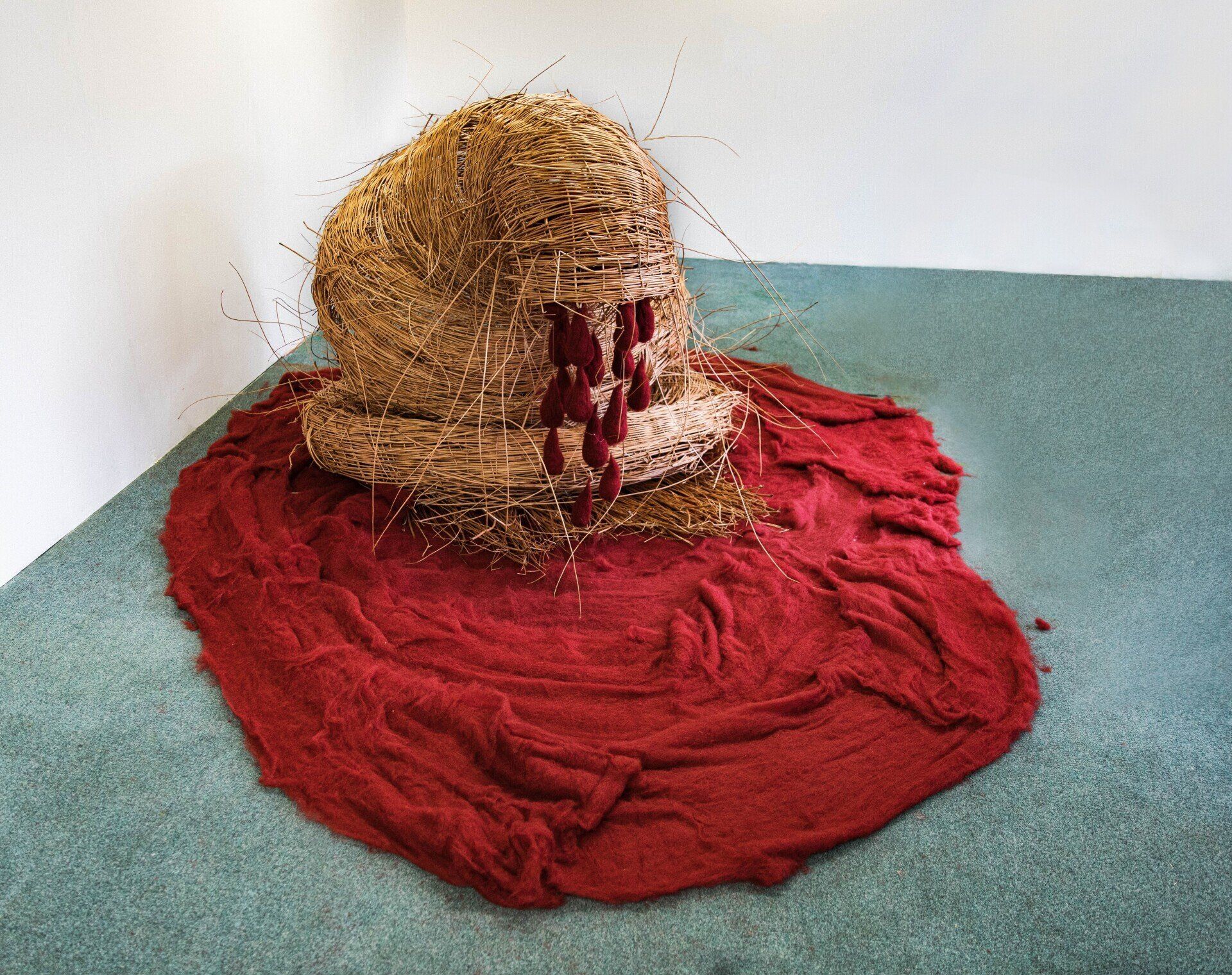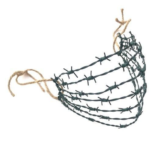 Penelope Burnett, Af/In/Con FLICT - I created this piece after the first Lockdown March/April 2020. The concept popped into my head one day and I just felt compelled to make it. I’ve always been drawn to barbed wire fences in amongst the countryside. Man-made boundaries against the backdrop of nature. Do they signify protection or danger? Who’s to say which side of the fence is protection and which side is danger? Are they to keep us in or to keep us out? These questions, which have always been in my mind, seemed to parallel and become significant to the questions being raised and the situations arising during this pandemic, Covid-19. The new normal. Protect or deflect.
