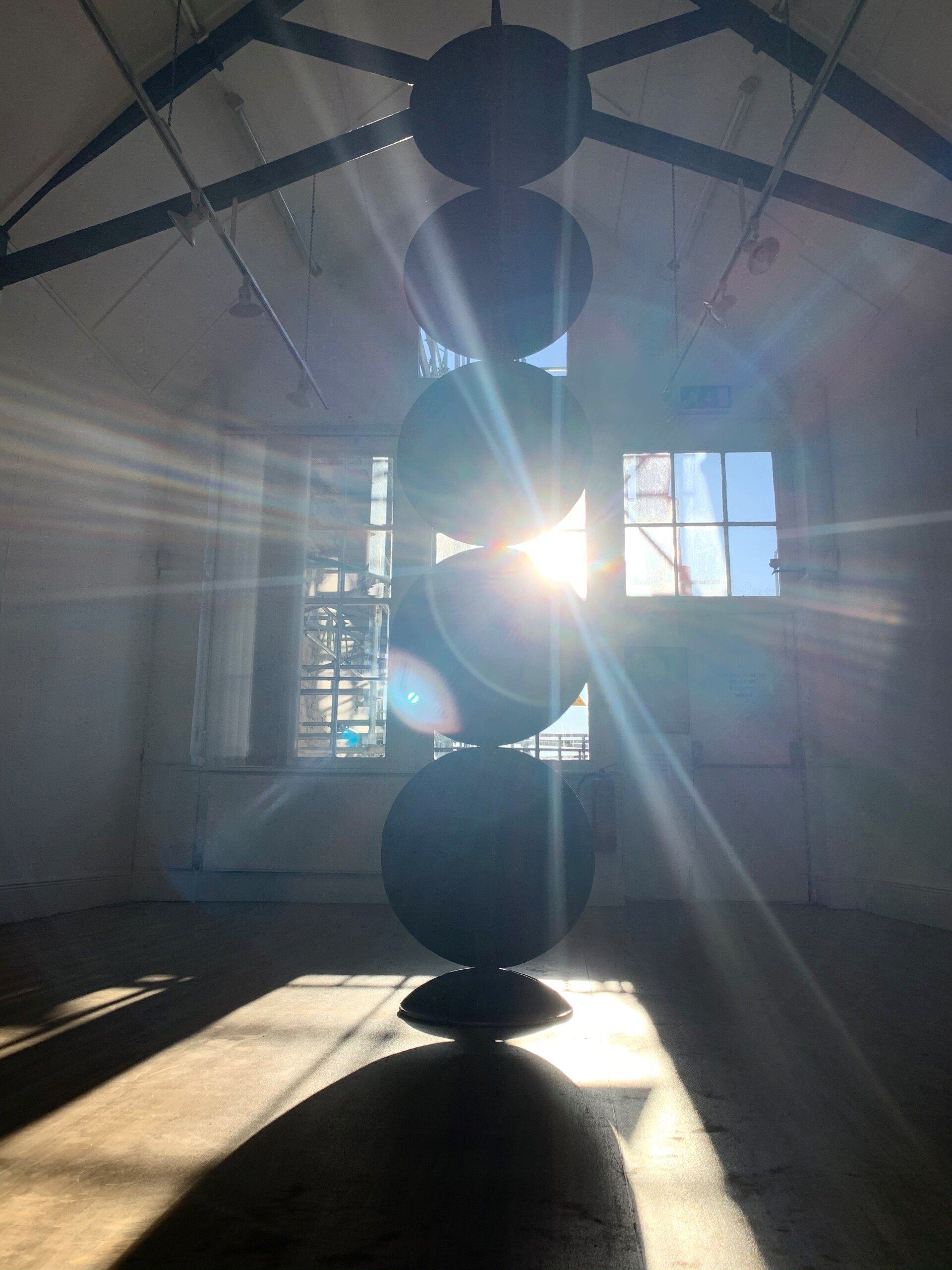 Jane Hindmarch, Resilience, 300cm x 60cm x 60cm 2020 Plywood, Steel and Matt Black 2.0 paint by Culture Hustle - “Resilience” appears to be a simple, abstract, geometric form but its construction of ascending orbs is also suggestive of the human figure. It represents both our response to lockdown and the danger of Covid 19. The rigid, upright form suggests the perseverance and emotional restraint experienced by the whole human population throughout the restrictions put in place during the pandemic. The repeated orbs suggest the many tough, repetitive days which required patience and endurance to get us through the imposed limitations on our freedom as a response to stop the spread of the Covid 19 virus. The matt black paint signifies the fear, death and suffering which the virus brought to so many elderly, vulnerable and disadvantaged people as well as economic and emotional hardship.