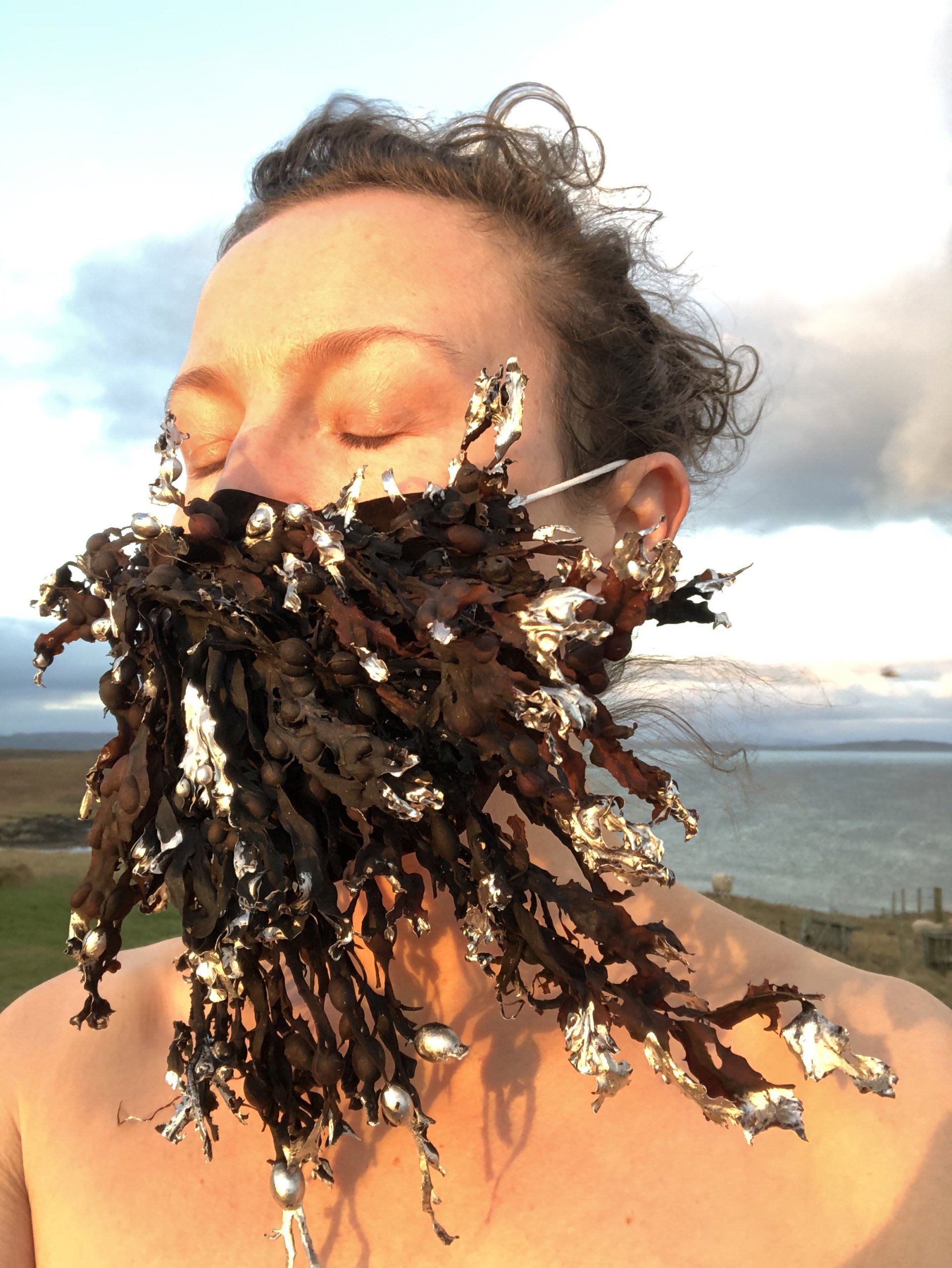 Roberta Fulford, Life mask: body sculpture of locally foraged & dried seaweed and silver - This photographic and body sculpture piece was created during Covid lockdown isolation on a small, remote island in the Shetland Islands, when the wild nature around me and the purity of the fresh sea air acted like a renewing life-force, which I absorbed and used to offset the fears and paranoia of the pandemic. I collected the seaweed from the local shore, dried it in the salty winds for weeks and created a face mask, adding silver details to add a fantastical, magical element. The photograph was taken at dawn one morning, when I stood naked before the rising sun and breathed in the morning’s pure air and the seaweed’s essence. Instagram - @robschmob