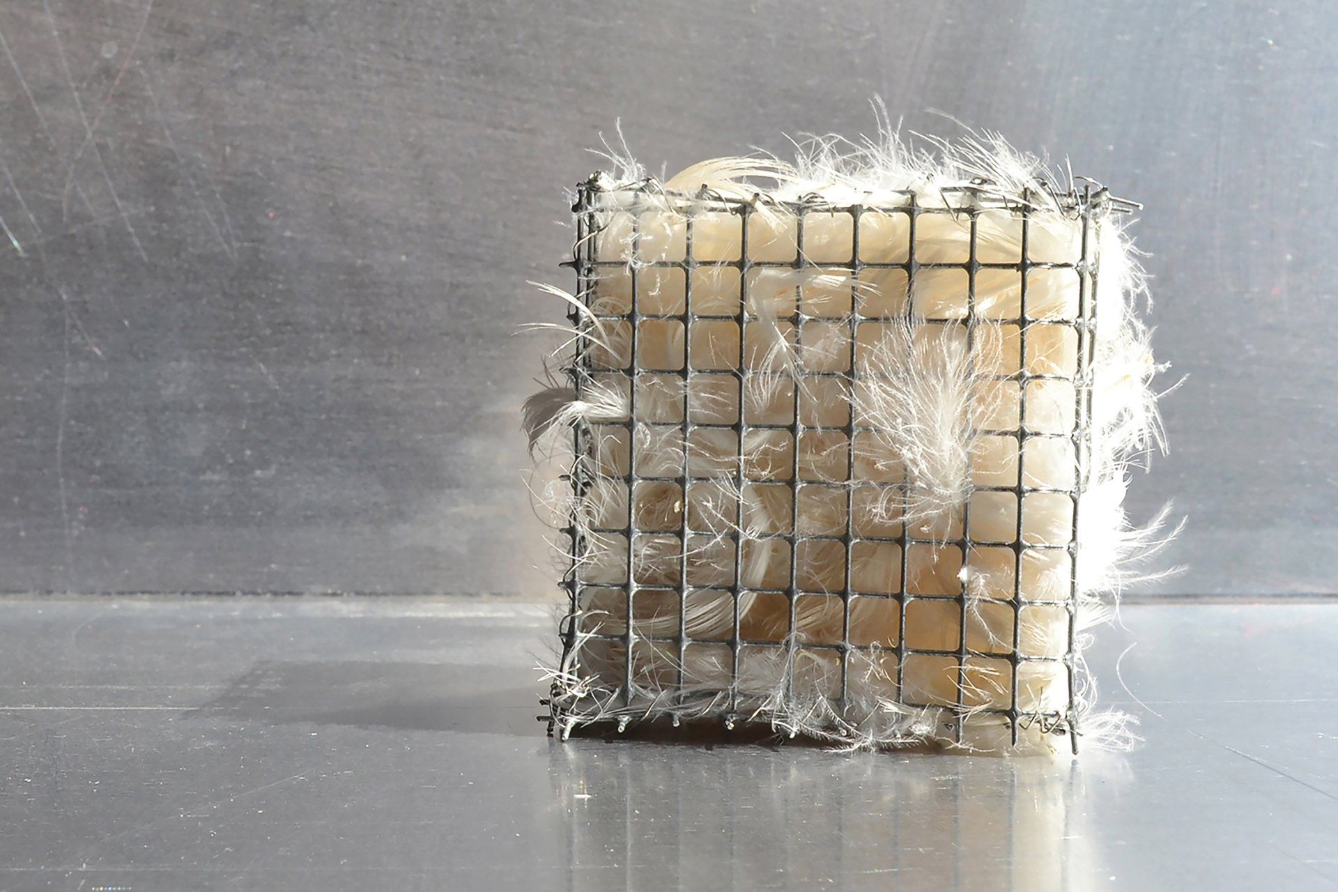 Sam Haynes, Containing the Uncontainable - This artwork was made during April 2020, at the beginning of lockdown, using materials I had previously collected, having worked as a public artist and arts facilitator for many years. I don’t usually have a theme in mind when creating an assemblage but the circumstances were so mind blowing that it was impossible not to be thinking of Covid. I like to combine contrasting found objects and materials to create a sense of balance and tension, with artworks referencing both domestic and architectural space. The gorgeous sunshine at the beginning of lockdown brought this small cube to life, the feathers reaching out as if rebelling against their confinement, with the seemingly impossible task of containment lying ahead of us all.