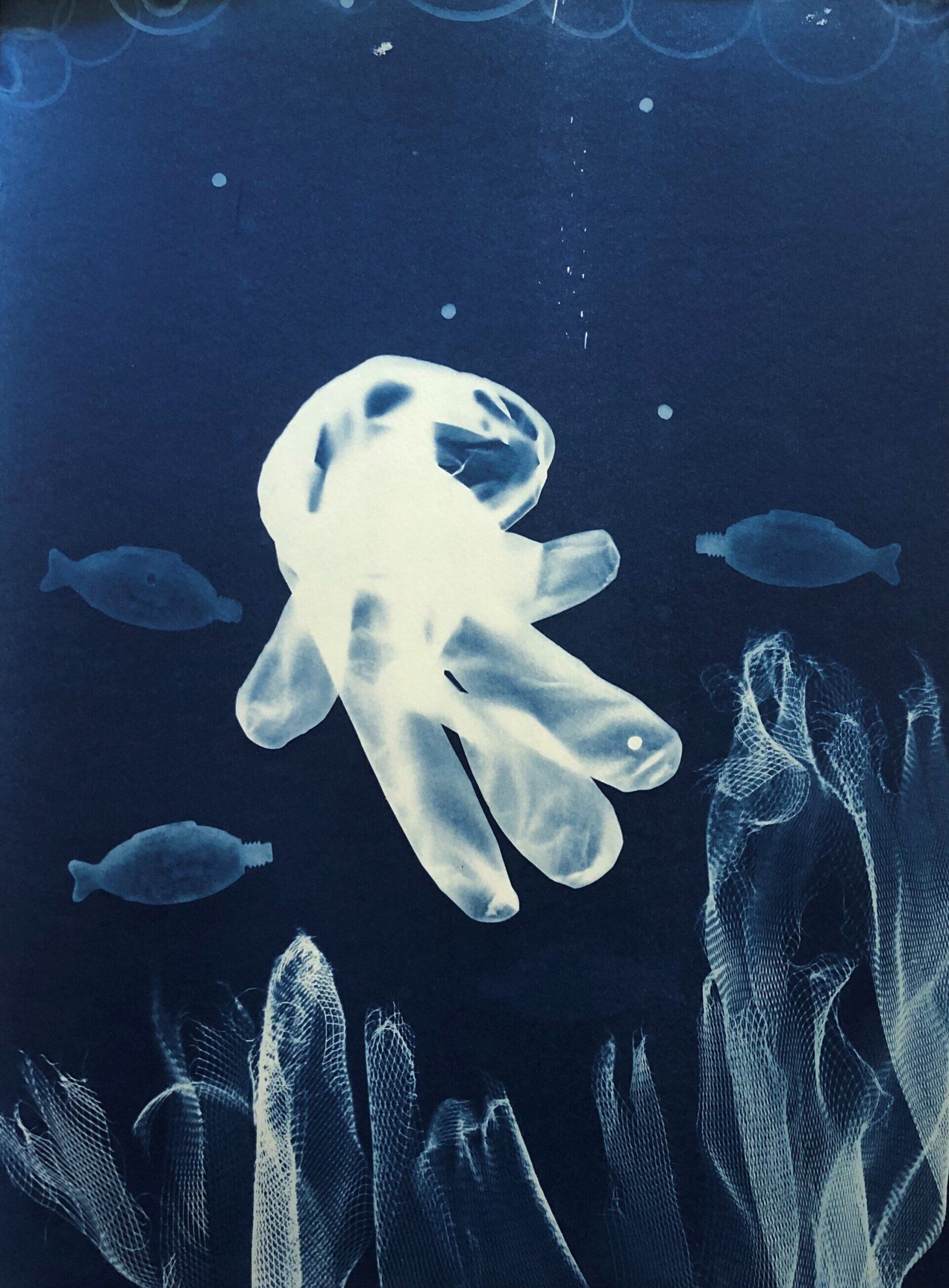 Cat Coulter, Did I Have a Hand In This? - The title of this piece is deliberately ambiguous. My work addresses the impact of plastic pollution on the environment. The ‘new normal’ of discarded PPE masks and gloves is adding hugely to the problem. It raises the question of what is acceptable in terms of our own individual behaviour in response to one global crisis, at the expense of exacerbating another in terms of the current threats to our natural environment and climate. Does just one glove in a sea of plastic matter?