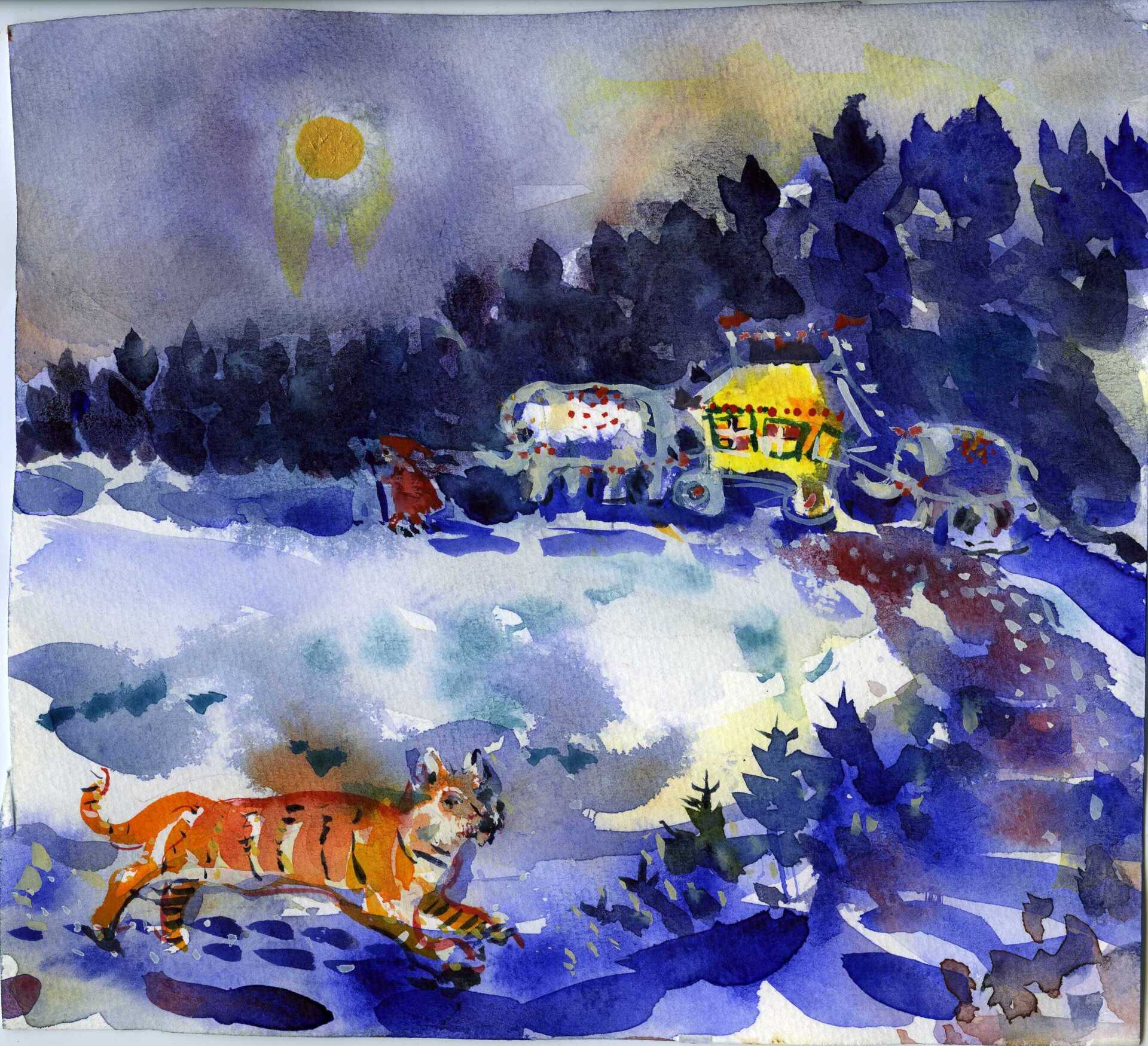 Karina Beeman, Winter Circus Caravan with a Tiger - The theme of a circus caravan, escaping something or maybe just trying to reach its destination, appeared in my paintings a few times during pandemic. Perhaps it is longing for some festivities, travel, a wondrous adventure. A dream that helps to look with hope into the future. A symbol of all worries that I wish will melt away, as long as my caravan is moving. Here I wanted to paint a winter scene. Out of expectations of snow coming that week and worrisome pandemic news, somehow this tiger appeared. Is he a part of that little circus caravan... or is he rushing to get them with sinister intent? I do not know. Instagram @karinabee_art